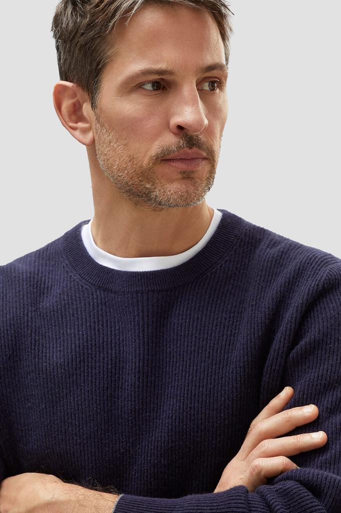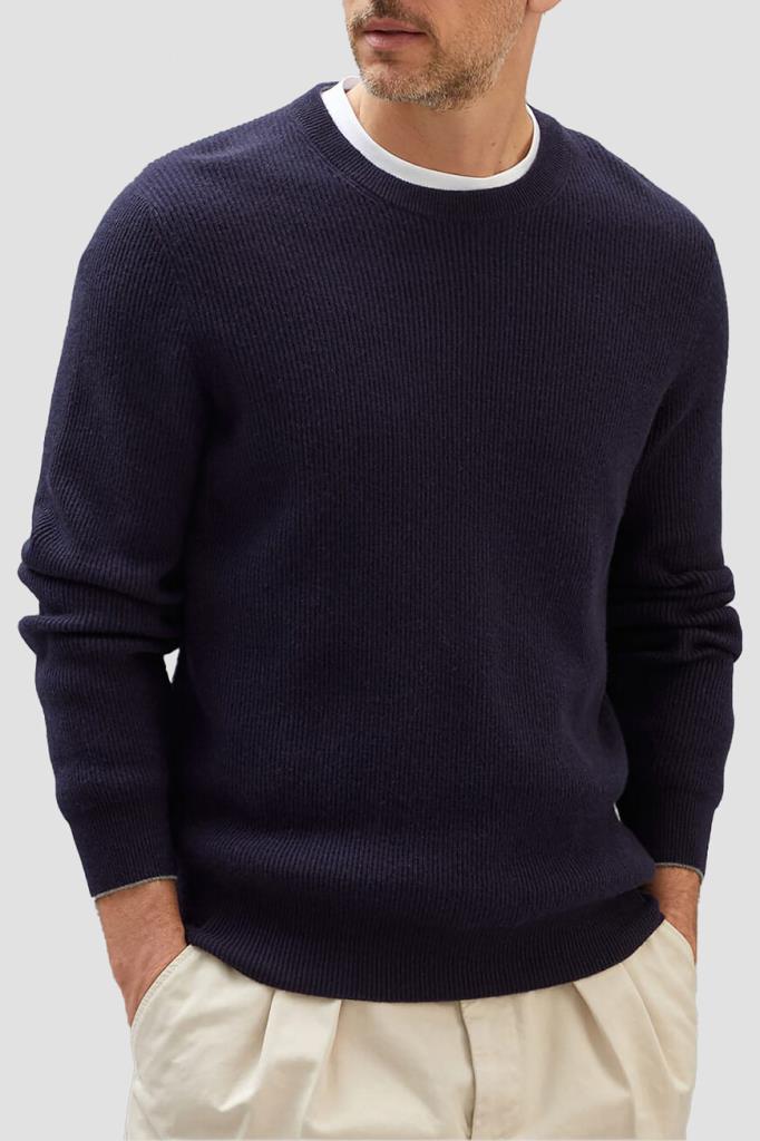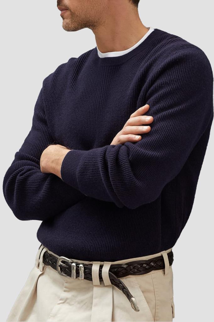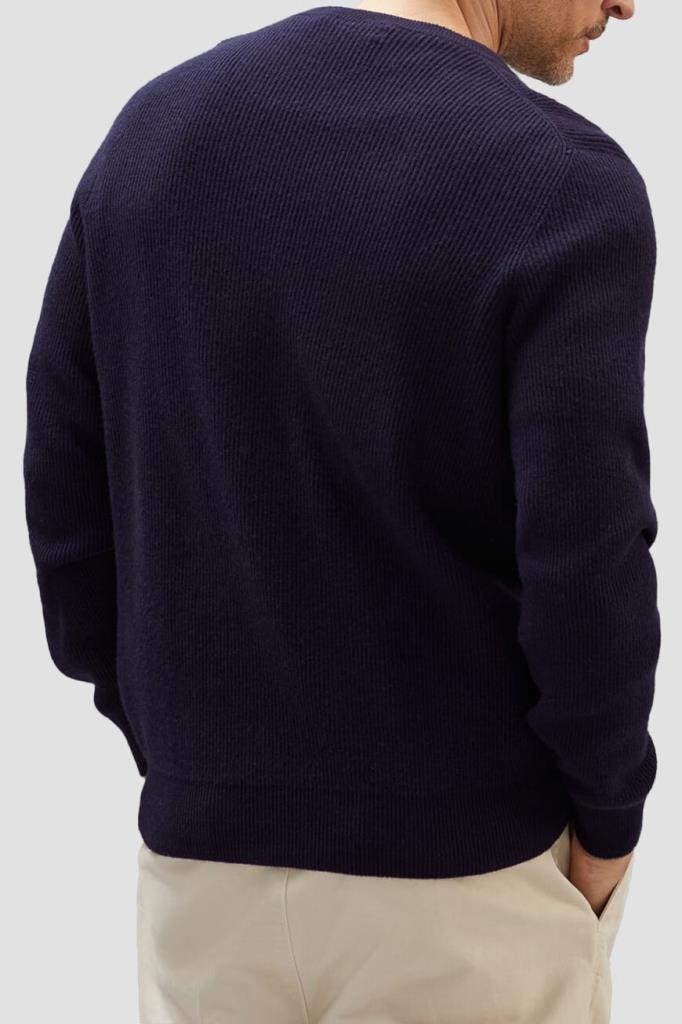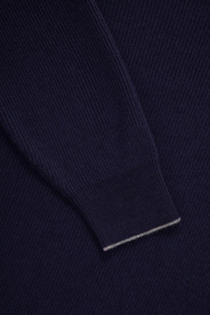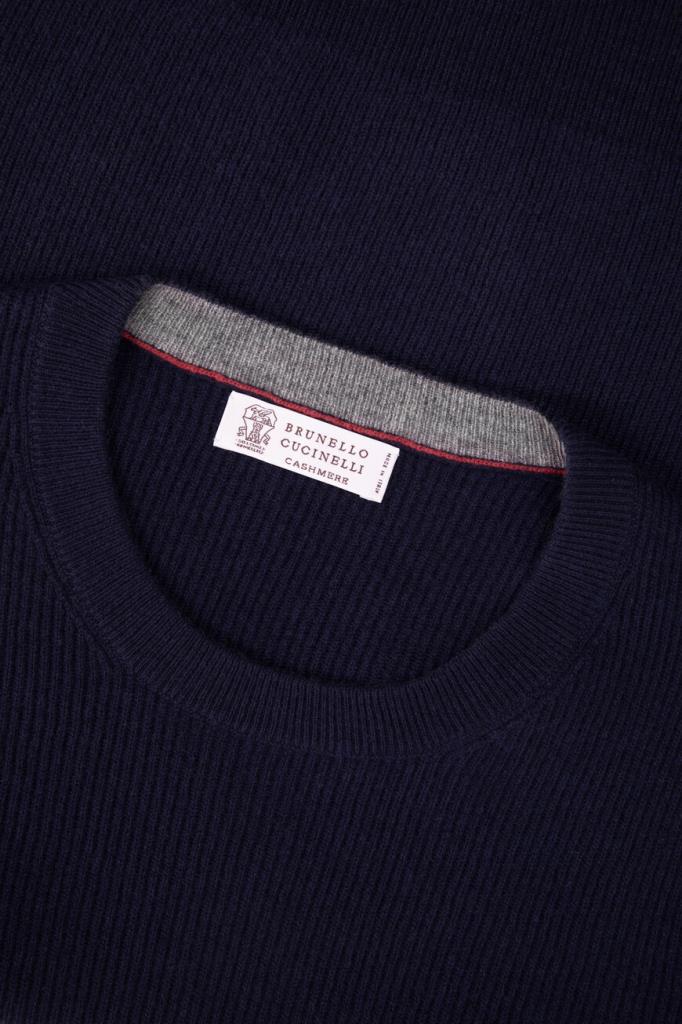 Тёмно-синий свитер BRUNELLO CUCINELLI выполнен из мягкого кашемира. Тонкое кашемировое волокно обеспечивает надёжную защиту от холода. Мягкость натуральной пряжи придаёт дополнительные достоинства традиционной текстуре в английскую резинку, а светло-серая кромка на манжетах представляет собой фирменную деталь Brunello Cucinelli.