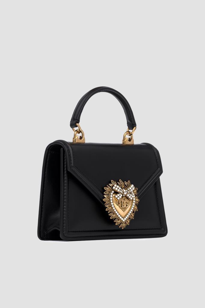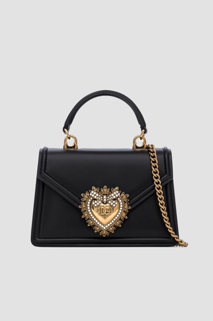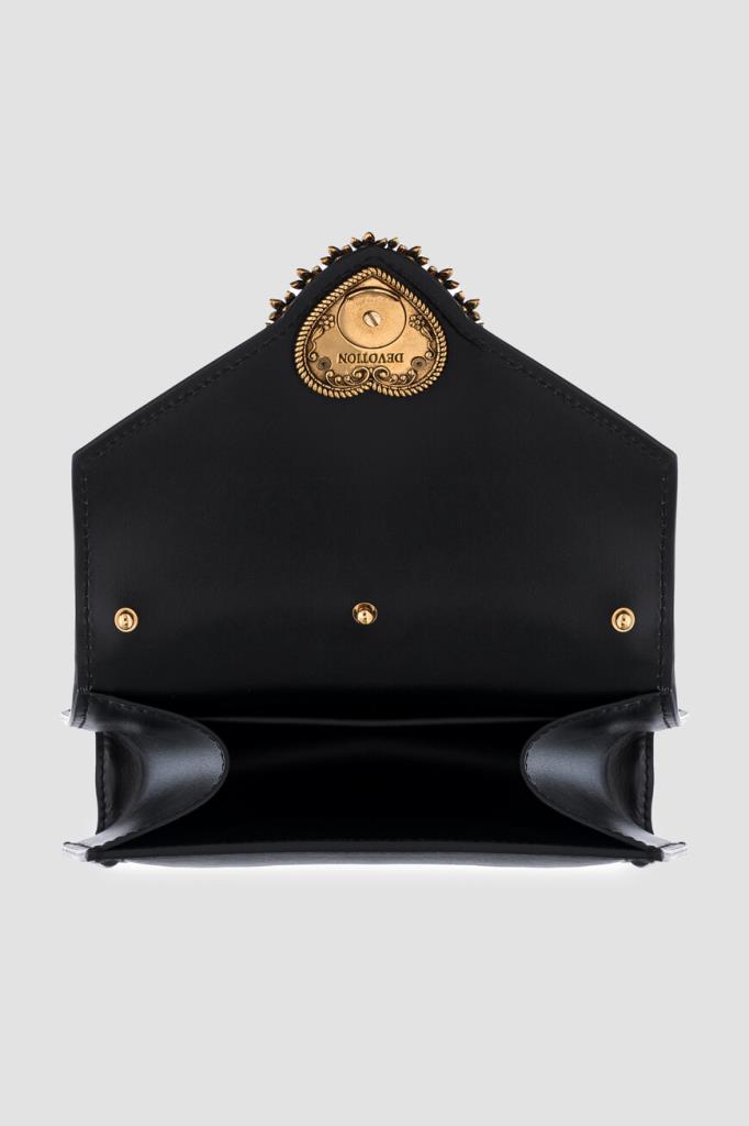 Миниатюрная сумка Devotion из гладкой кожи телёнка от Dolce & Gabbana. Изделие выполнено в чёрном базовом цвете и оснащено откидным клапаном на магнитной застёжке с декоративным элементом в форме сердца. Модель воплощает в себе любовь к искусному мастерству и тщательную проработку деталей.
