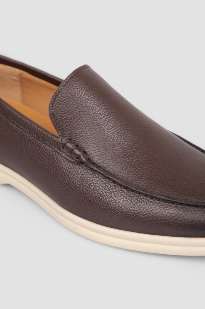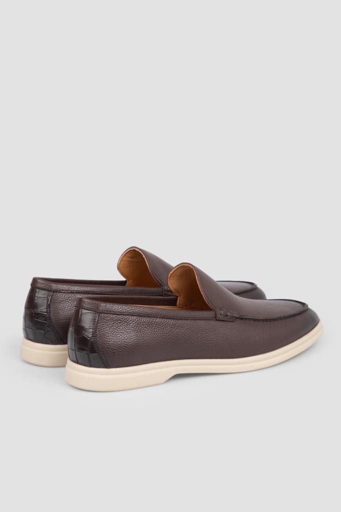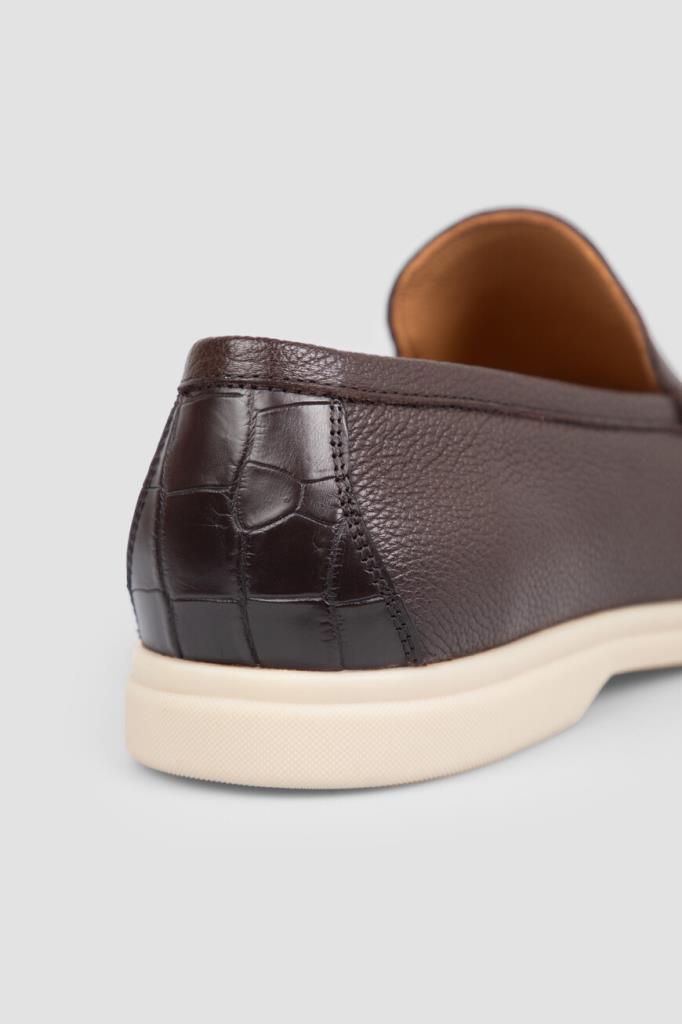 Классические лоферы FARGONI получились максимально комфортными. Удобство обеспечивает как гибкая конструкция, не стесняющая движения стопы, так и материал. Модель изготовлена из мягкой кожи телёнка тёмно-коричневого цвета с патиной. Особенностью повседневной пары стала вставка из фактурной кожи крокодила на заднике в тон.