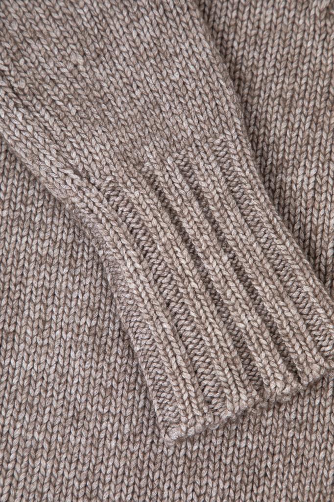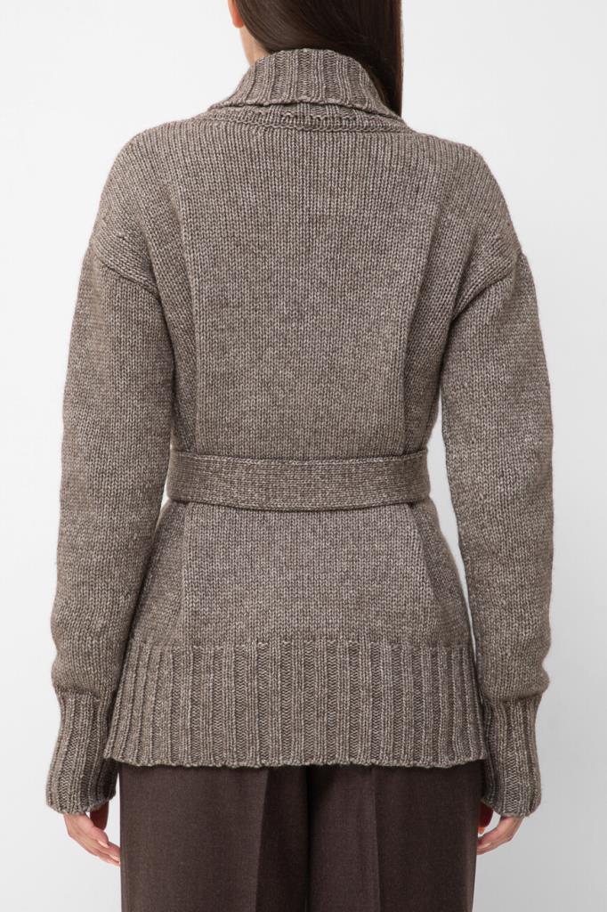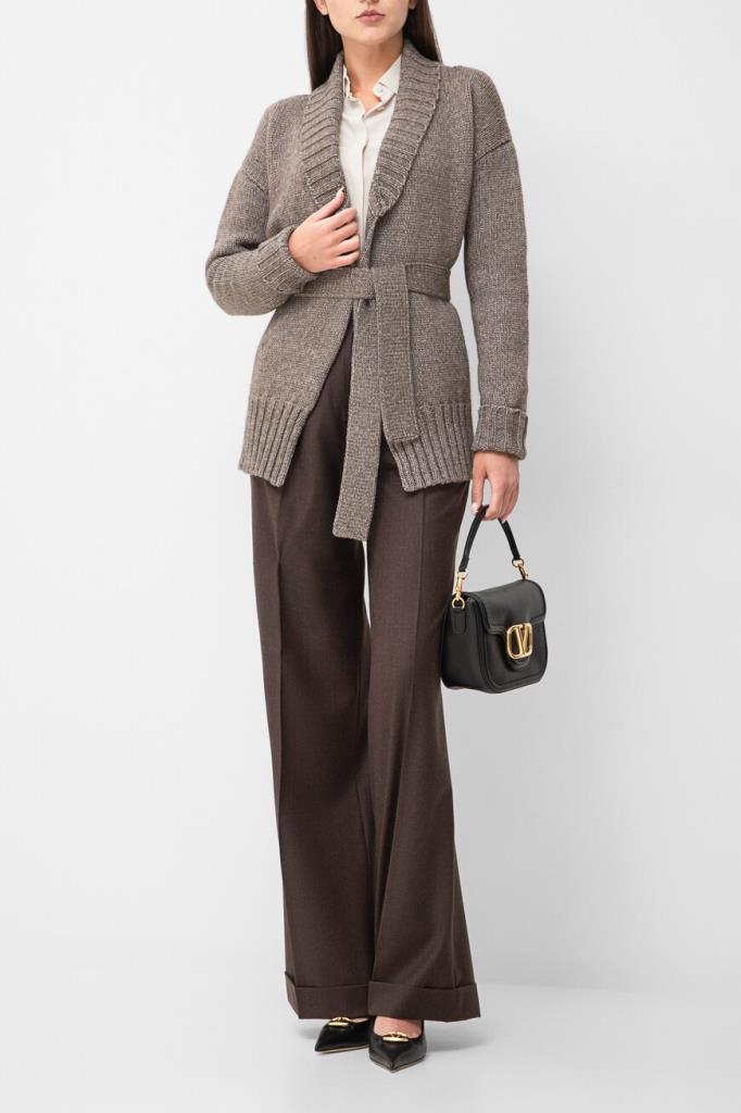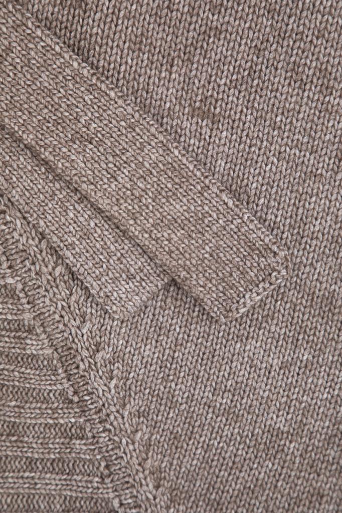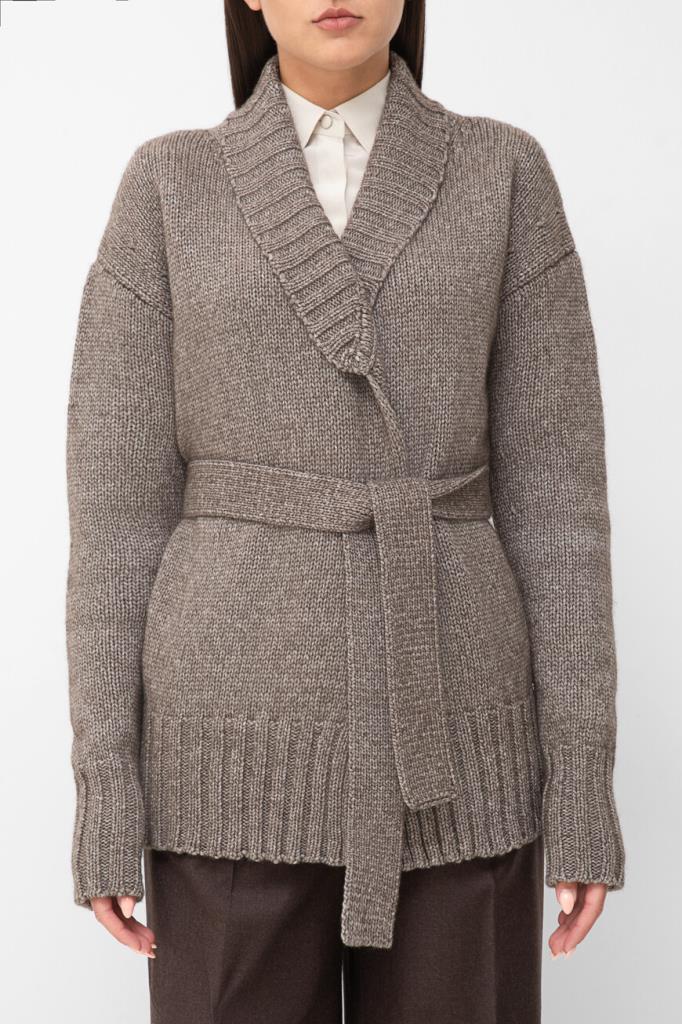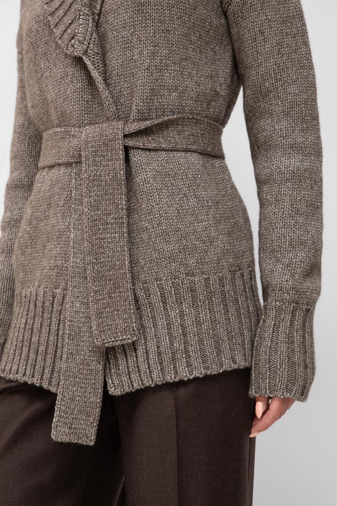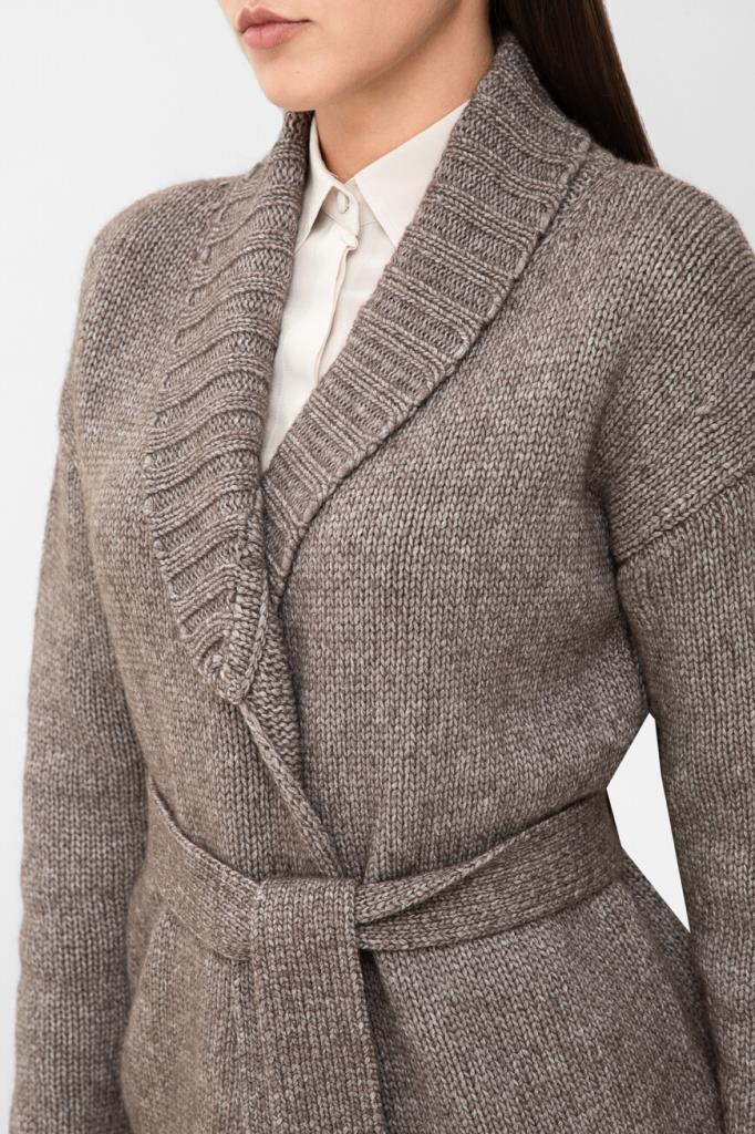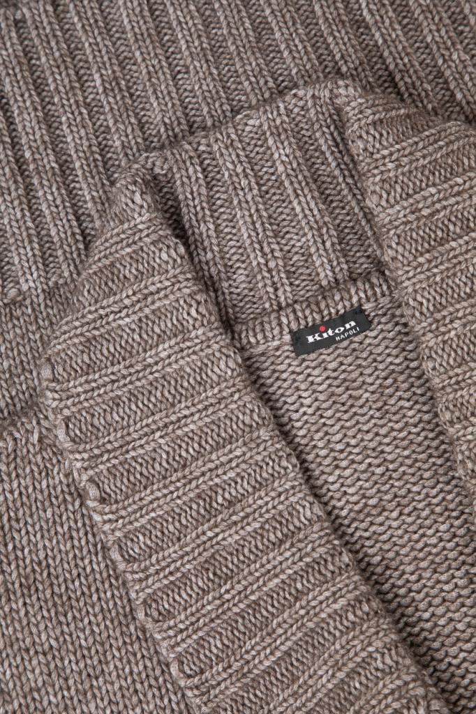 Коричневый кардиган Kiton чулочной вязки. Для создания модели прямого силуэта используется мягкий трикотаж на основе натуральной шерсти, хлопка и шерсти яка, гигроскопичной и эффективно сохраняющей тепло. Линию талии подчёркивает широкий пояс на завязках из того же материала в тон.