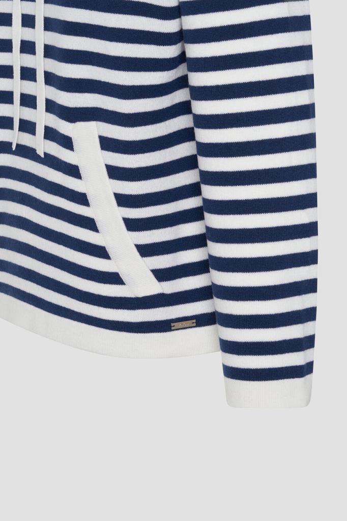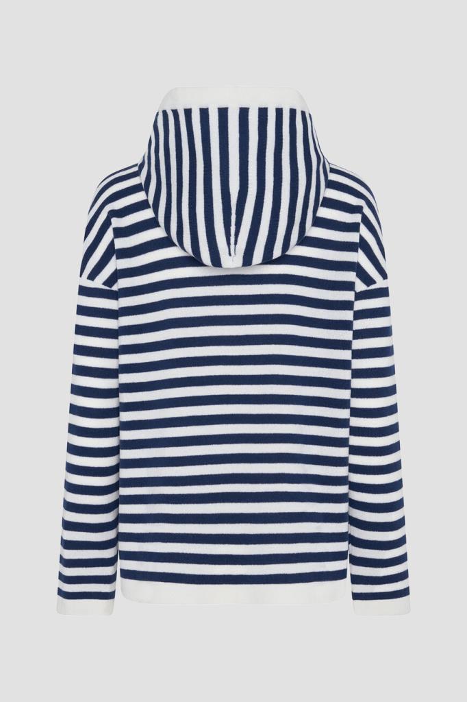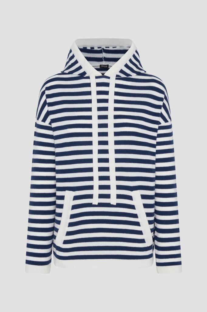Полосатое худи Kiton со спущенной линией плечевого шва. Для изготовления модели в белом и тёмно-синем тонах выбран мягкий кашемир. Глубокий капюшон на плоских завязках обеспечивает дополнительный комфорт и защиту от непогоды, в крупном кармане-кенгуру удобно хранить предметы первой необходимости. Изделие прямого силуэта станет основой образов в стиле casual.