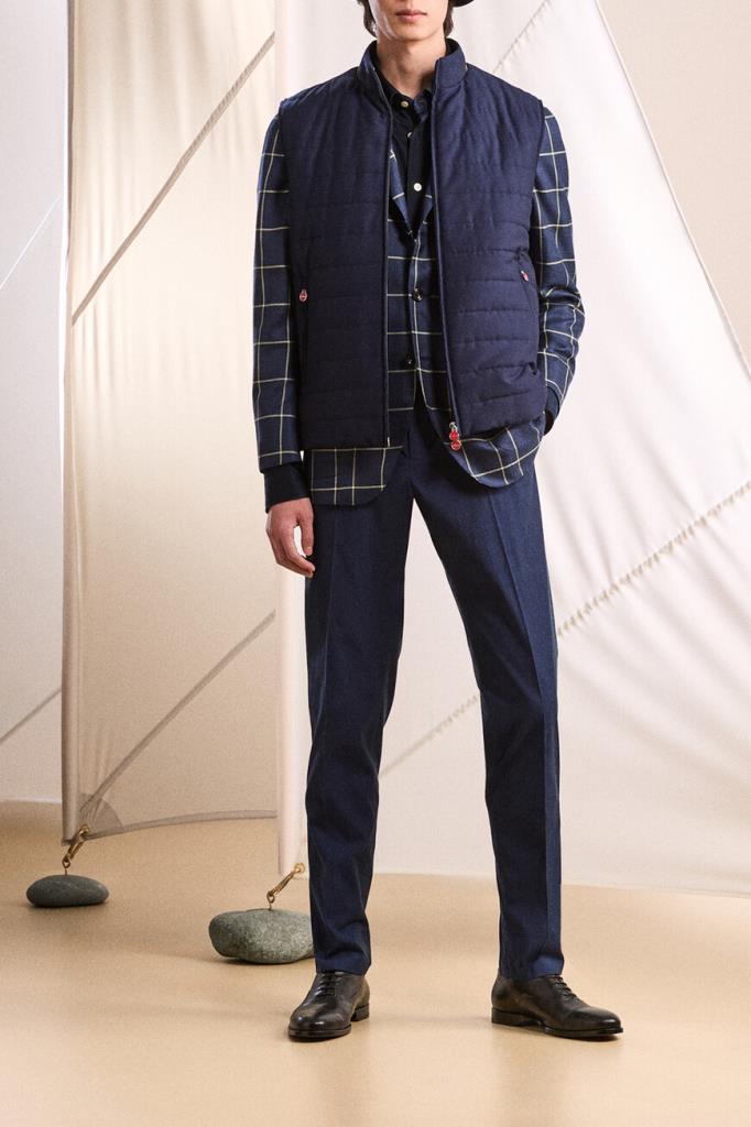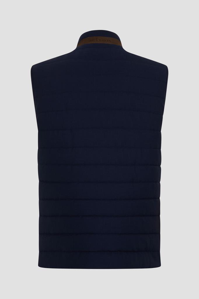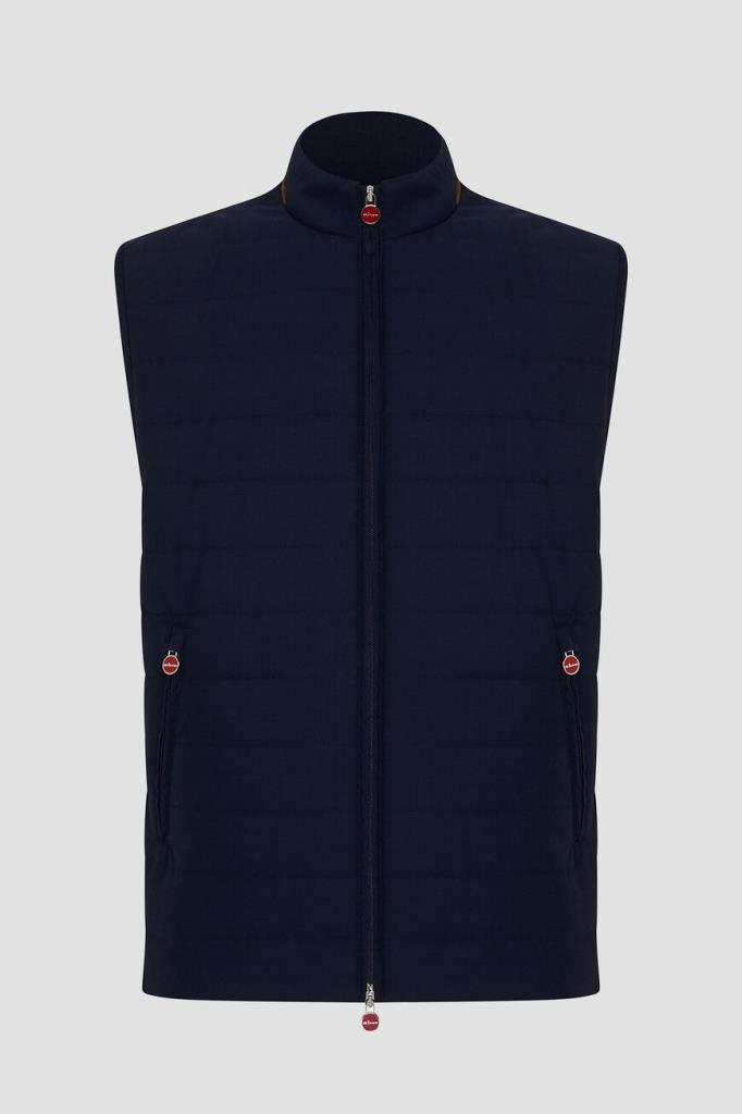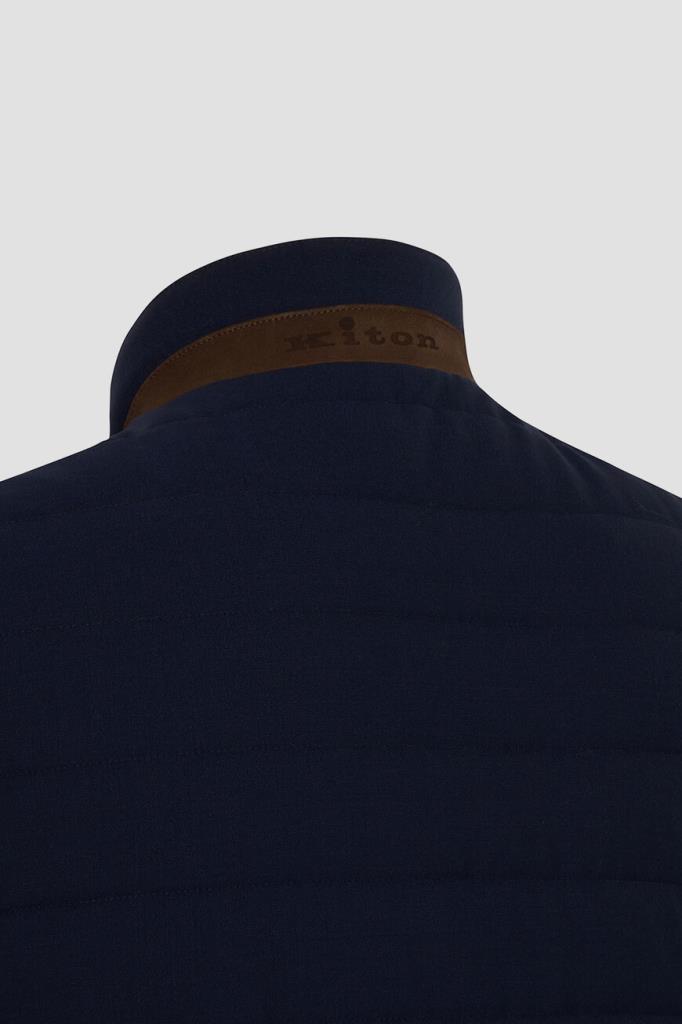 Стёганый жилет Kiton с двумя прорезными карманами на молнии по бокам. Изделие выполнено из флисовой шерсти, укреплённой прочным нейлоном, с добавлением стрейчевых волокон. Модель глубокого тёмно-синего цвета застёгивается на встречную молнию с двумя брендированными эмалированными пуллерами и отличается наличием неброского декора - замшевой вставки коричневого оттенка с крупным логотипом сзади на воротнике.