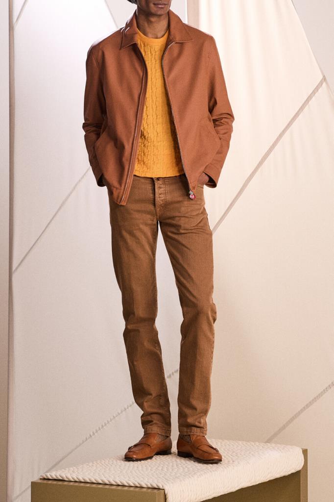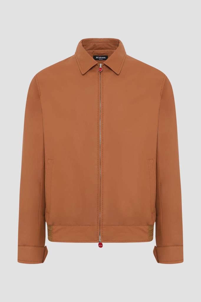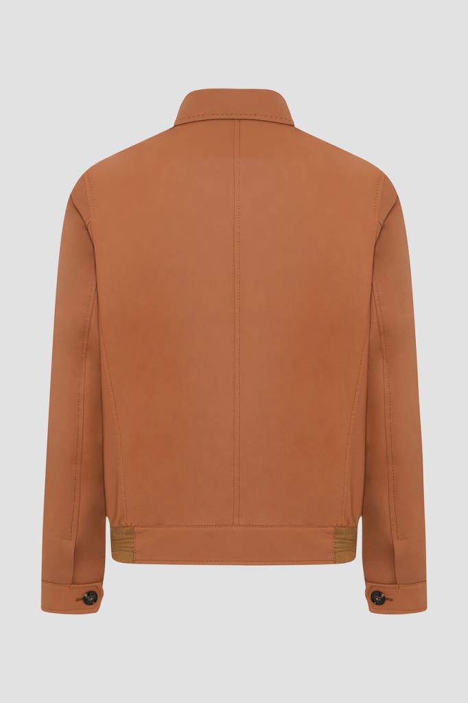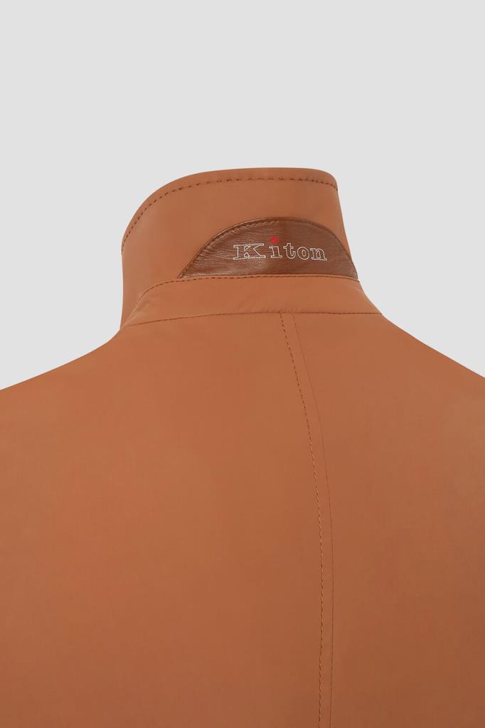 Блузон табачного оттенка от бренда Kiton. Для производства модели прямого силуэта используется мягкая кожа ягнёнка. Декором выступает коричневая вставка с крупным белым логотипом Дома, размещённая сзади на воротнике и видимая при его подъёме. Для более комфортной посадки изделия по фигуре предусмотрен широкий эластичный пояс с полосатым геометрическим мотивом в резинку.