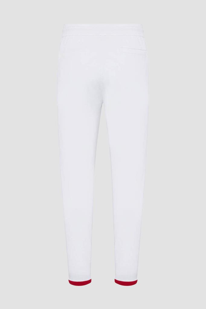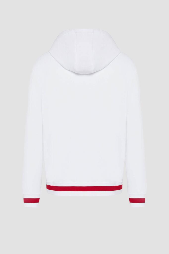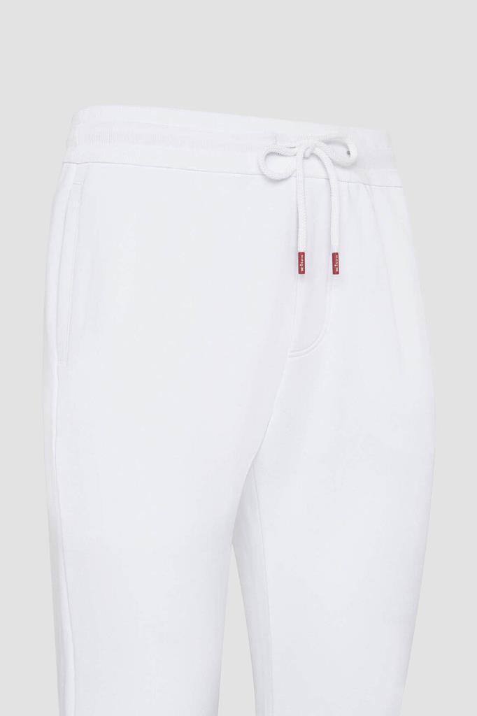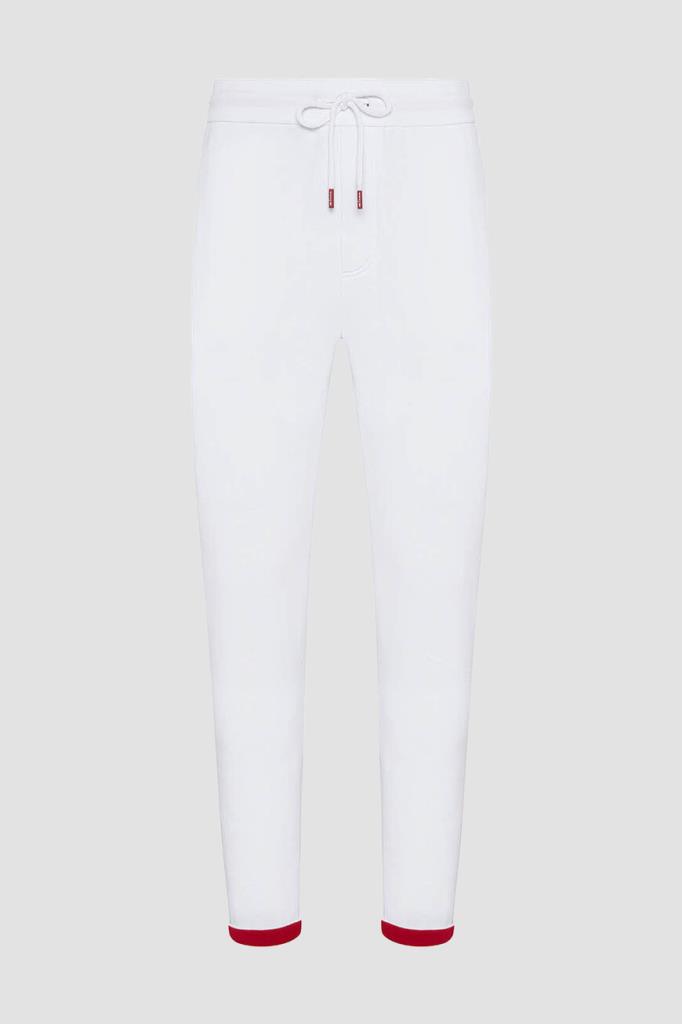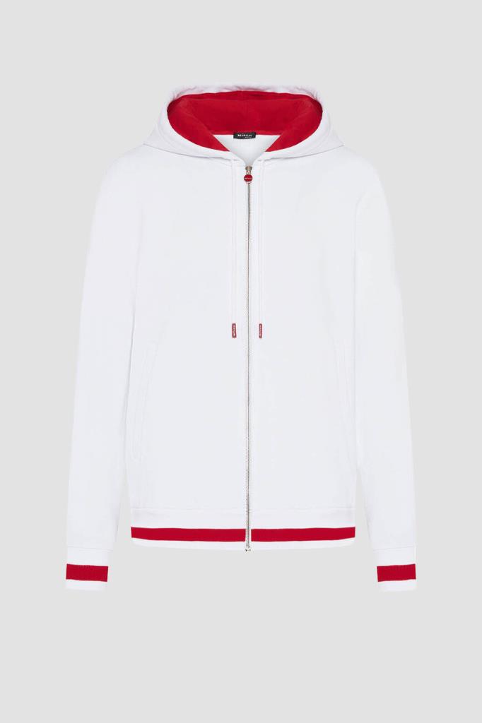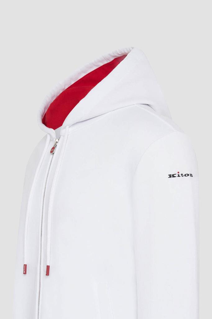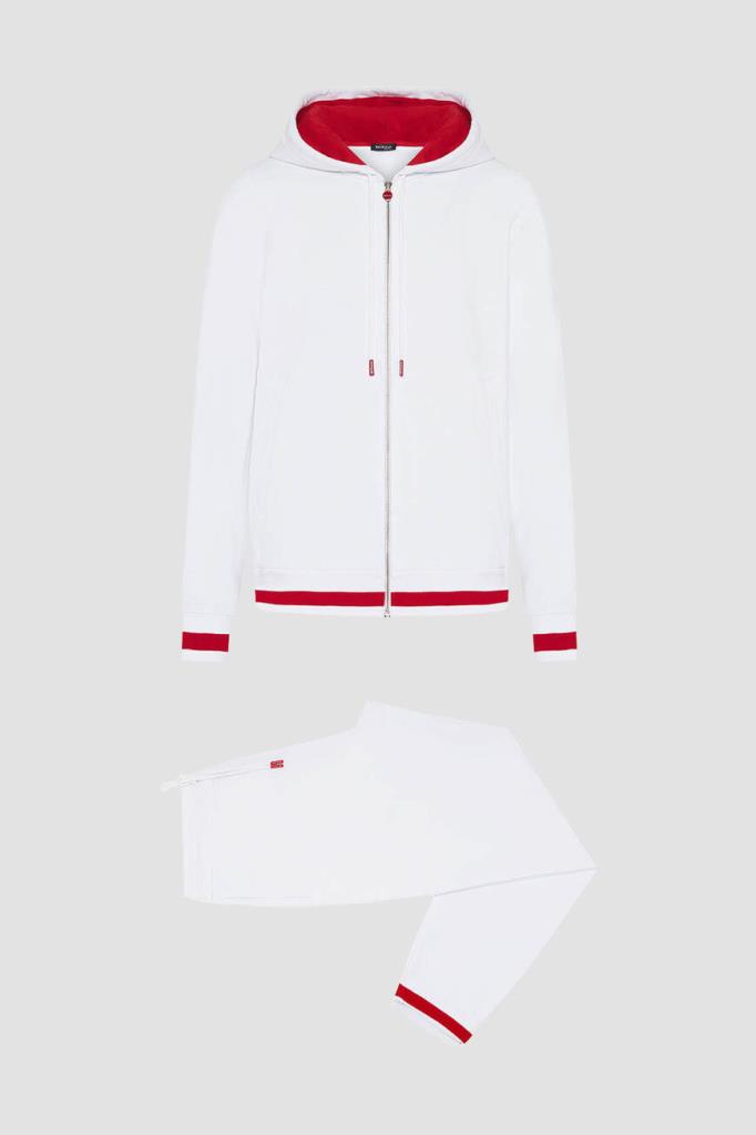 Спортивный хлопковый костюм от бренда Kiton. Куртка на серебристой молнии с эмалированным пуллером и брюки на кулиске выполнены в белом базовом оттенке. Декором выступают ярко-красные внутренняя сторона глубокого капюшона на завязках и полосы на манжетах рукавов, широком поясе и снизу на брючинах. Атрибутом Дома является вышитая контрастная надпись-логотип на левом рукаве.