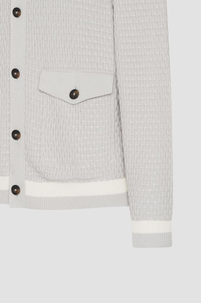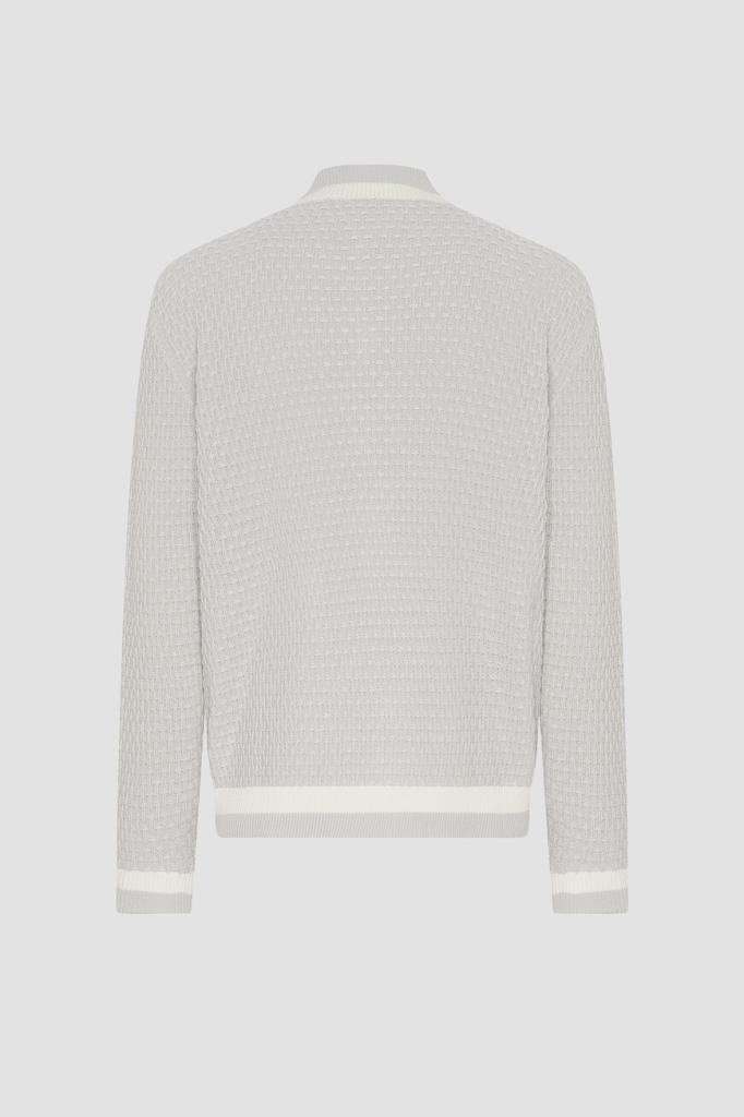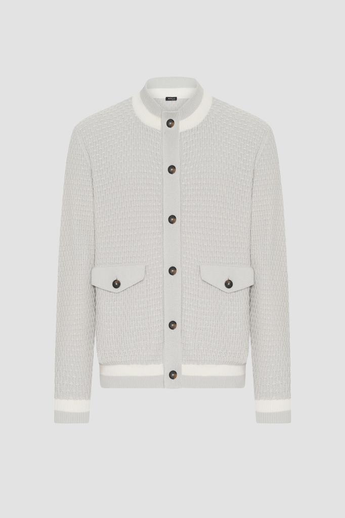 Жемчужный блузон Kiton на крупных роговых пуговицах. Поверхность повседневной модели из мягкого хлопкового трикотажа покрыта вязаным геометрическим узором в тон. Фасон изделия предполагает прямой силуэт и наличие двух крупных накладных карманов с клапанами на пуговице по бокам. Отличительными деталями являются белые полосы на воротнике-стойке, манжетах рукавов и широком поясе.