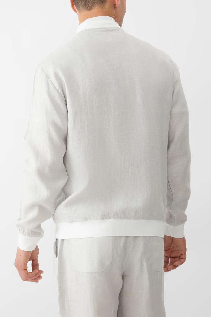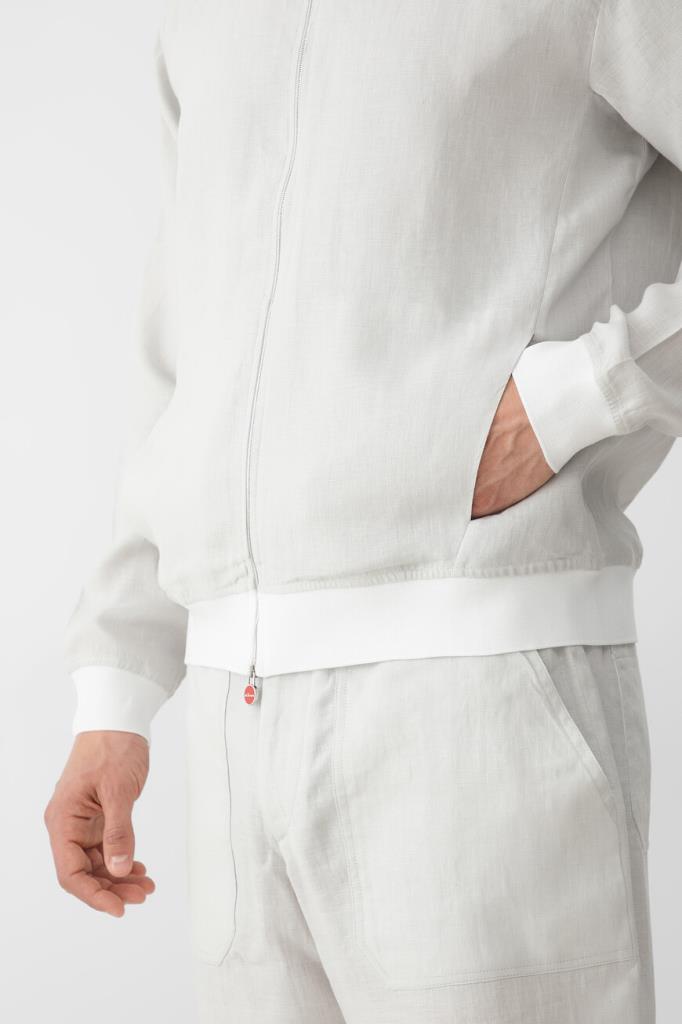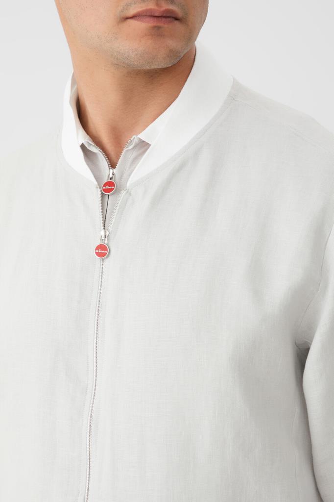 Бомбер Kiton светло-серого оттенка с белыми полосами-декором. Для производства изделия прямого силуэта выбран лёгкий мягкий лён. Трикотажные воротник-стойка, манжеты рукавов и широкий пояс дополнены резинкой, а модель оснащена застёжкой на встречную молнию с двумя брендированными эмалированными пуллерами. Бомбер будет смотреться выигрышно в тандеме с поло с неброской знаковой символикой Дома и брюками в спортивном стиле из той же коллекции.