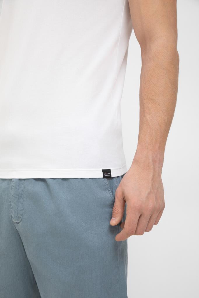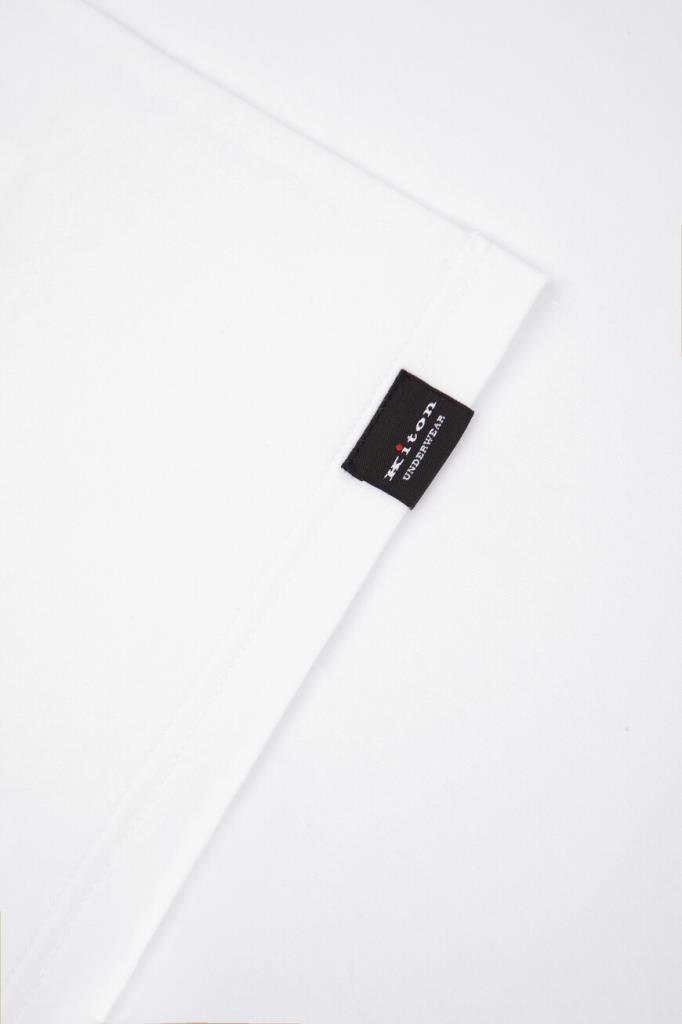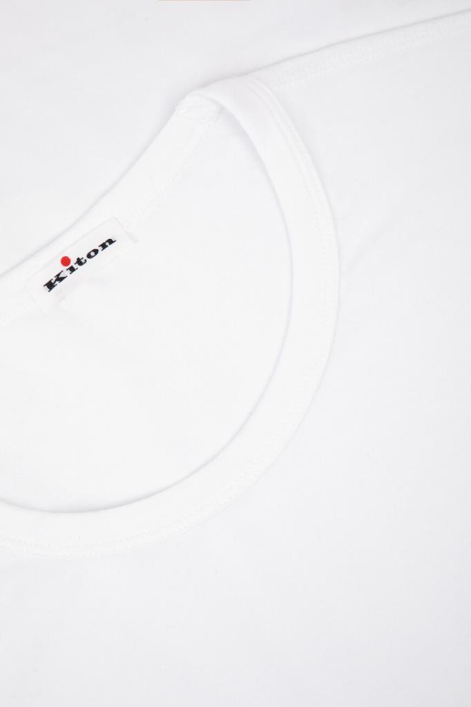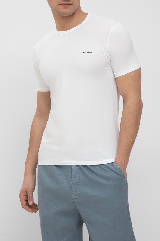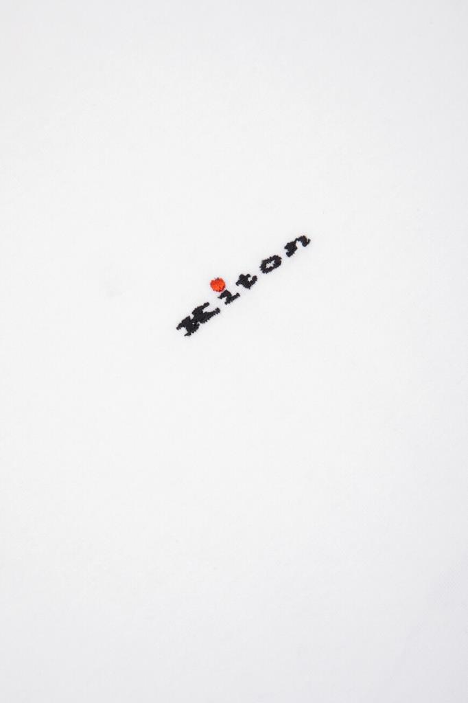 Белая футболка прямого силуэта от бренда Kiton. Для создания модели используется стрейчевое хлопковое джерси с гладкой текстурой. Сложный процесс создания каждого изделия включает более двадцати операций, большая часть которых выполняется вручную. Футболка с круглым вырезом горловины на резинке украшена спереди вышитым контрастным логотипом. Модель станет удобной базой для создания повседневных комплектов.