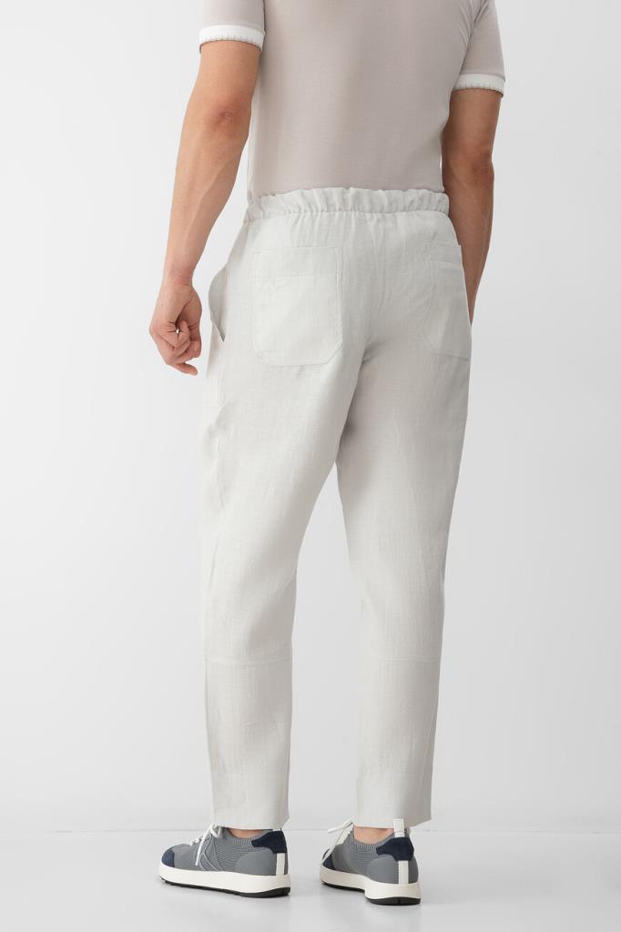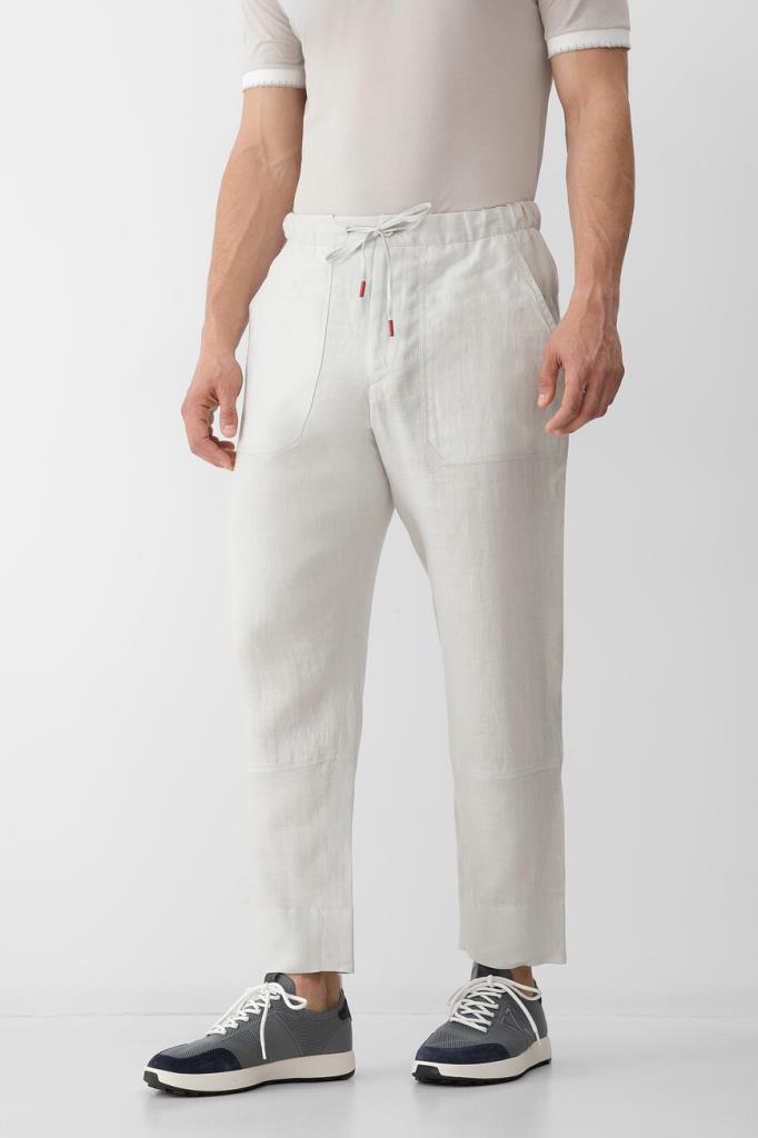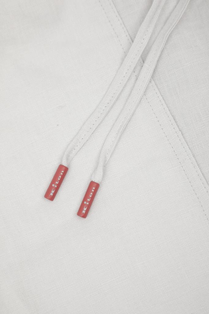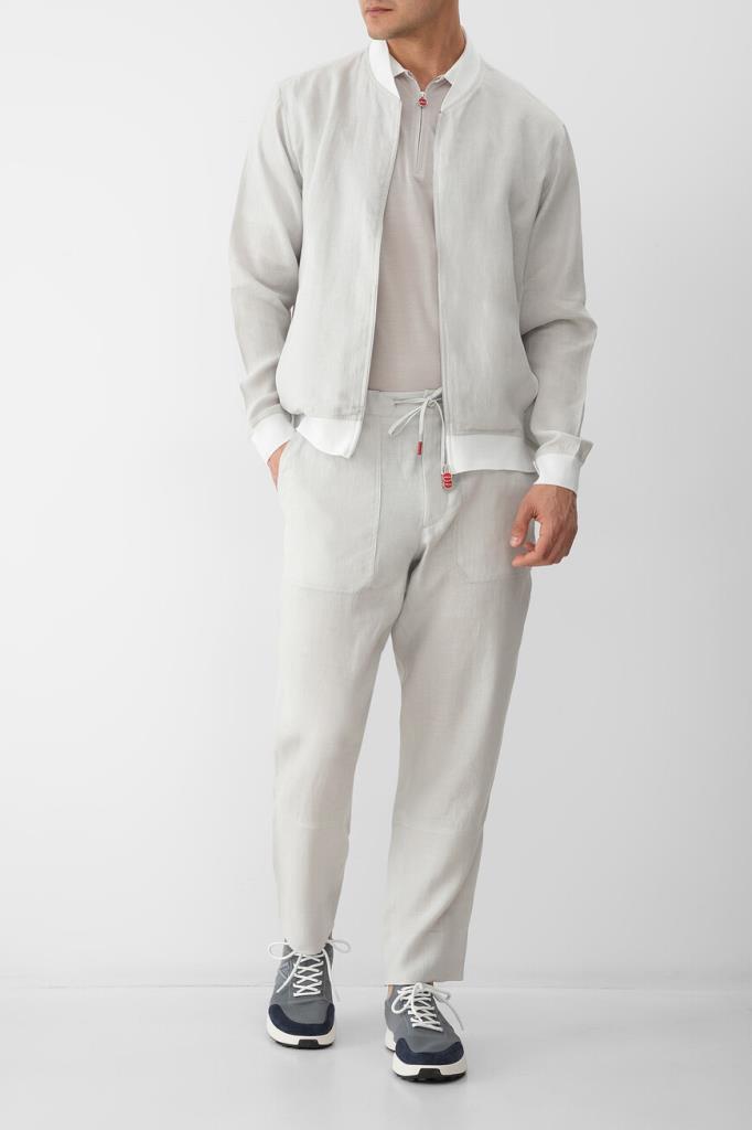 Светло-серые брюки Kiton со спортивным звучанием. Модель выполнена из лёгкого мягкого льна с четырьмя крупными накладными карманами в стиле рабочей униформы спереди по бокам и сзади. Принадлежности изделия прямого силуэта Дому деликатно обозначена надписями-лого на ярко-красных наконечниках завязок. Образ можно завершить поло с короткими рукавами и бомбером на встречной молнии из той же коллекции.