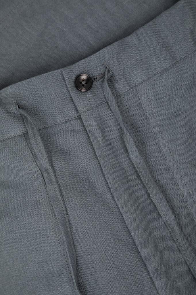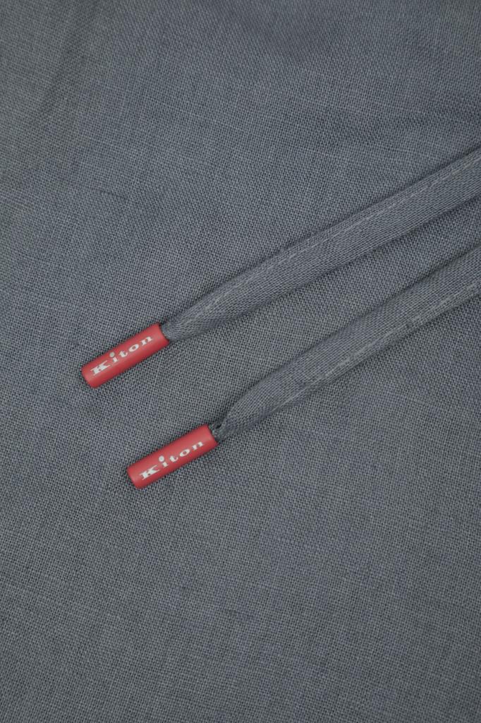 Прямые брюки серого цвета от бренда Kiton. Для изготовления модели со спортивным звучанием используется мягкий лён с длинными прочными волокнами. Изделие интересно наличием четырёх крупных накладных карманов в стиле рабочей униформы спереди по бокам и сзади и брендированием на красных наконечниках завязок эластичного пояса-кулиски. Брюки станут превосходным дополнением образа с поло с короткими рукавами и сникерами с перекрёстной шнуровкой белого цвета из той же коллекции.