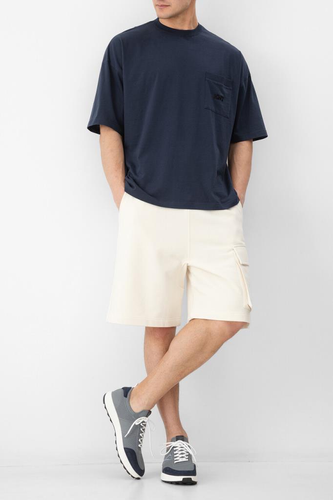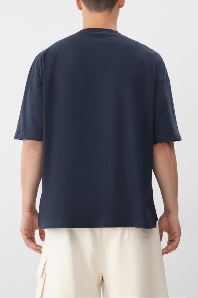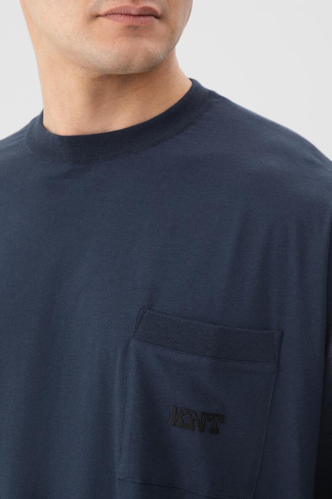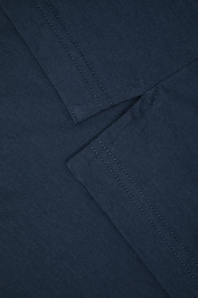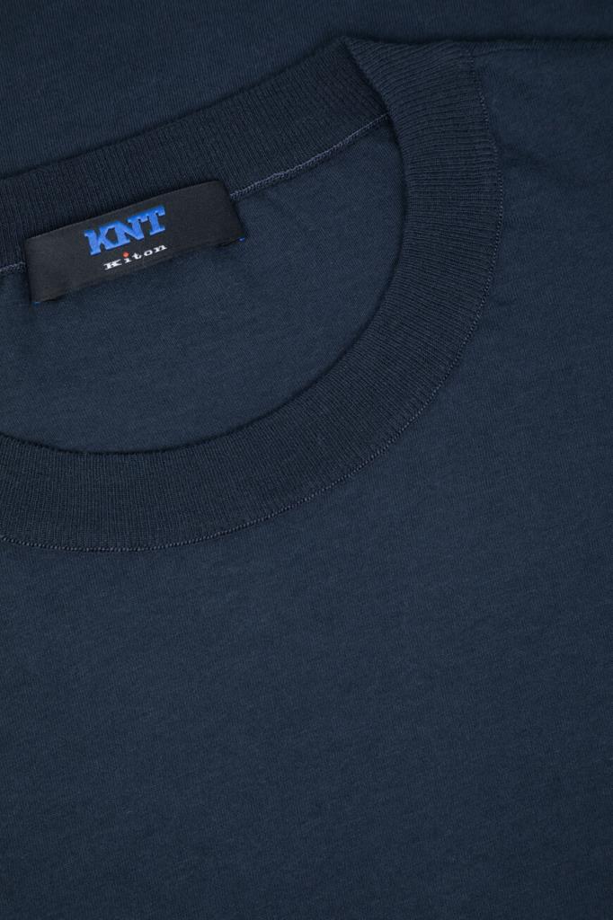 Футболка Kiton тёмно-синего цвета с ассиметричным низом. Изделие свободного силуэта со спущенной линией плеч входит в коллекцию городской одежды KNT. Для изготовления модели используется мягкое джерси на основе длинноволокнистого хлопка ценных сортов с добавлением гладкого шёлка. Футболка из такого материала получилась исключительно приятной на ощупь. О принадлежности изделия Дому деликатно напоминает едва заметная вышитая аббревиатура «KNT» на нагрудном кармане.