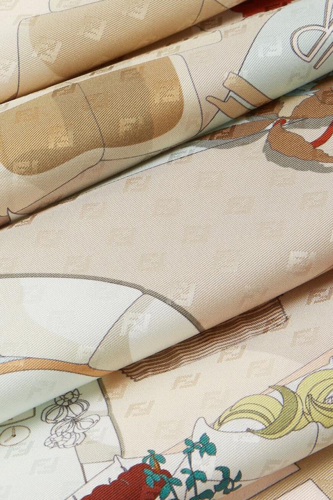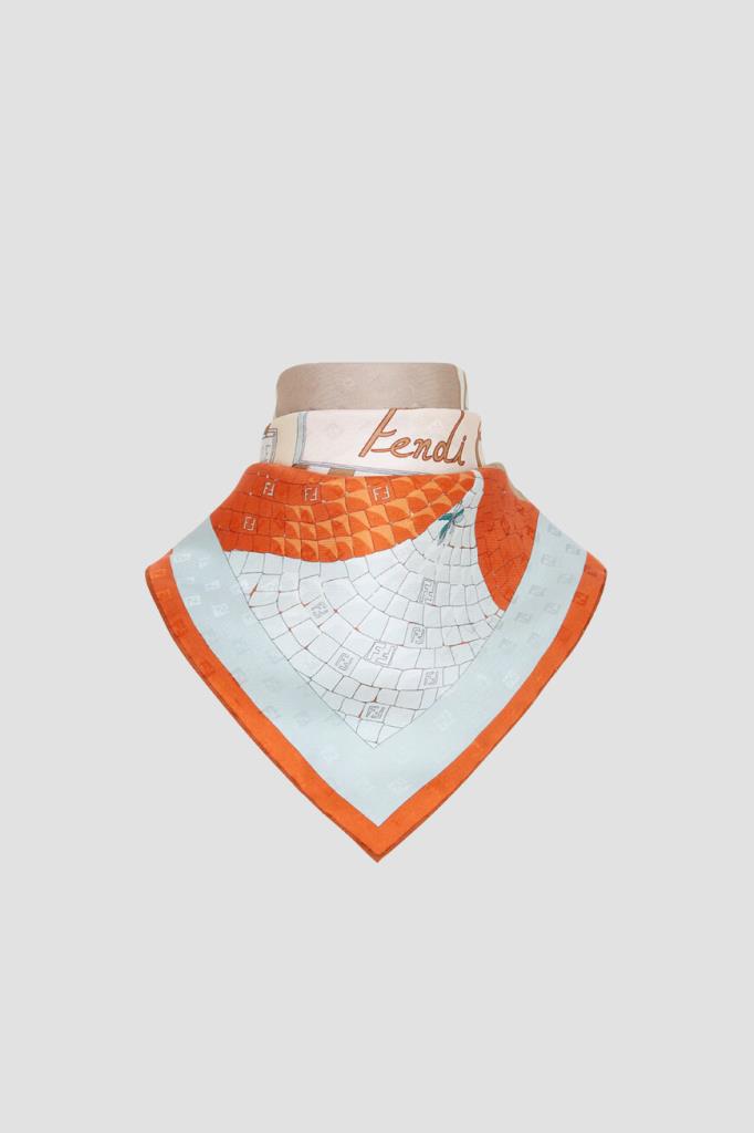 Платок Fendi с разноцветным принтом «Walking around Rome». Сплошной декор навеян старинными кварталами Рима. На жаккардовой основе с легендарным микроузором «FF», переплетаются знаковые символы Дома и отсылки к традициям. Конструкция лёгкого аксессуара из шелковой саржи характеризуется квадратной формой и обрамлением в полоску Pequin в стиле колор-блок по краям.