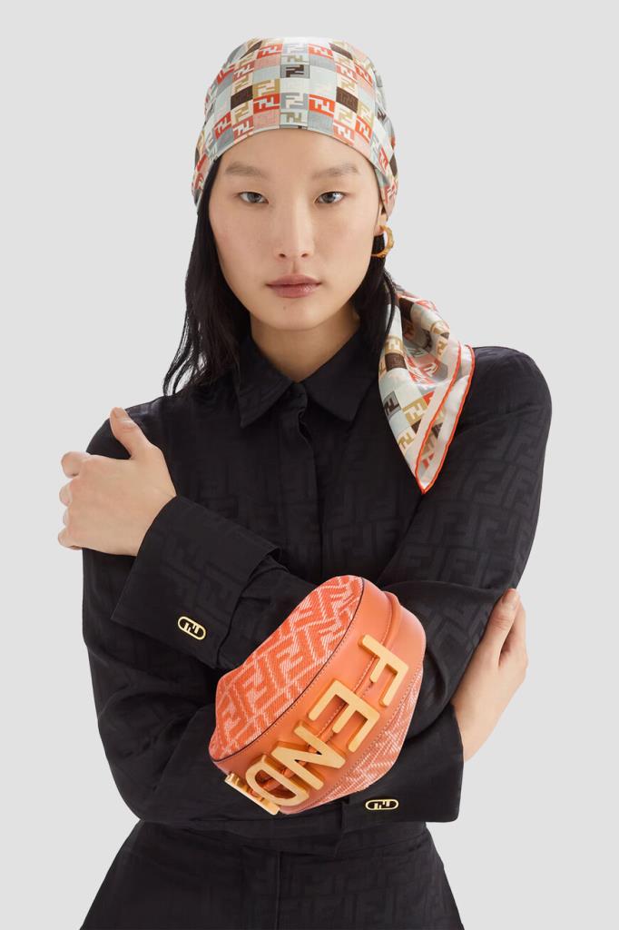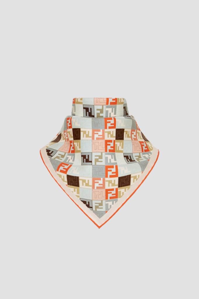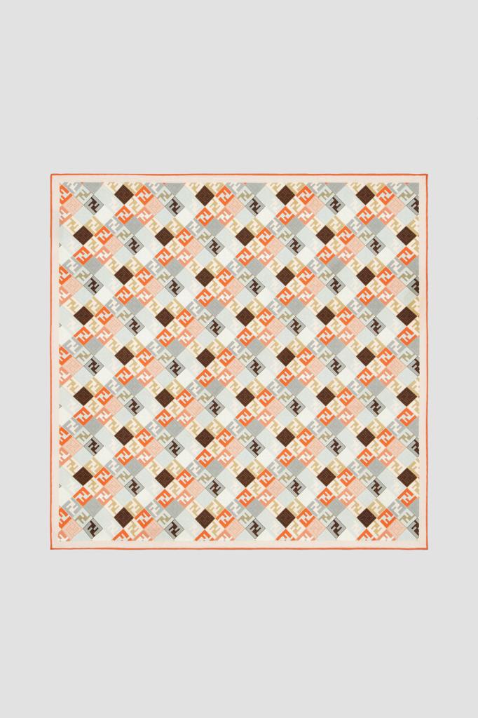 Разноцветный платок Fendi FF квадратной формы. Для пошива изделия используется органическая шелковая саржа. Чтобы создать динамичный эффект, модель украсили мотивом в виде легендарной аббревиатуры причудливой геометрической формы в стиле колор-блок. Отделка краёв аксессуара выполнена вручную.
