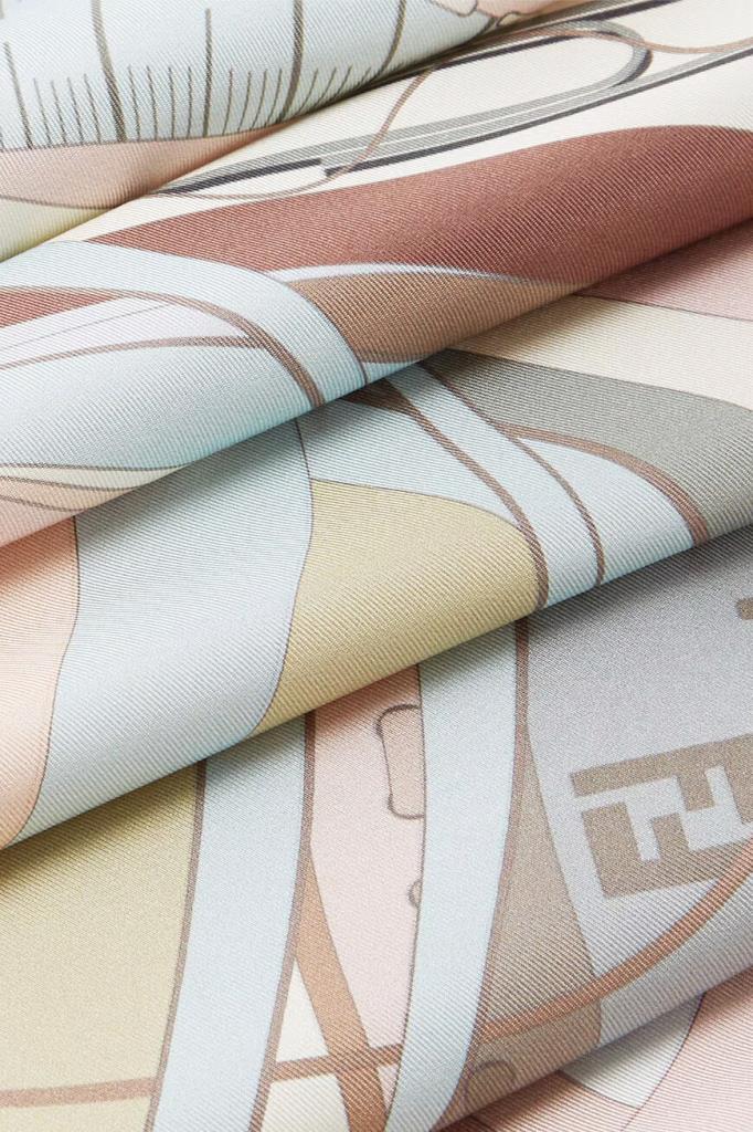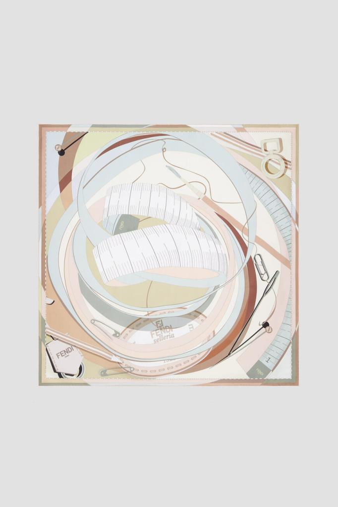 Шелковый платок Fendi с отделкой краёв ручной работы. Поверхность изделия из гладкой саржи покрыта сплошным принтом Selleria Essentials, навеянным ремесленными мастерскими Дома. Легендарные инструменты, изображенные в лабиринте абстрактных форм и пастельных оттенков, воплощают в себе очарование портновского мастерства Fendi.