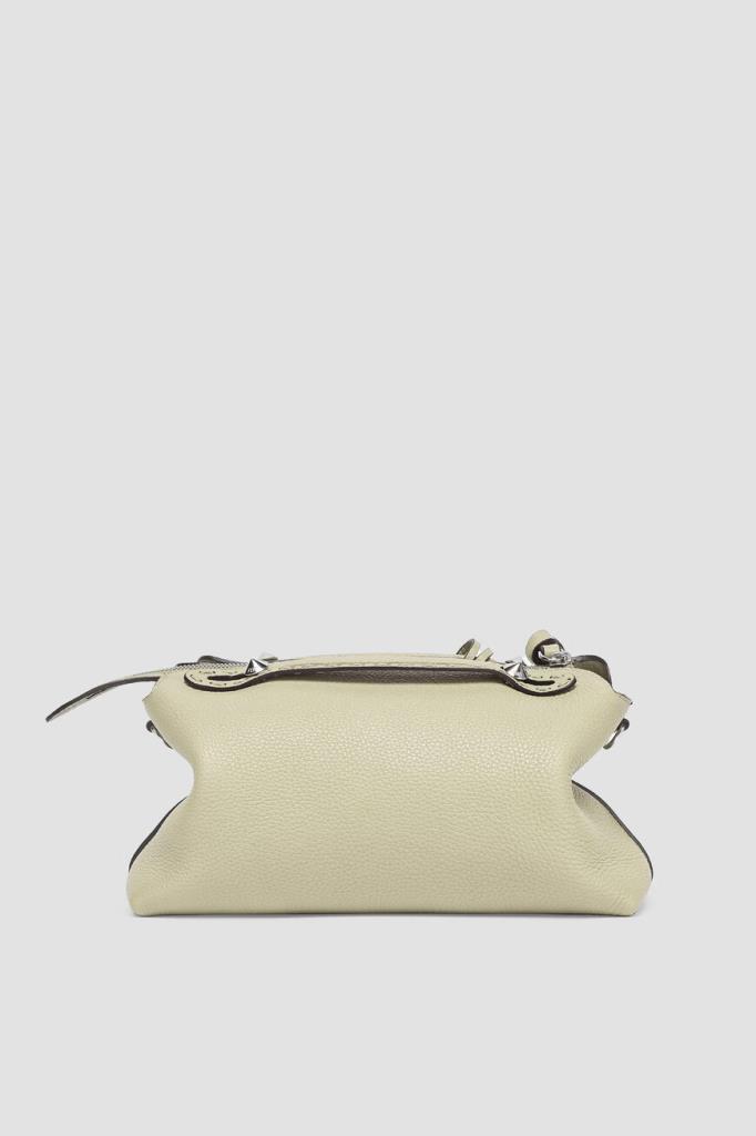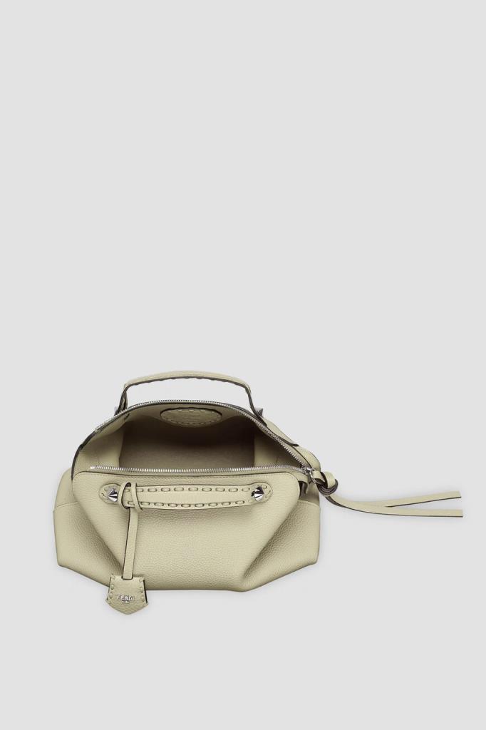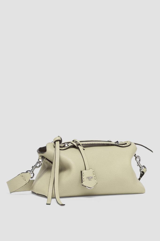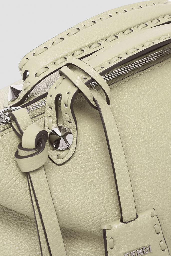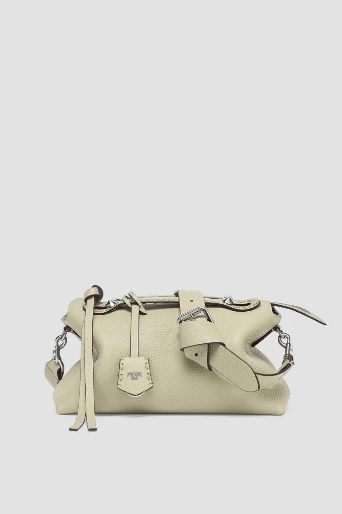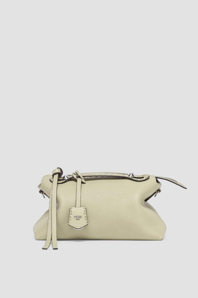 Сумка By The Way Selleria среднего формата от бренда Fendi. Для создания изделия шалфейного оттенка используется зернистая телячья кожа Cuoio Romano. Легендарная модель, переосмысленная в мягком и лёгком дизайне, прошита вручную 192 макро-стежками в тон, символизирующими отделку Selleria, созданную мастерами Fendi в 1925 году.