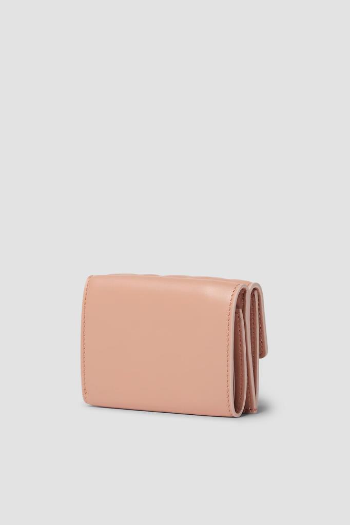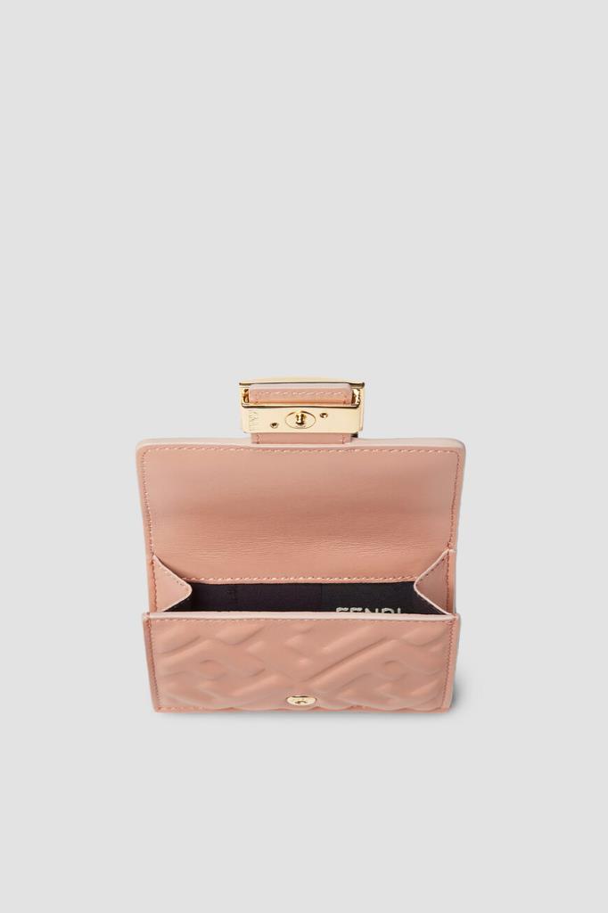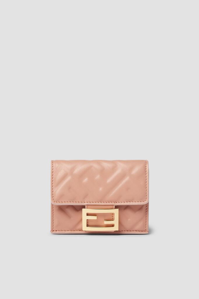 Нежно-розовый кошелёк Fendi Baguette с гладкой текстурой. Конструкция складной модели миниатюрного формата, изготовленной из мягкой кожи наппа, характеризуется наличием одного внутреннего отделения для банкнот, тремя потайными карманами-футлярами для пластиковых карт и внешним карманом для потайной клёпке для хранения монет. Роль знакового для бренда декора передана легендарному диагональному мотиву «FF» с трёхмерным эффектом спереди и крупной детали-пряжке FF Baguette светло-золотого оттенка на ремешке откидного клапана в передней части аксессуара.