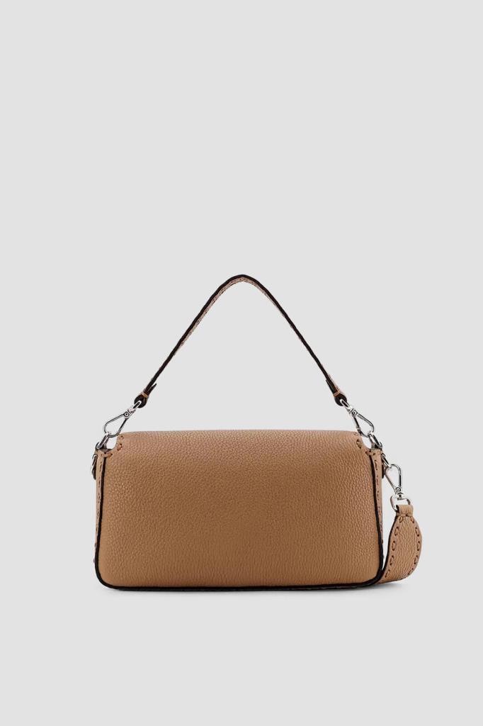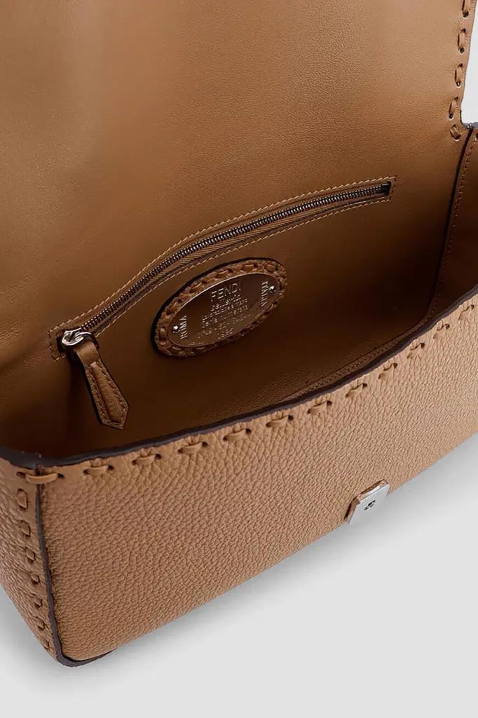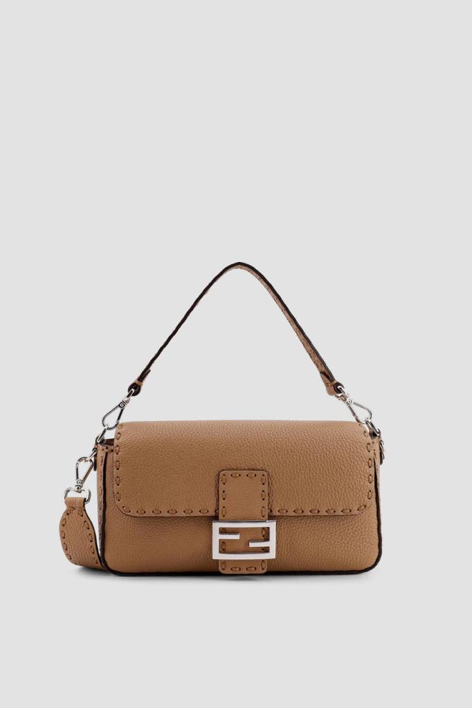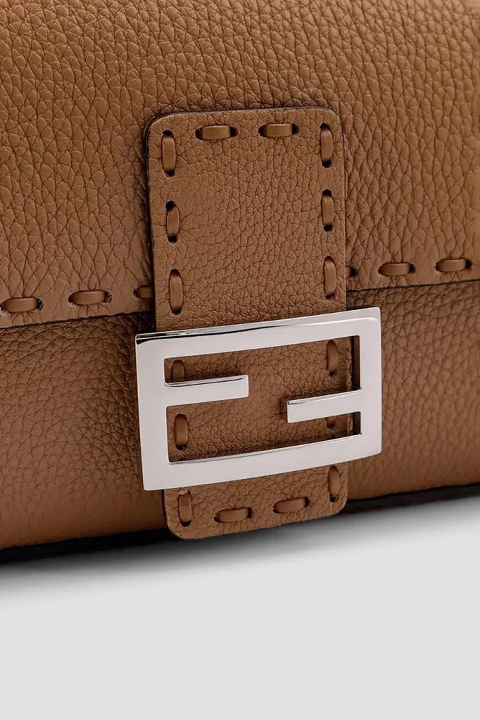 Легендарная сумка Baguette коричневого цвета от бренда Fendi. Прямоугольный аксессуар среднего формата прошит 612 макро-стежками в тон. Это символ ручной отделки Selleria, созданной мастерами Дома в 1925 году. Изделие выполнено из зернистой кожи телёнка Cuoio Romano и декорировано крупной рельефной деталью FF Baguette из металла с палладиевым покрытием на ремешке откидного клапана спереди.