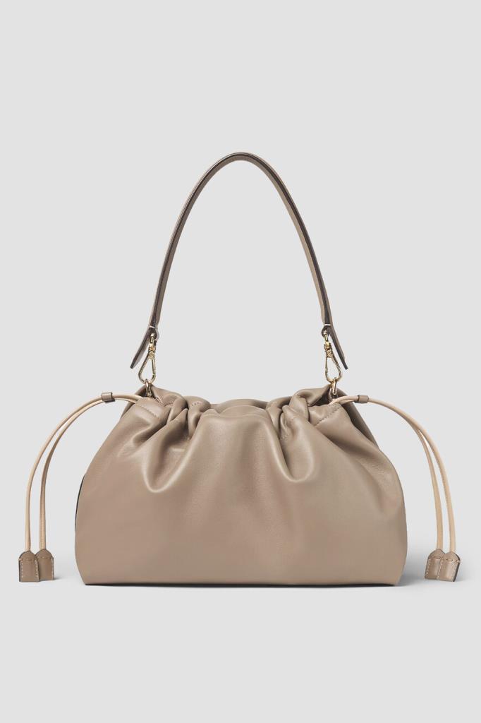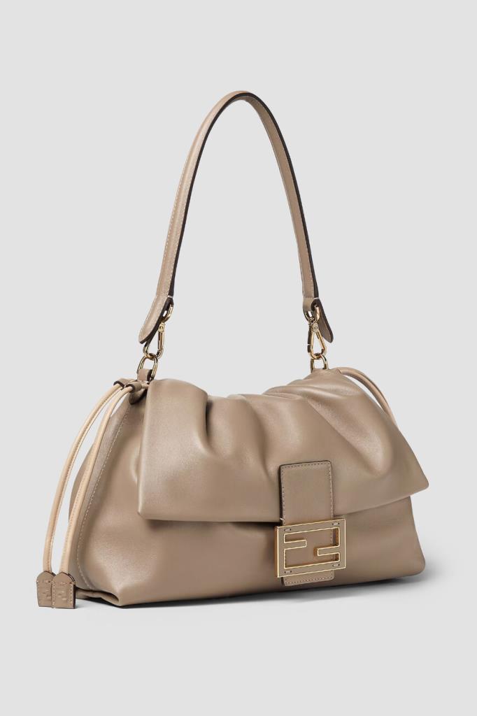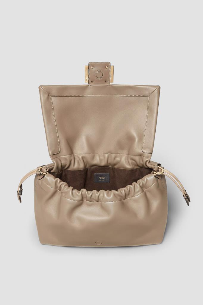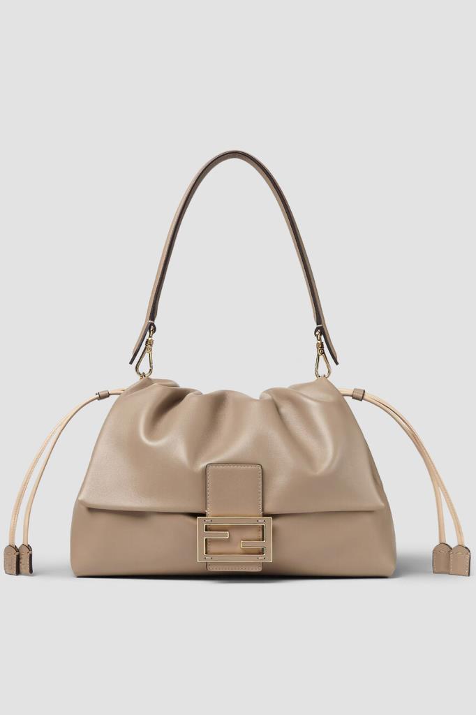 Гладкая сумка Mamma Baguette от бренда Fendi с верхом на кулиске. Первоначальная версия легендарного аксессуара из кожи наппа была создана в конце 1990-х годов в качестве большой версии модели Baguette, что и объясняет данное ему название. Дизайн изделия сливочного оттенка разработан специально для ношения под мышкой, но благодаря наличию съёмной округлой ручки сверху сумку также можно носить в руке или на плече в зависимости от ситуации.