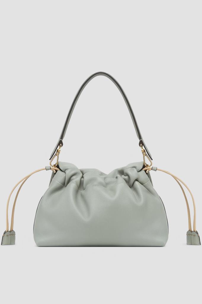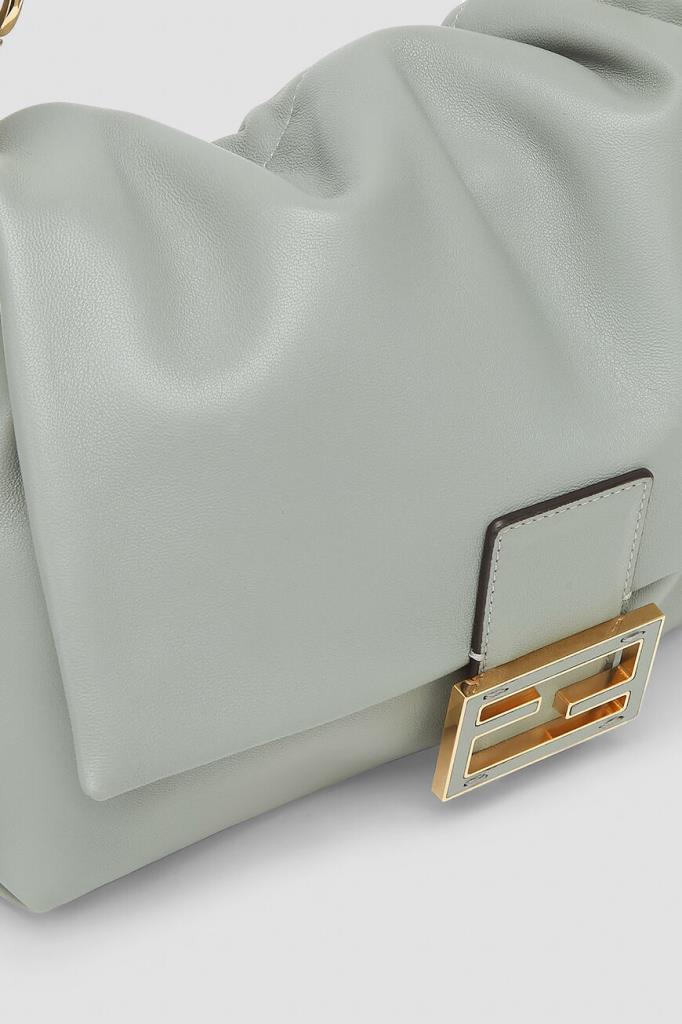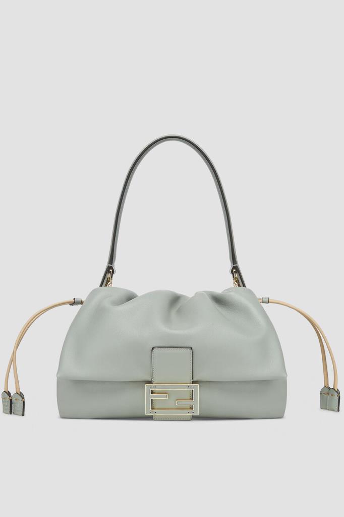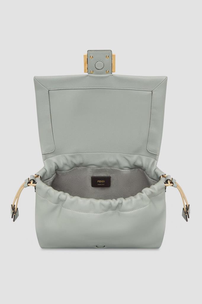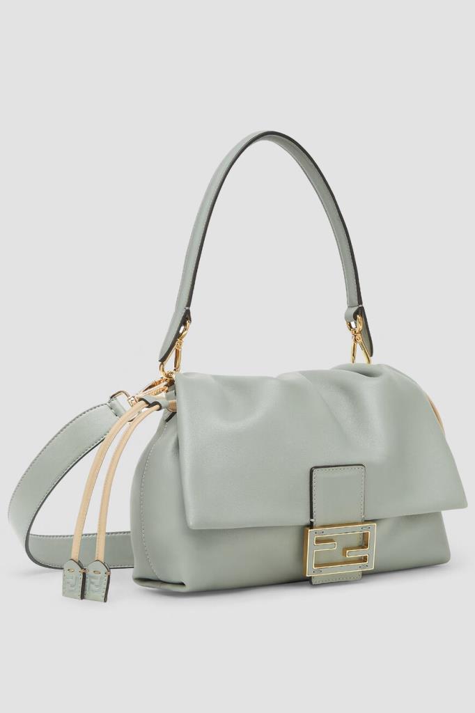 Сумка Fendi Mamma Baguette среднего формата в оттенке зелёного чая матча. Для производства увеличенной версии легендарного аксессуара Baguette, созданной в конце 1990-х годов, выбрана гладкая кожа наппа. Конструкция изделия предполагает наличие верха на сливочных кулисках и откидного клапана с крупной рельефной деталью FF Baguette светло-золотого оттенка на ремешке. Атрибутом Дома также выступает брендирование на подкладке из бархатистой замши в тон.