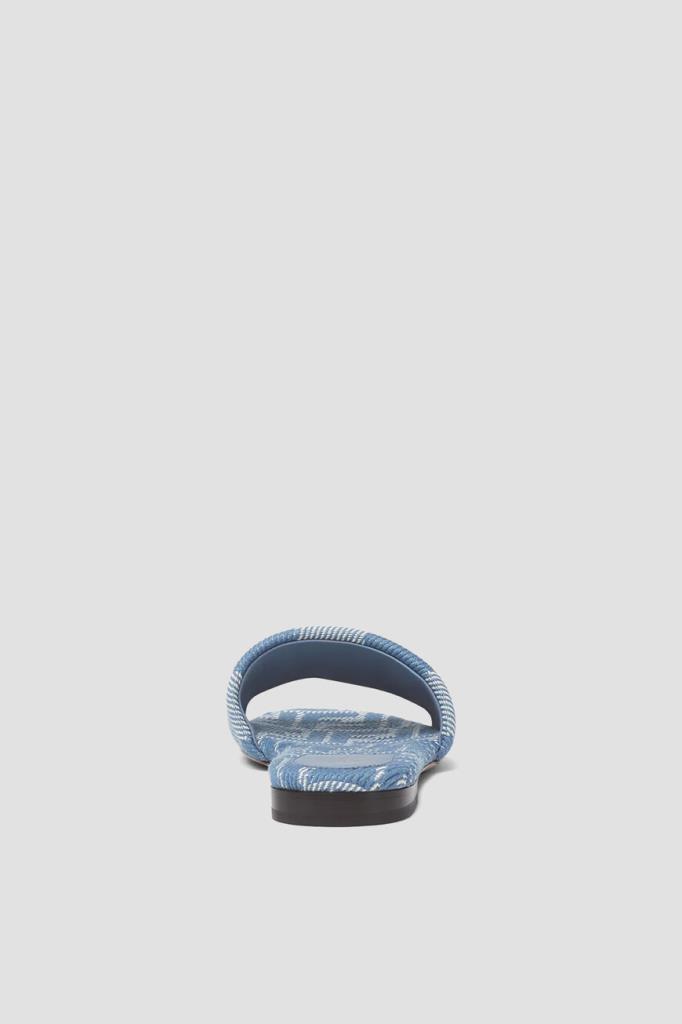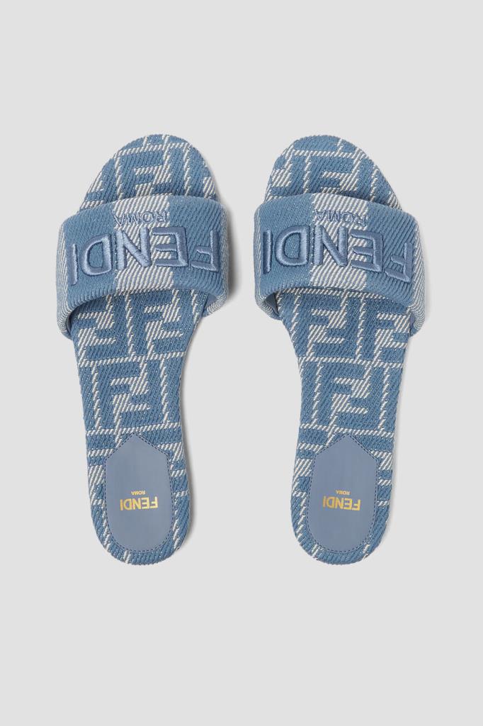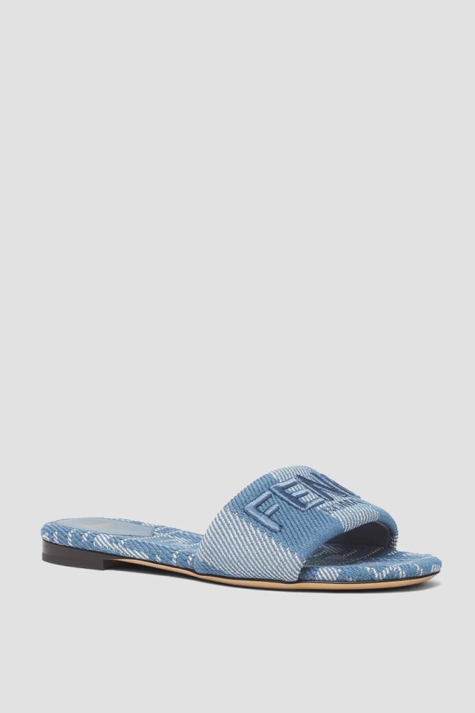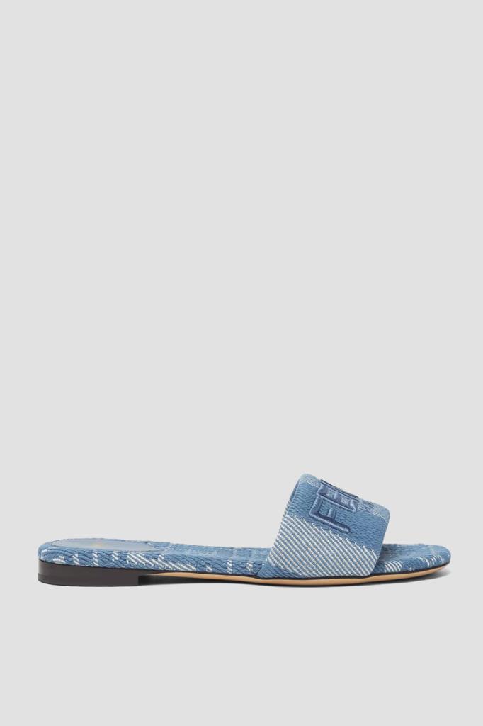 Шлепанцы Sunshine от бренда Fendi в белом и синих тонах. Конструкция изделия из плотного хлопкового жаккарда с эффектом денима предполагает наличие широкого мыса с узором в полоску Pequin и крупной вышитой надписью «Fendi Roma», а также подошвы из тонкой светло-бежевой кожи телёнка с низким устойчивым каблуком. В роли знакового для Дома декора также выступают легендарный геометрический мотив «FF» и золотистая надпись на стельках.