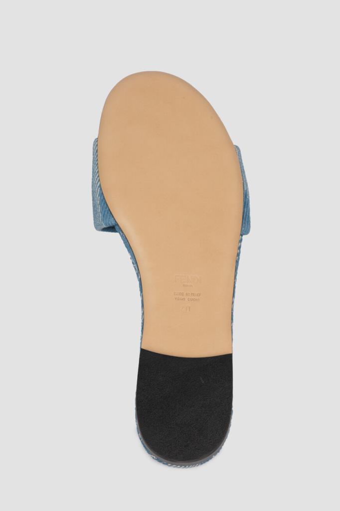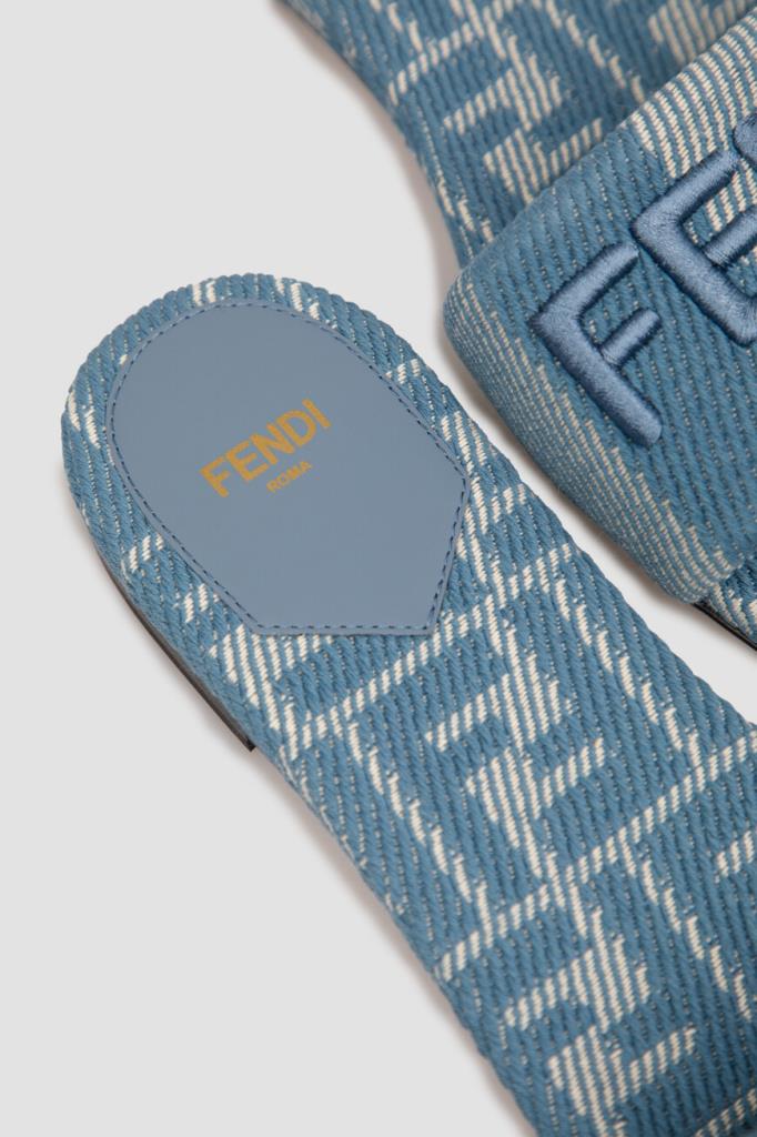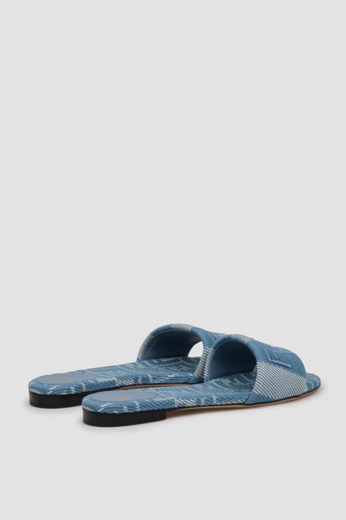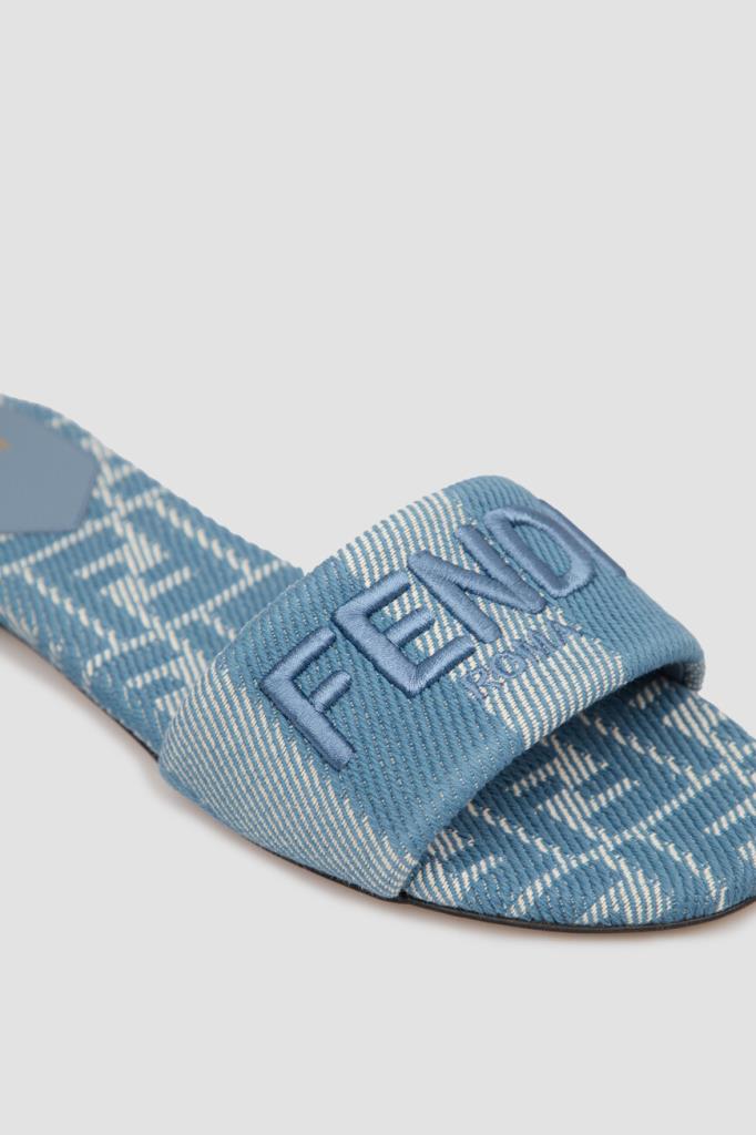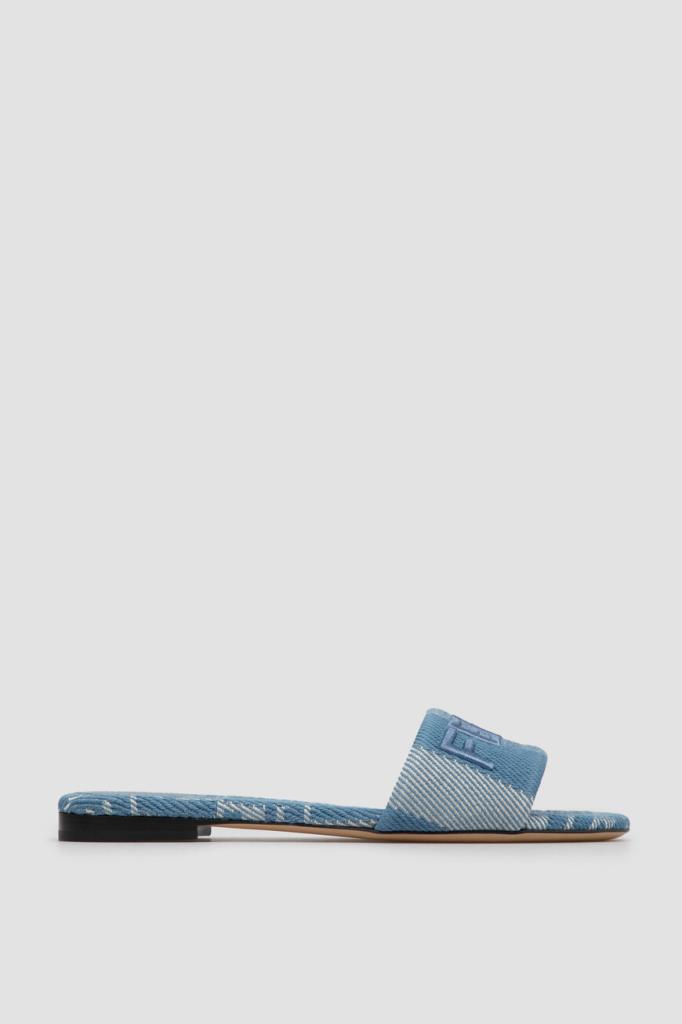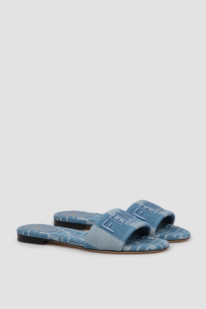 Шлепанцы Sunshine от бренда Fendi в белом и синих тонах. Конструкция изделия из плотного хлопкового жаккарда с эффектом денима предполагает наличие широкого мыса с узором в полоску Pequin и крупной вышитой надписью «Fendi Roma», а также подошвы из тонкой светло-бежевой кожи телёнка с низким устойчивым каблуком. В роли знакового для Дома декора также выступают легендарный геометрический мотив «FF» и золотистая надпись на стельках.