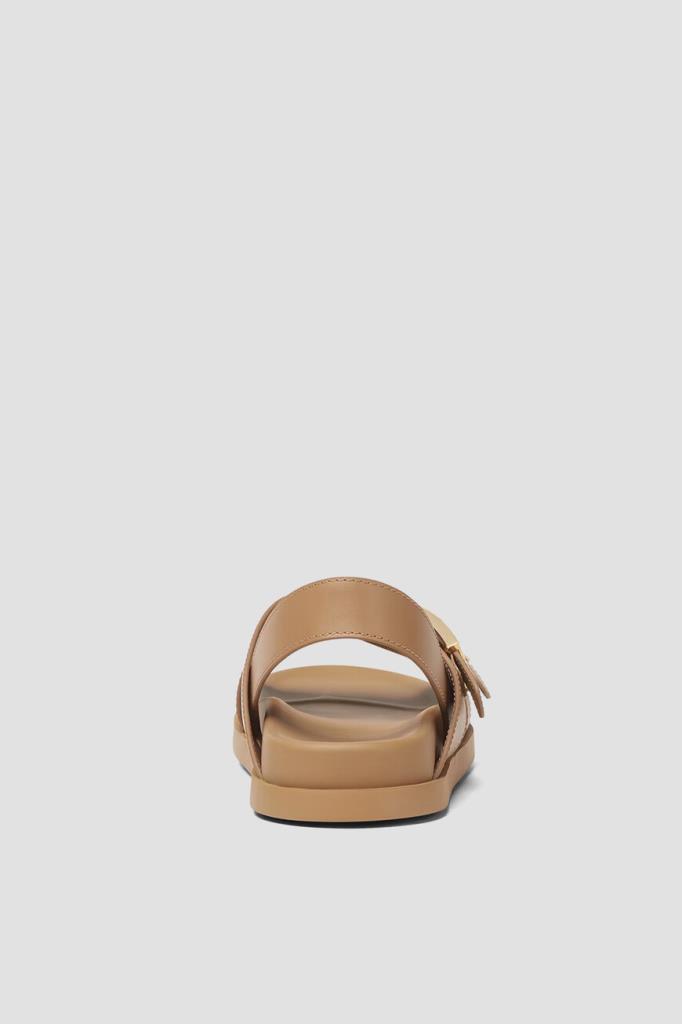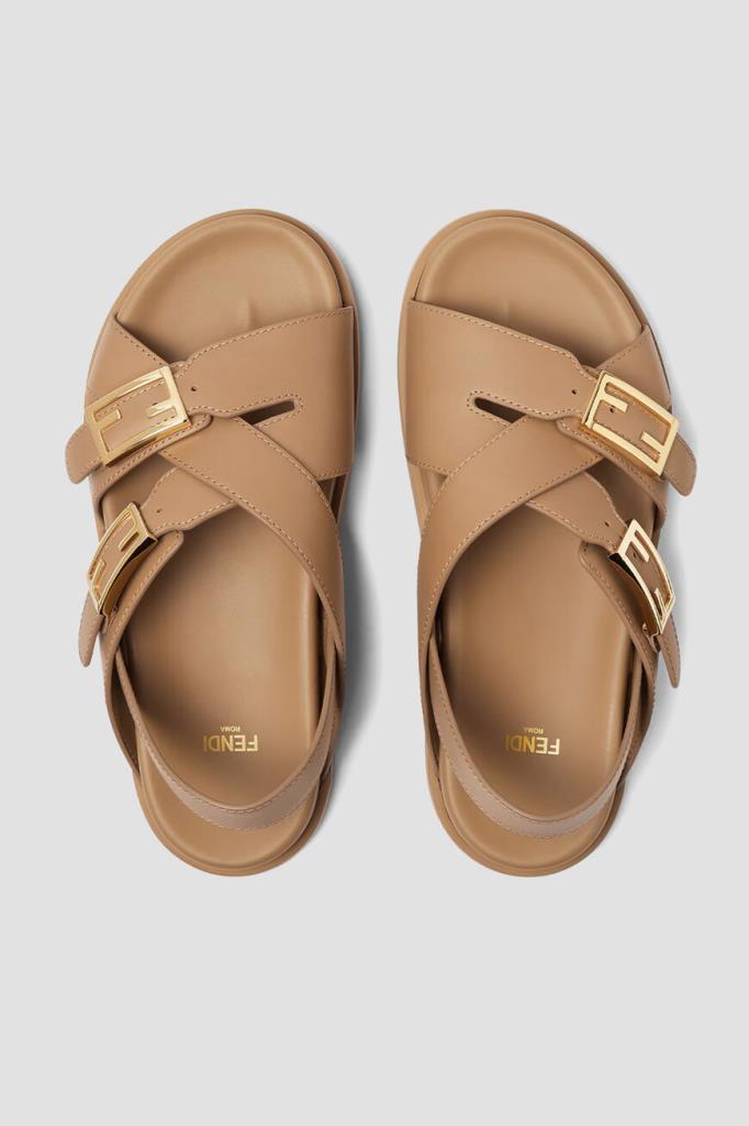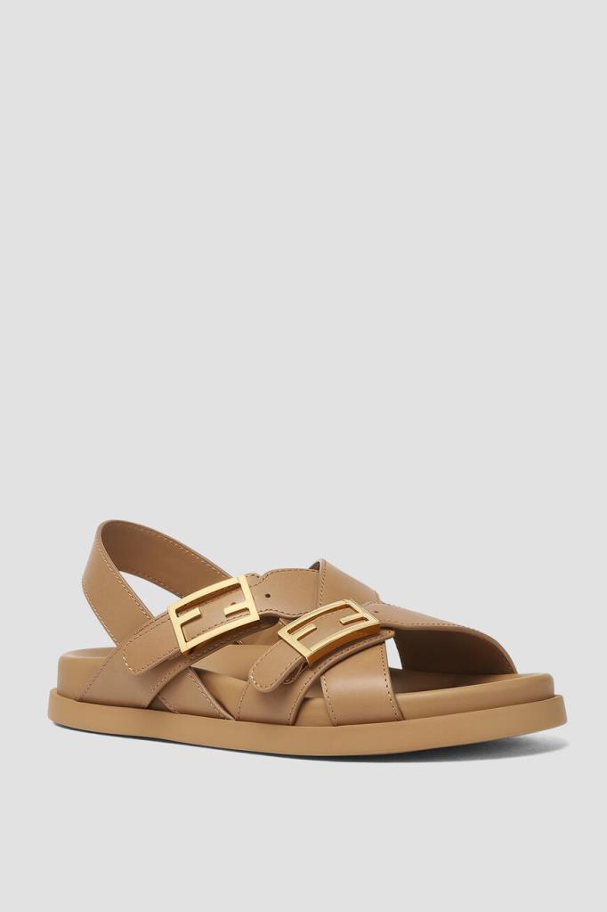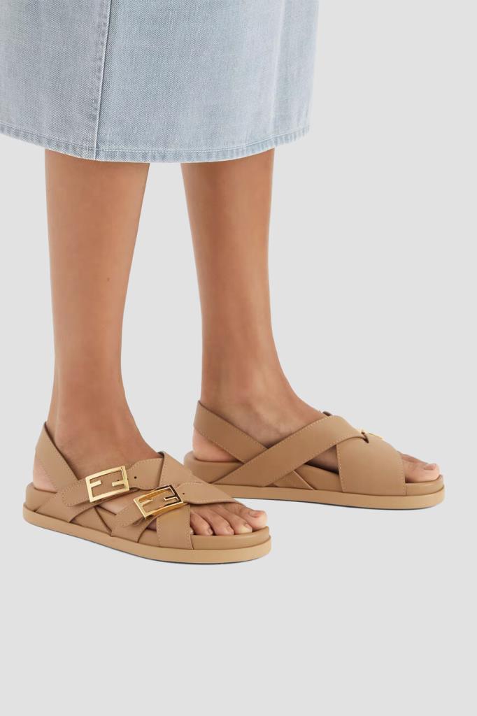 Шлепанцы Fendi Feel нейтрального бежевого цвета. Удобная пара изготовлена из гладкой телячьей кожи и оснащена широким мысом, состоящим из трёх перекрещенных между собой ремешков с декоративными прямоугольными пряжками FF Baguette светло-золотого оттенка. Особенностями прогулочной модели стали открытые округлый носок и задник и брендированные кожаные стельки анатомической формы.