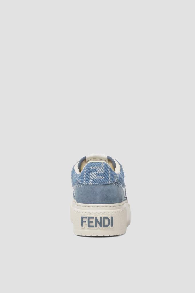 Кеды Fendi Match из двух видов материалов голубых и кремового оттенков. Модель на широкой платформе из каучука с рифлением снизу изготовлена из комбинации плотного хлопкового жаккарда с геометрическим узором «FF» и эффектом денима и бархатистой замши. На принадлежность пары с закрытым типом шнуровки Дому также указывают крупная полупрозрачная аппликация по бокам, вставка с синей символикой на язычке и рельефный логотип сзади на подошве.