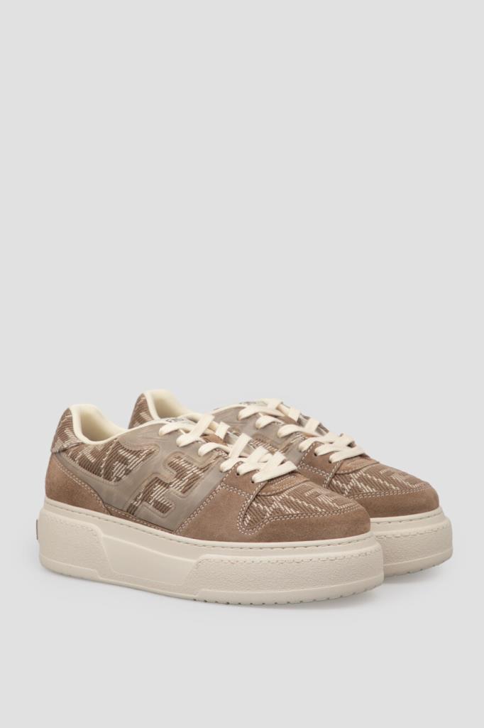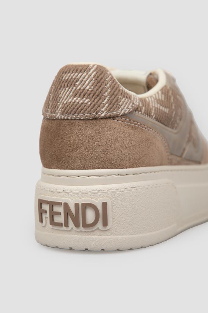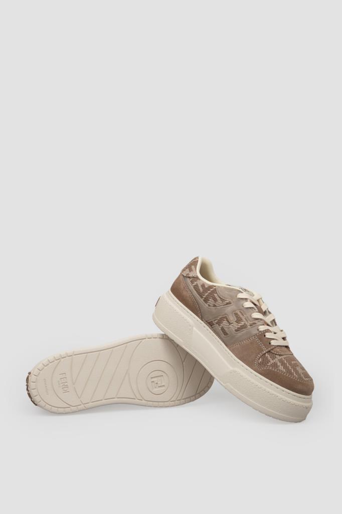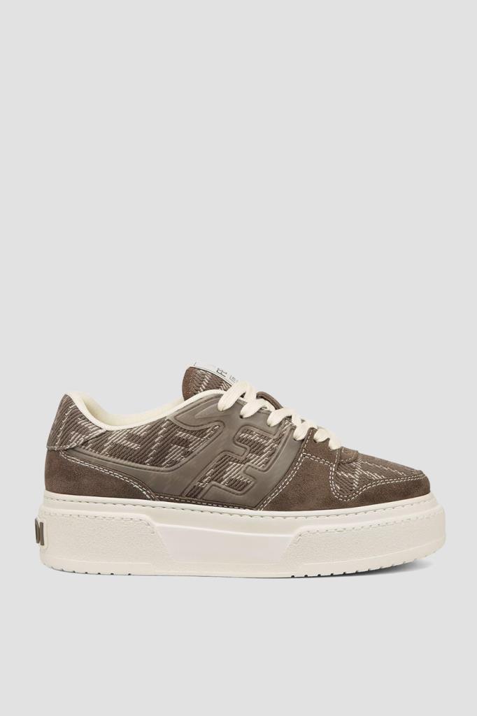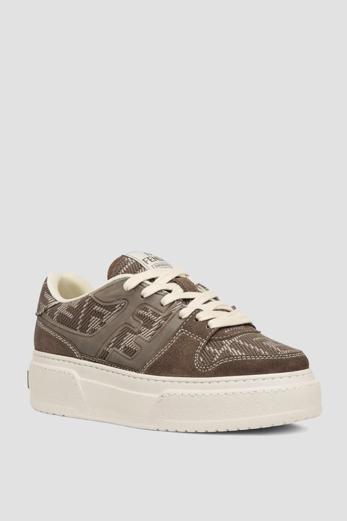 Кеды Fendi Match с округлым носком и вставкой с символикой бренда на язычке. Конструкция изделия, выполненного из смеси плотного хлопкового жаккарда с геометрическим узором «FF» и эффектом денима и бархатистой замши, предполагает наличие закрытого типа шнуровки и плоской широкой подошвы из натуральной резины с рифлением снизу и логотипом в задней части. Боковины декорированы крупной полупрозрачной аппликацией, а внутренняя часть удобной пары отличается отделкой в фактурную сетку.