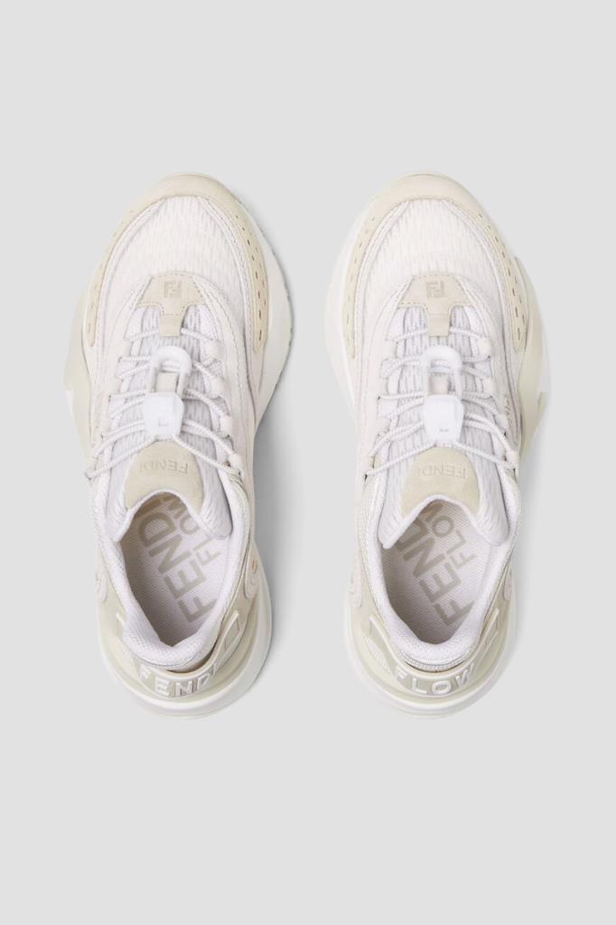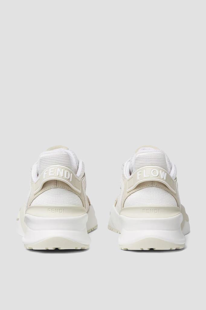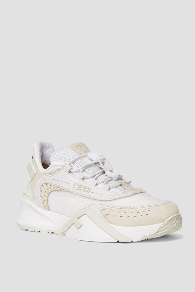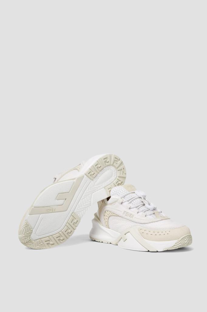 Кроссовки Fendi Flow с укреплёнными округлым носком и задником. Для производства изделия с широкой колодкой используется высокопрочная сетка с разными текстурами и вставками из бархатистой замши с перфорацией на носке и боковинах. Комбинированная пара обуви выполнена в бежево-белой гамме и оснащена закрытой дизайнерской шнуровкой на кулиске с тиснёной монограммой спереди. Атрибутами Дома являются прорезиненные ремешки с окантовкой, логотипом и надписью-названием модели в задней части.