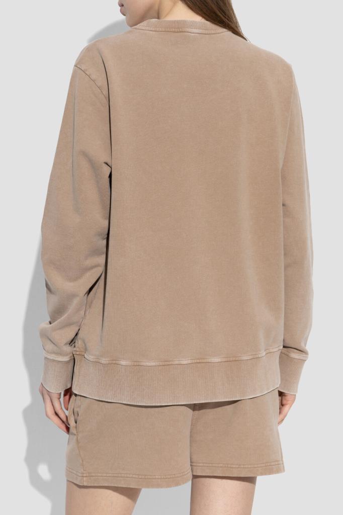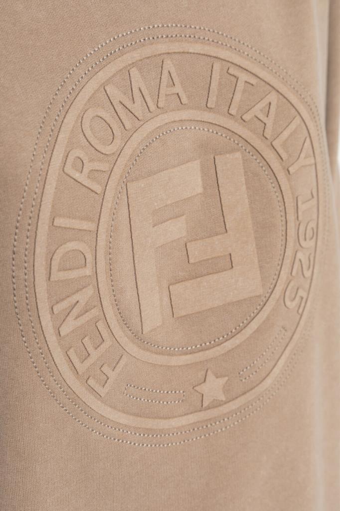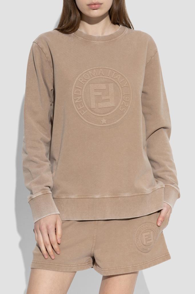 Хлопковый свитшот с крупной знаковой символикой бренда Fendi. Модель окрашена в нейтральный бежевый оттенок и дополнена широким эластичным поясом и манжетами-резинками для комфортной посадки по фигуре. Принадлежность повседневного изделия Дому обозначена рельефными надписями и аббревиатурой «FF» в круге - печатью Fendi Stamp 1925, размещённой спереди по центру. Дополните образ парными шортами на резинке из той же коллекции.