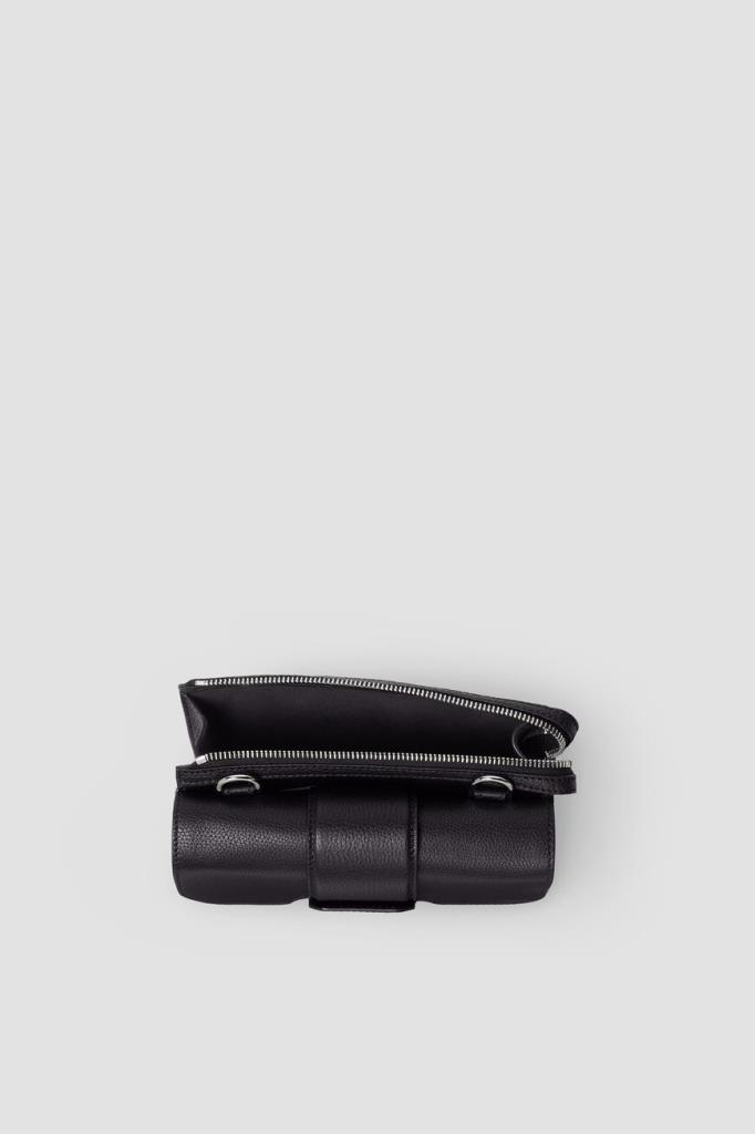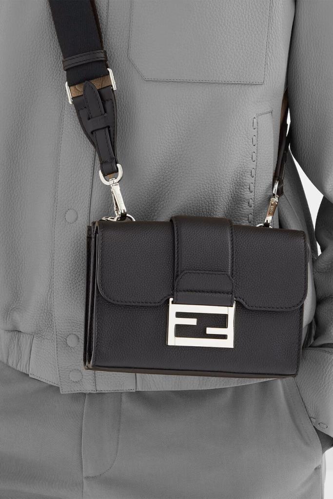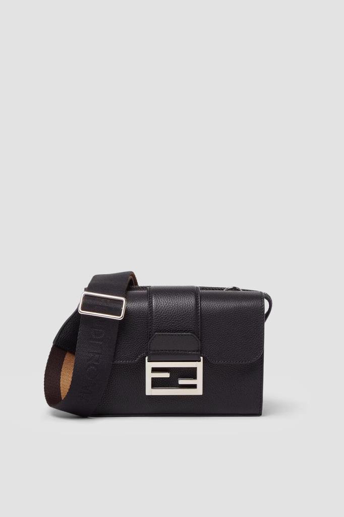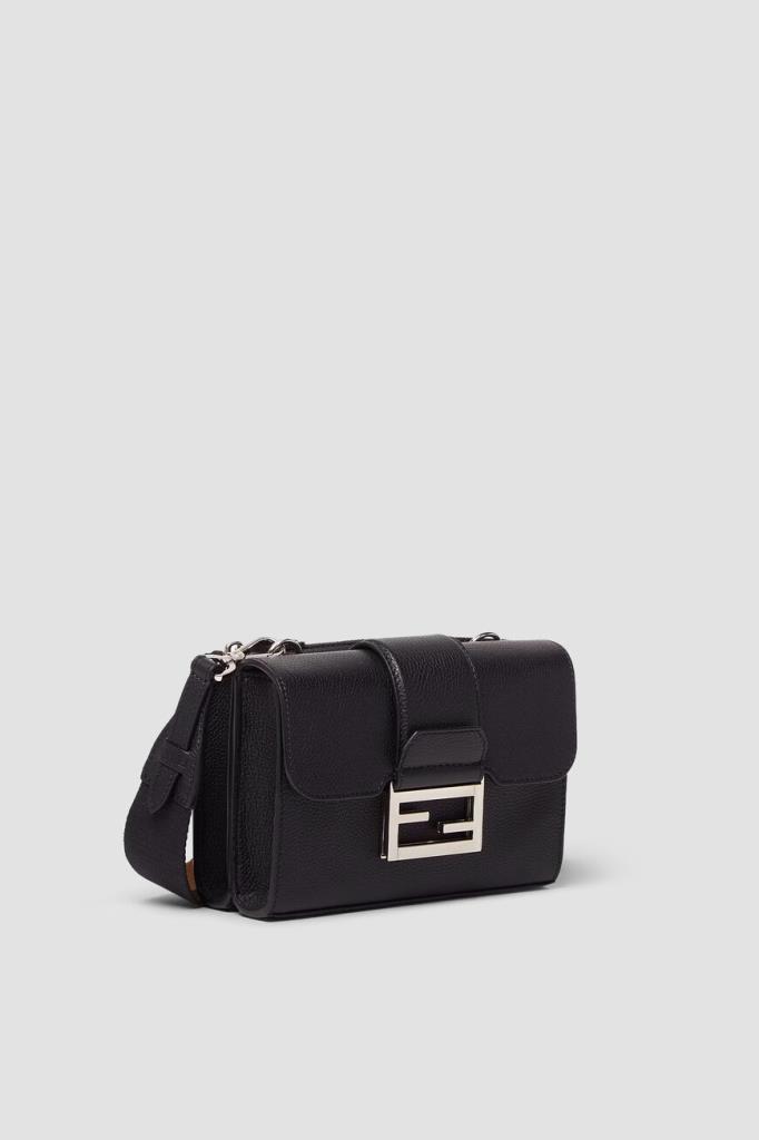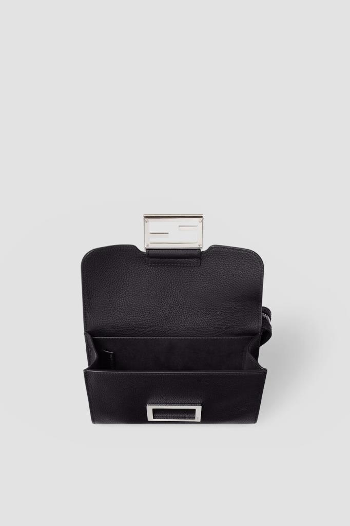 Чёрная сумка Baguette Double от бренда Fendi состоит из двух отделений. Переднее отделение застёгивается с помощью квадратного клапана на магнитной застёжке, а заднее - на круговой молнии серебристого оттенка. Между отделениями размещены плоский карман и D-образные крепления для плечевого ремня. Для создания основы изделия используется зернистая телячья кожа.