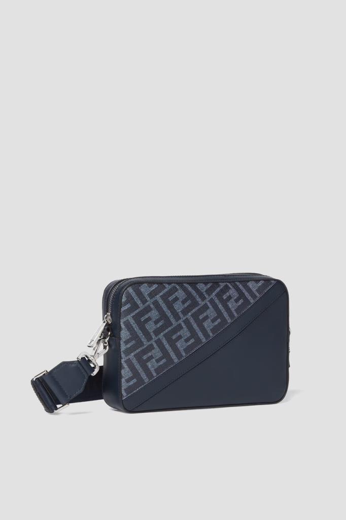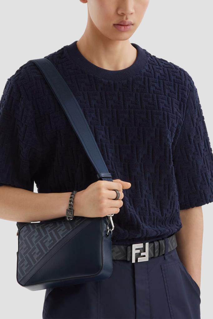 Сумка Camera Case Diagonal от бренда FENDI из двух видов материалов. Для производства компактной модели выбрана комбинация плотной ткани с культовым геометрическим мотивом «FF» в синих тонах и гладкой телячьей кожи на вставках. Изделие можно носить на плече или через плечо благодаря широкому регулируемому ремню с серебристыми карабинами. Аксессуар на молнии с двумя брендированными пуллерами и палладиевой фурнитурой станет неотъемлемой частью Вашего повседневного гардероба.