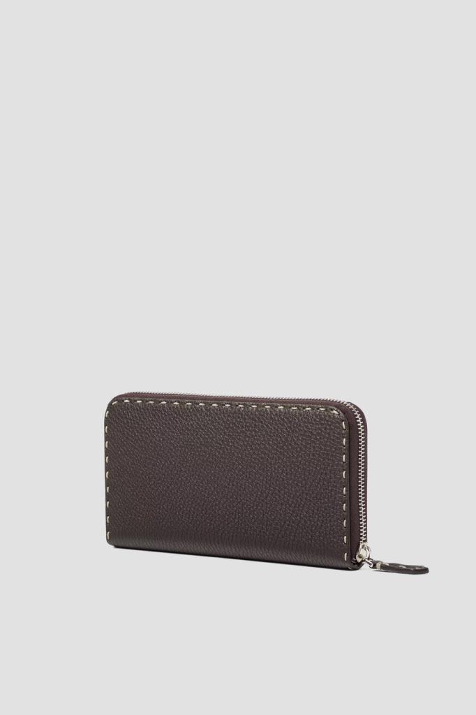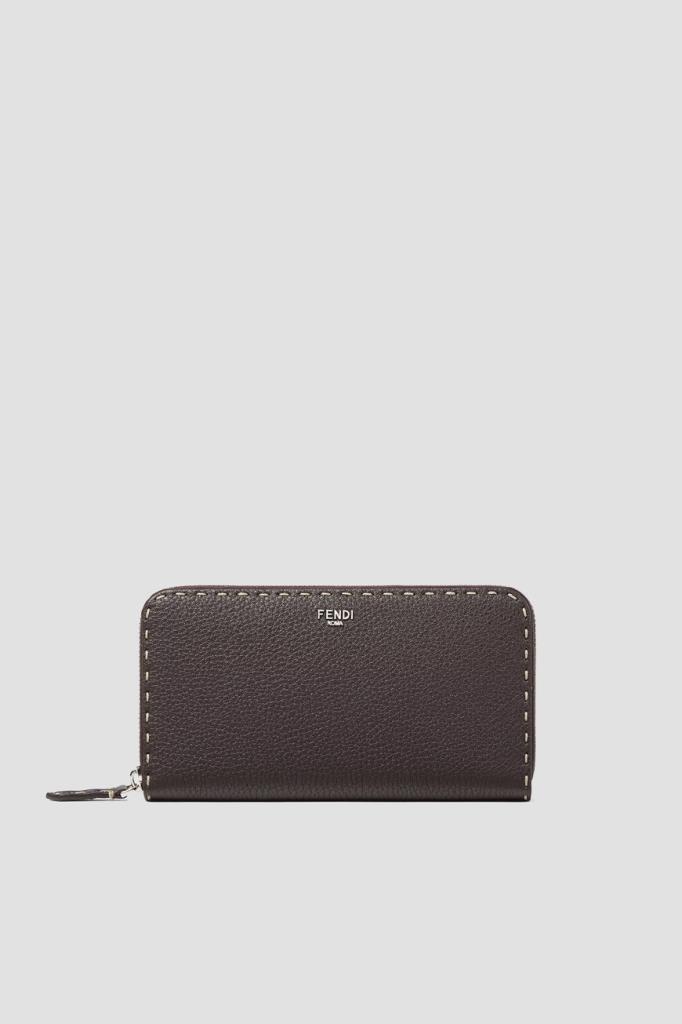 Тёмно-коричневый бумажник Fendi Selleria на круговой застёжке-молнии. Аксессуар из мягкой зернистой кожи телёнка Cuoio Romano прошит вручную 164 макро-стежками - символом легендарной отделки Selleria, созданной мастерами Fendi в 1925 году. Внутри - три отделения «гармошкой» для банкнот, карман-перегородка на серебристой молнии, предназначенный для хранения монет, восемь прорезей для пластиковых карт и два плоских боковых кармана без застёжки. На принадлежность изделия прямоугольной формы Дому указывает рельефная надпись-логотип «Fendi Roma» из металла с палладиевым покрытием, расположенная на лицевой стенке.