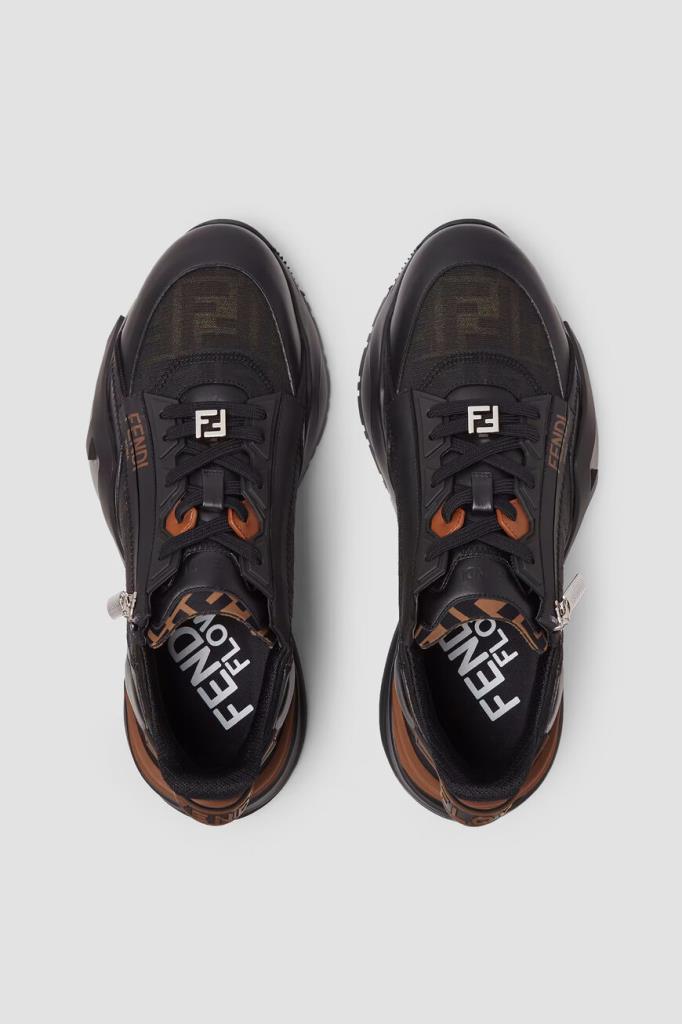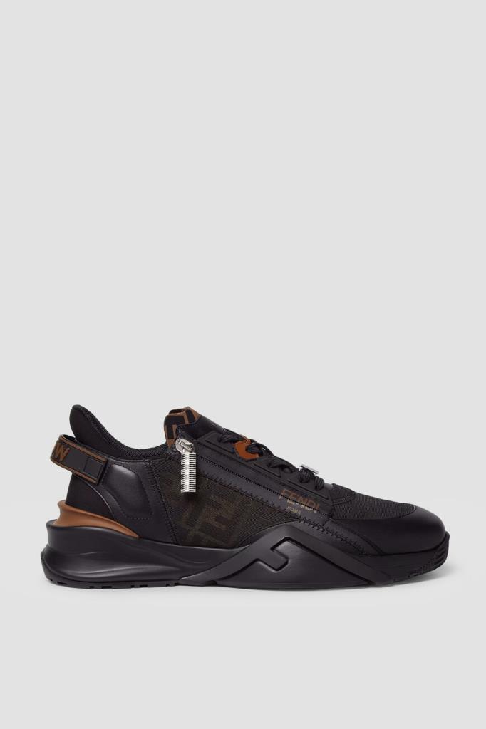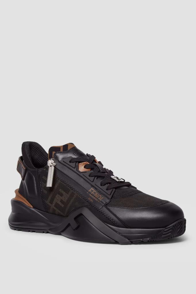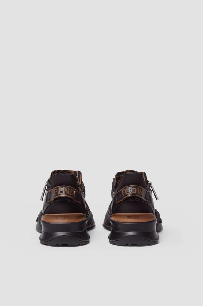 Сникеры-слипоны Fendi Flow с крупной знаковой символикой Дома. Для создания изделия выбраны чёрная телячья кожа, прочные полимеры и ткань на основе хлопка и нейлона с двухцветным жаккардовым узором FF Eclissi, растушеванным по краям. Модель оснащена закрытой перекрёстной шнуровкой с деталью-аббревиатурой из металла с палладиевым покрытием в нижней части. Пара установлена на скульптурную подошву из лёгкого каучука с рифлением снизу и крупными диагональными накладками в виде литер «F» на боковинах.