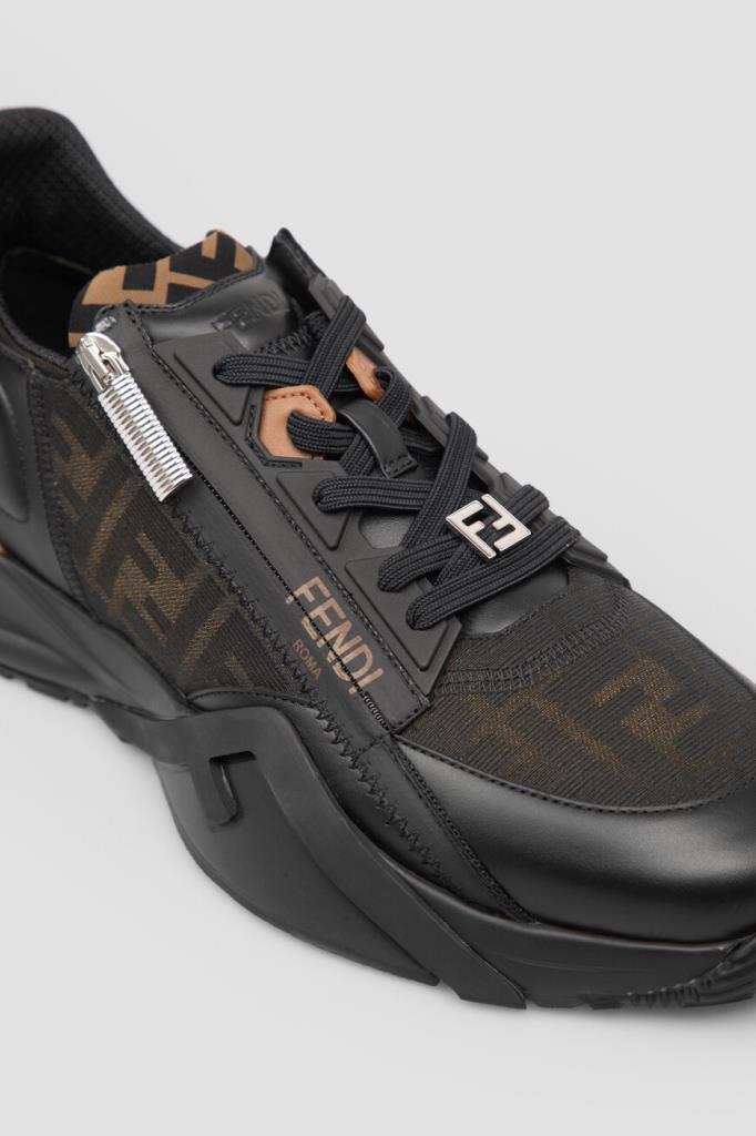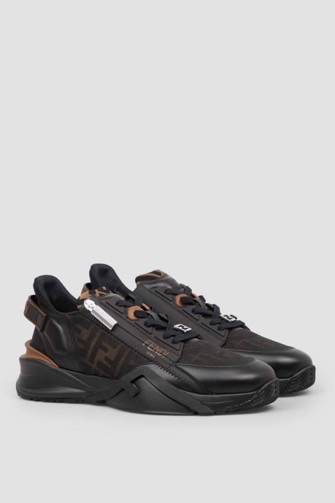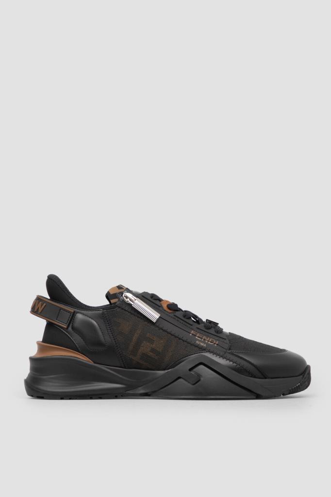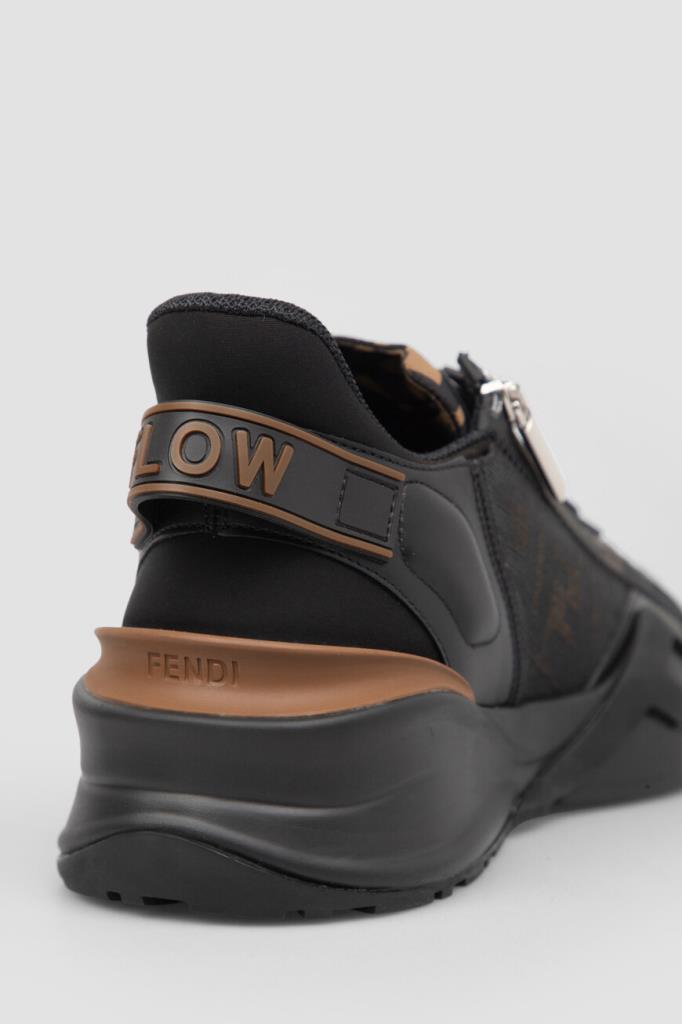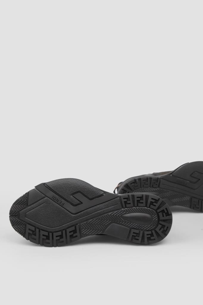 Сникеры-слипоны Fendi Flow с крупной знаковой символикой Дома. Для создания изделия выбраны чёрная телячья кожа, прочные полимеры и ткань на основе хлопка и нейлона с двухцветным жаккардовым узором FF Eclissi, растушеванным по краям. Модель оснащена закрытой перекрёстной шнуровкой с деталью-аббревиатурой из металла с палладиевым покрытием в нижней части. Пара установлена на скульптурную подошву из лёгкого каучука с рифлением снизу и крупными диагональными накладками в виде литер «F» на боковинах.