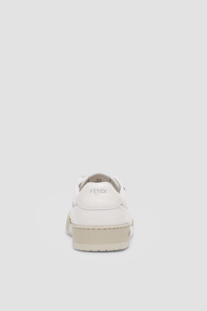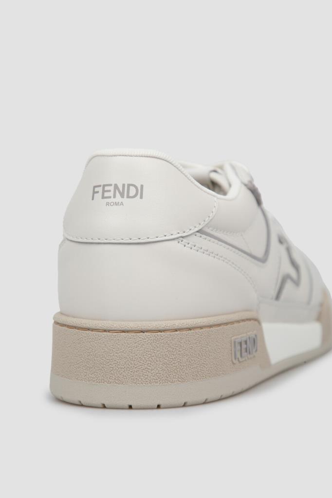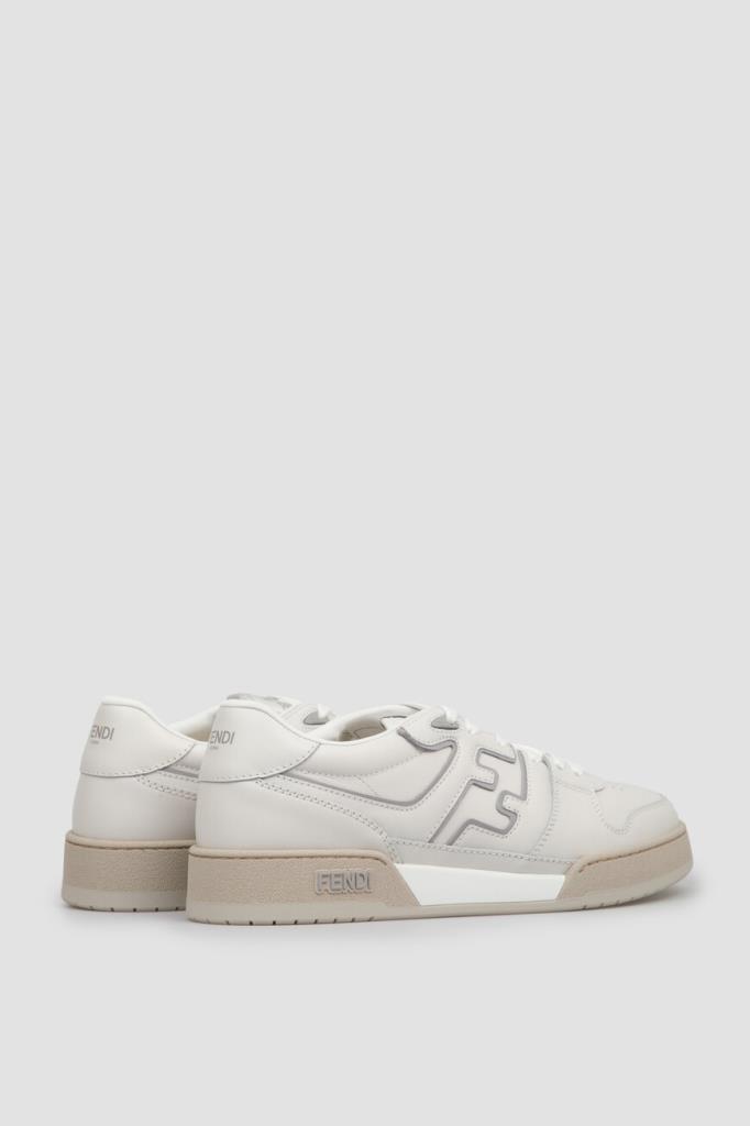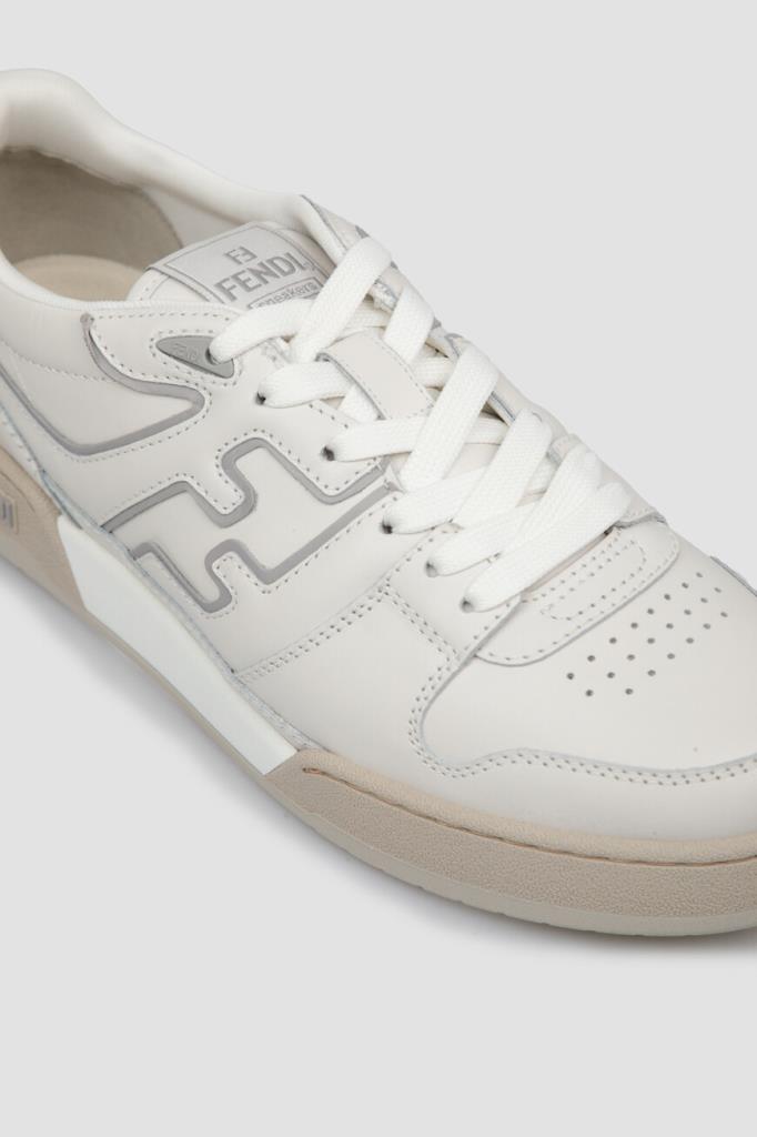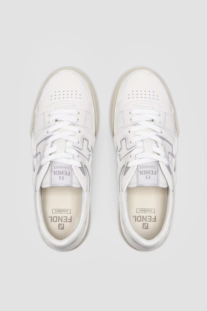 Белые сникеры Fendi Match с перфорацией на союзке. Для производства изделия с крупной рельефной аббревиатурой «FF», подчёркнутой узким кантом, на боковинах используется гладкая телячья кожа. Особенностями удобной пары с широкой колодкой являются закрытая перекрёстная шнуровка и плоская подошва из каучука с рифлением снизу и надписью-логотипом сбоку в задней части.