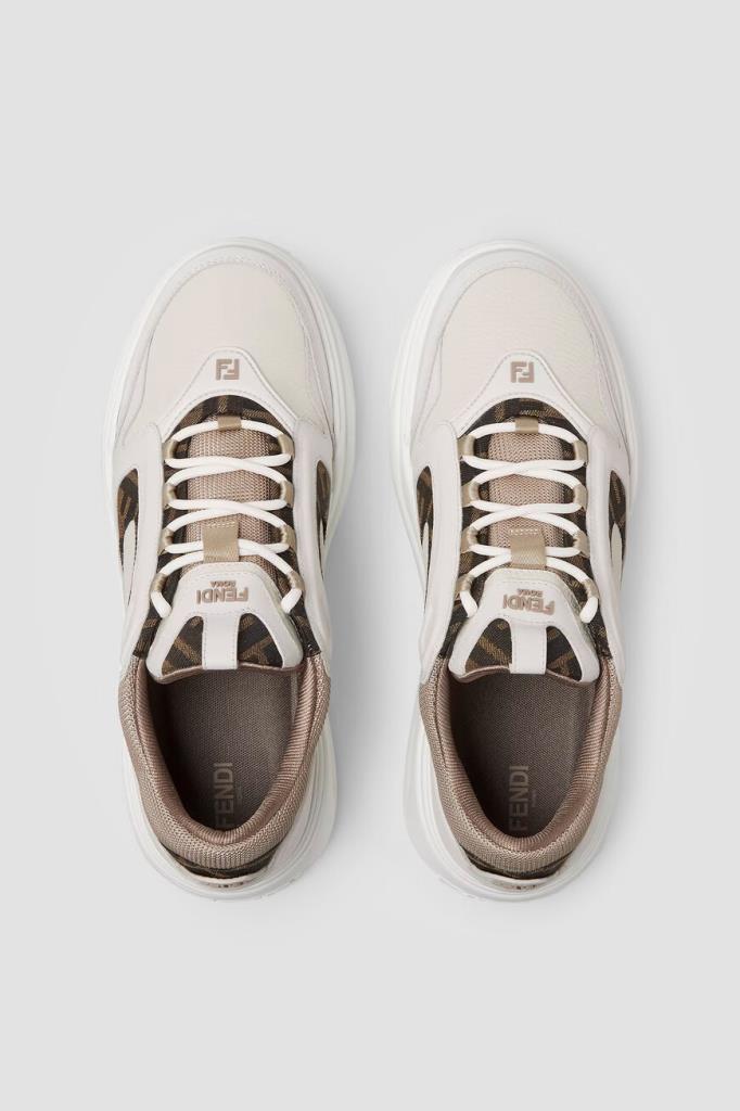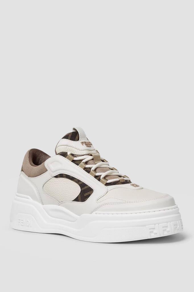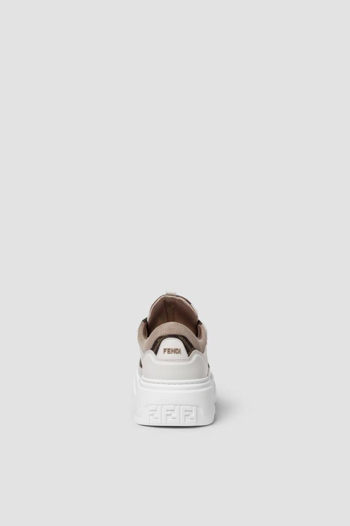 Сникеры Force со знаковой символикой Дома Fendi. Для изготовления модели с закрытой дизайнерской шнуровкой выбраны плотный сетчатый полиэстер коричневого оттенка, гладкая и зернистая телячья кожа белого цвета и детали из жаккарда с крупным двухцветным мотивом «FF», размещённые на язычке, уровне планки шнуровки, боковинах и в задней части. Лёгкая массивная подошва из каучука белого цвета украшена рельефными узором «FF» спереди и сзади и тональным логотипом сбоку.