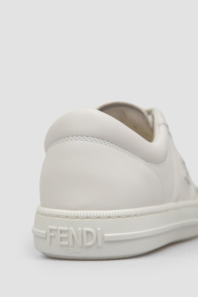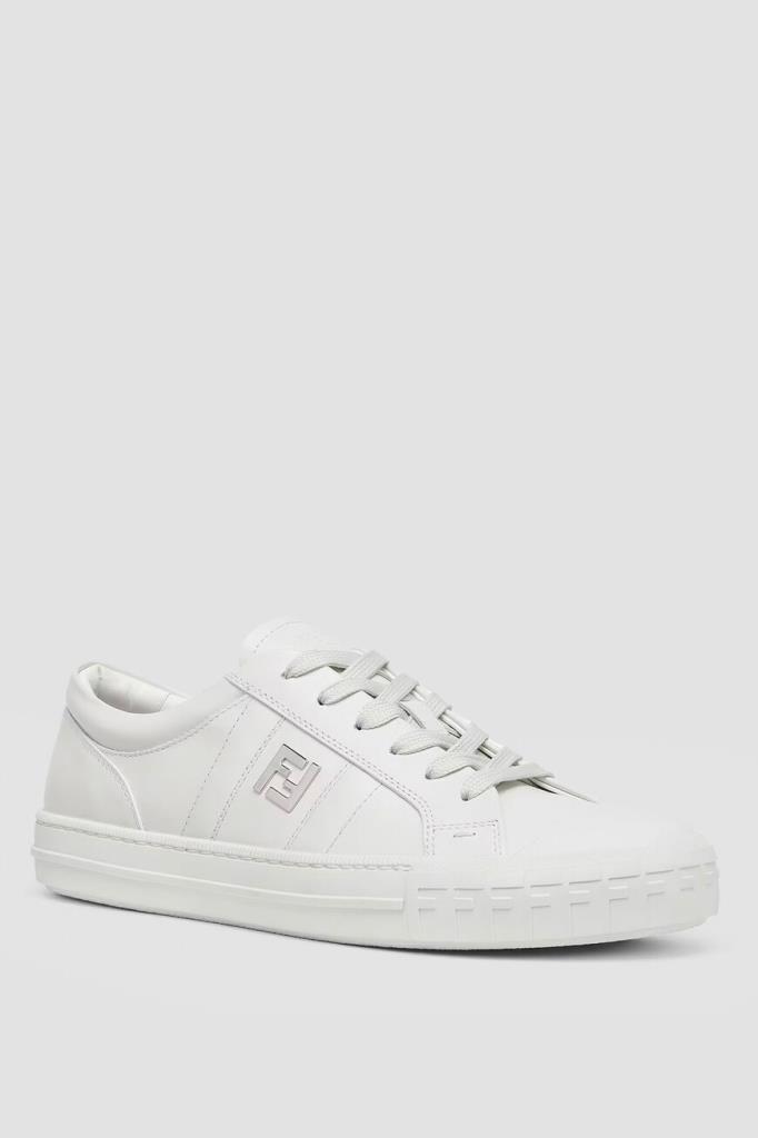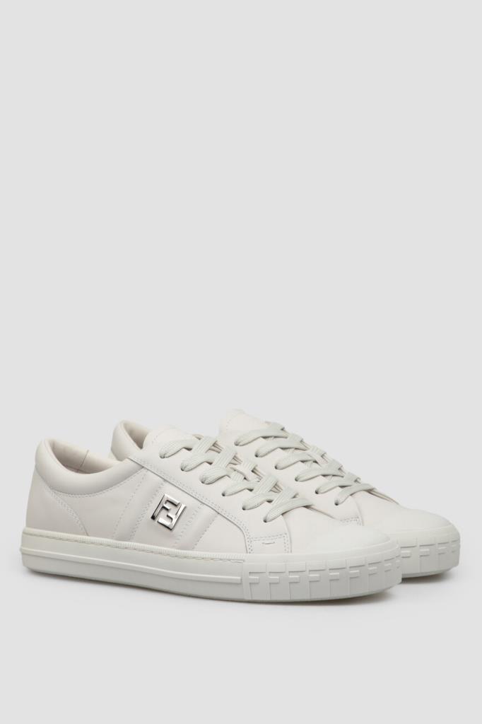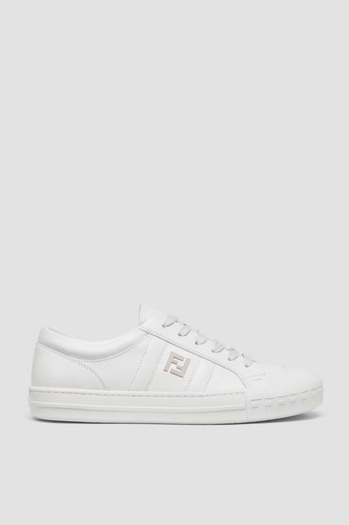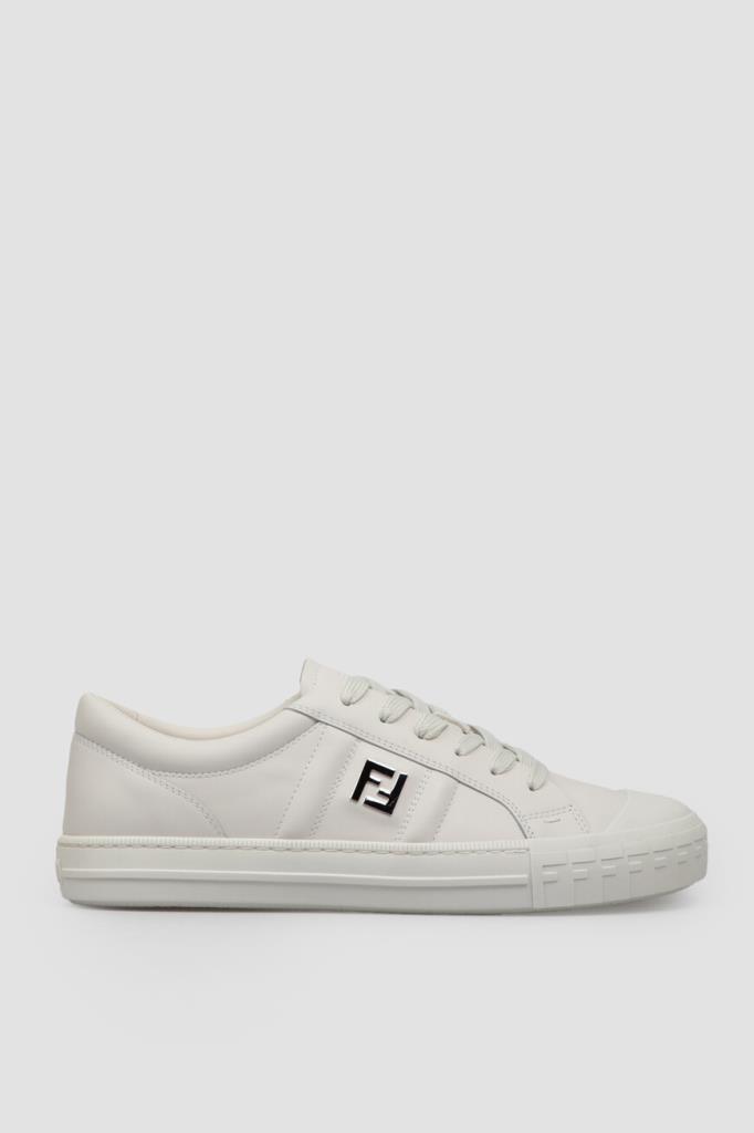 Кожаные сникеры Fendi Domino белого базового цвета. Конструкция удобной пары с гладкой текстурой предполагает наличие широкой колодки и открытого типа шнуровки. Плоская литая подошва из каучука декорирована рельефными полосами по бокам и легендарным повторяющимся мотивом «FF» в тон на носке. Отличительными деталями также являются крупная деталь «FF» из металла с палладиевым покрытием сбоку и тиснение на язычке.