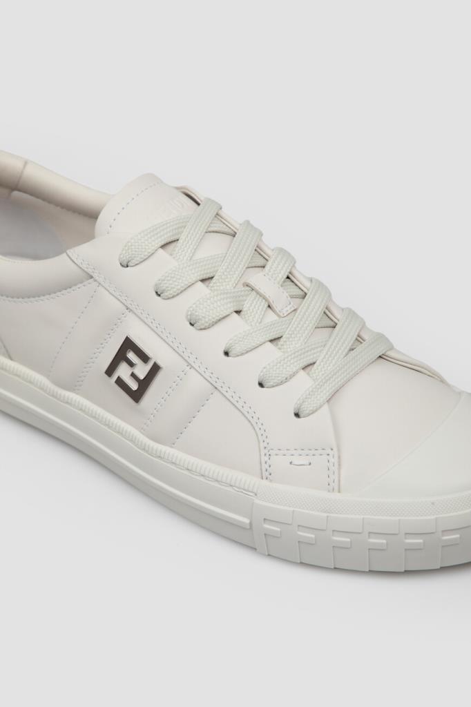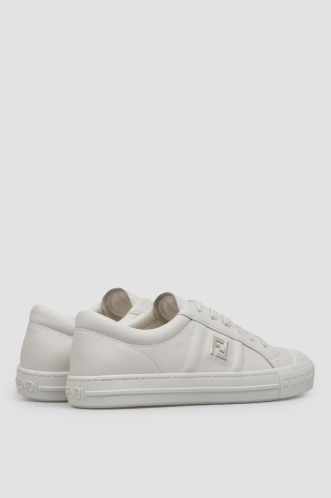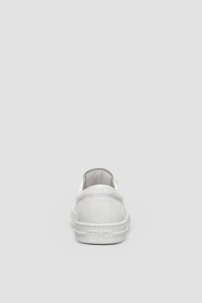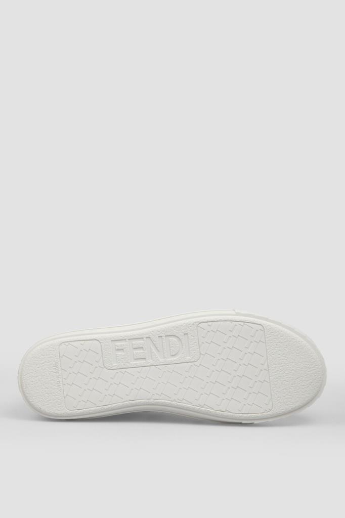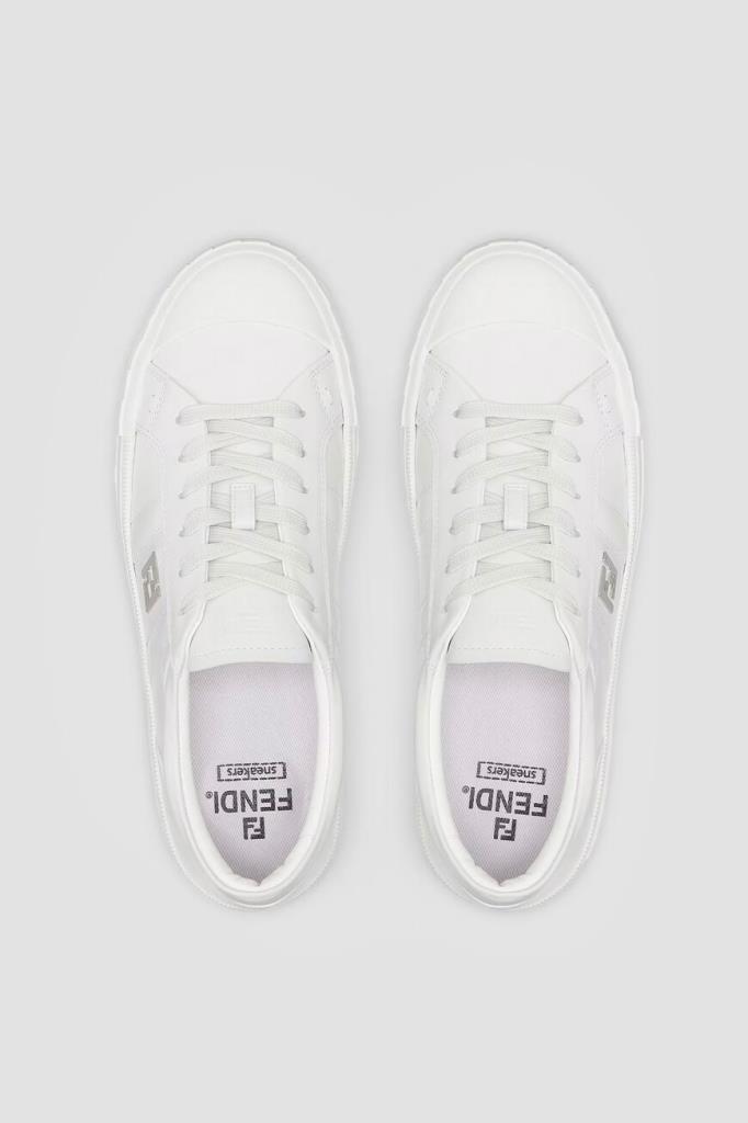 Кожаные сникеры Fendi Domino белого базового цвета. Конструкция удобной пары с гладкой текстурой предполагает наличие широкой колодки и открытого типа шнуровки. Плоская литая подошва из каучука декорирована рельефными полосами по бокам и легендарным повторяющимся мотивом «FF» в тон на носке. Отличительными деталями также являются крупная деталь «FF» из металла с палладиевым покрытием сбоку и тиснение на язычке.