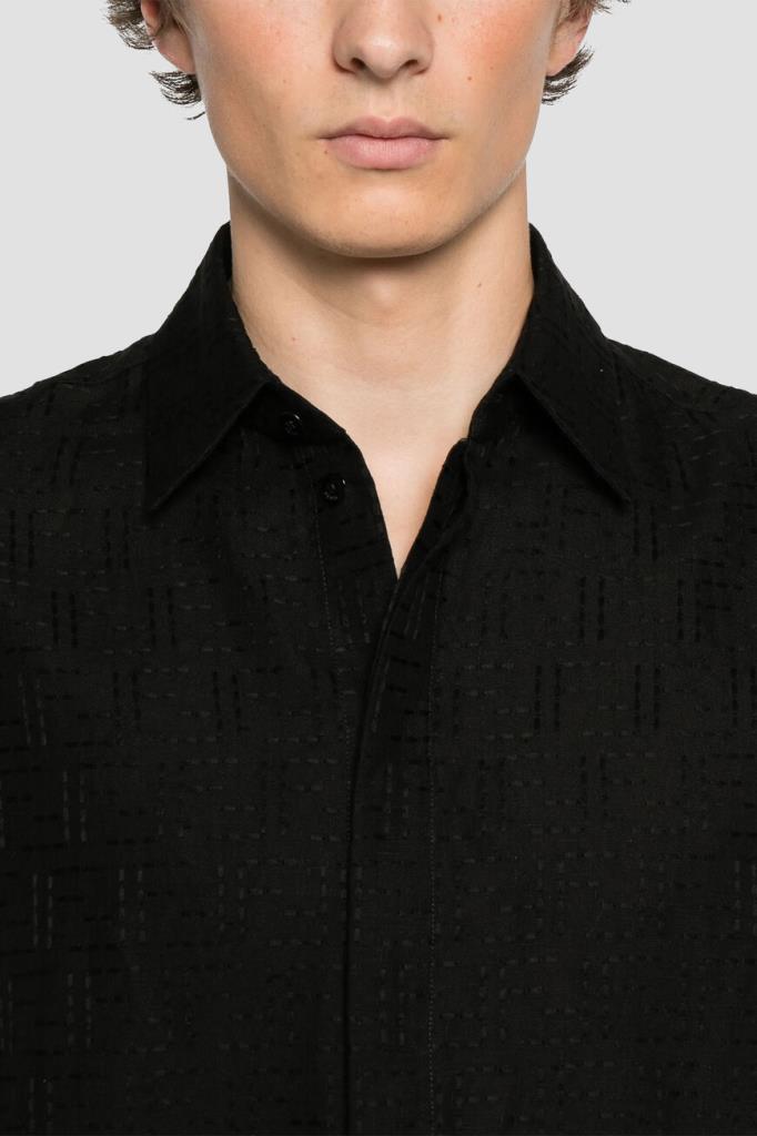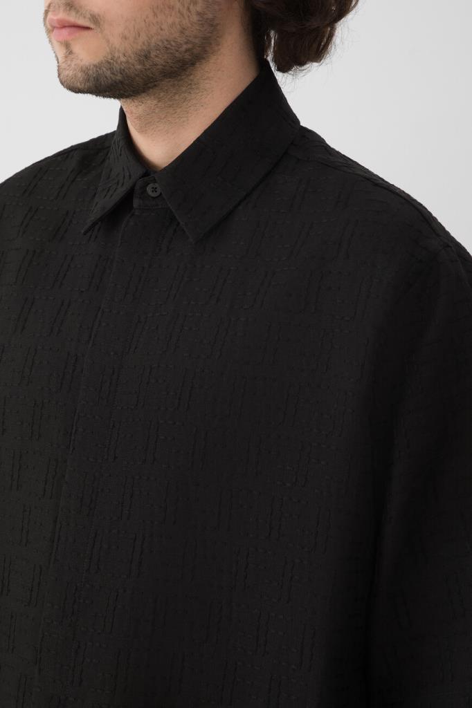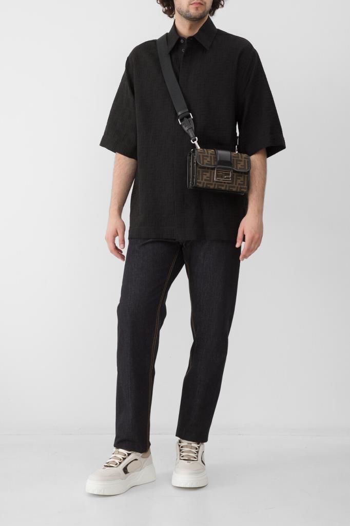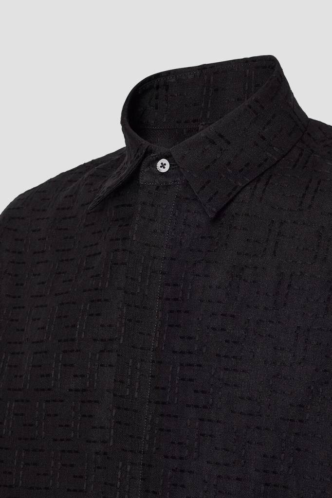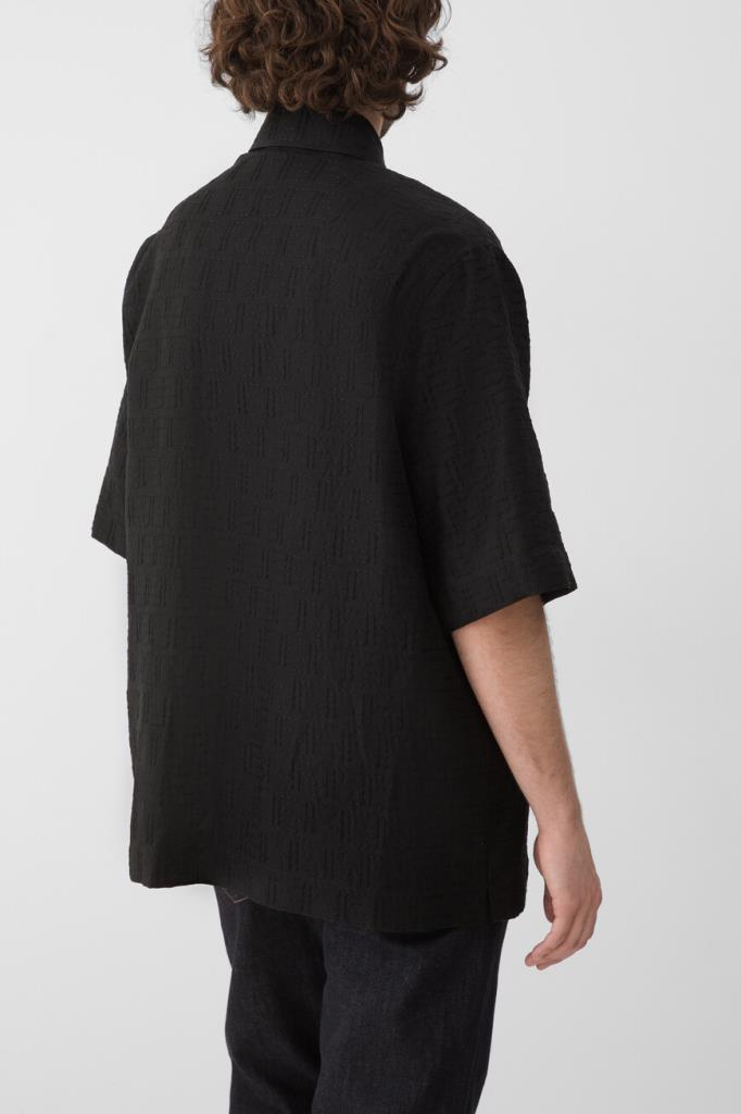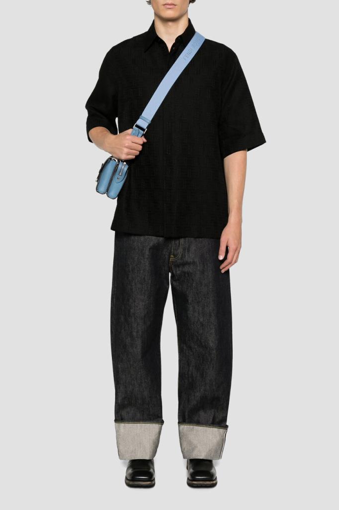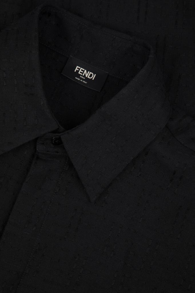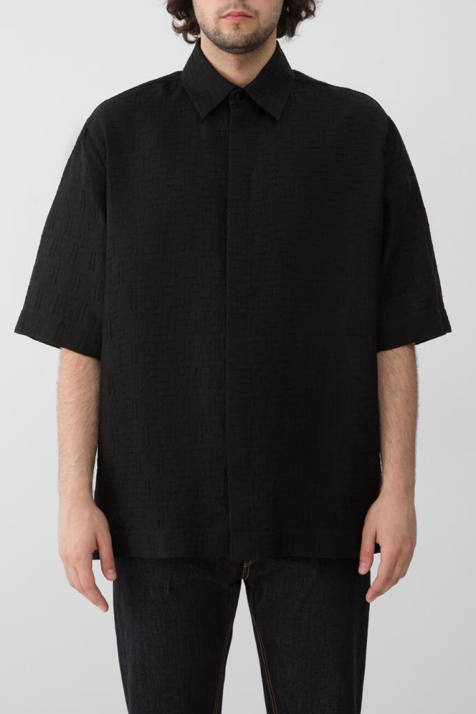 Брендированная рубашка Fendi с короткими рукавами. Для создания изделия силуэта оверсайз выбран мягкий жаккард на основе хлопка и льна чёрного цвета с вышитым геометрическим мотивом «FF» в тон. Лёгкая модель застёгивается на перламутровые пуговицы, покрытые планкой, и сочетается с другими предметами сезонного гардероба.