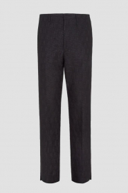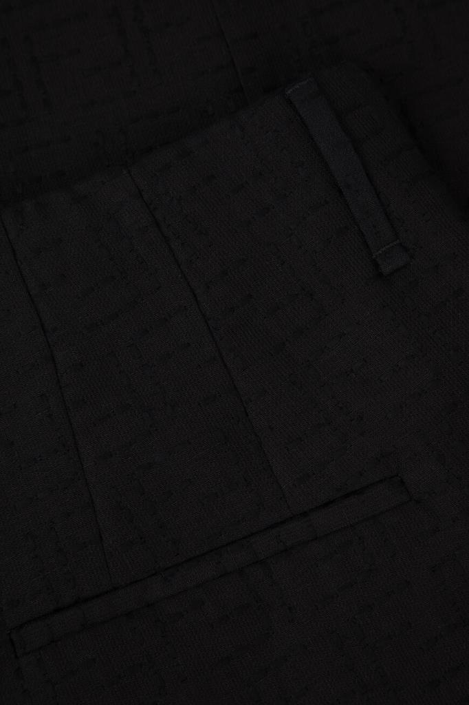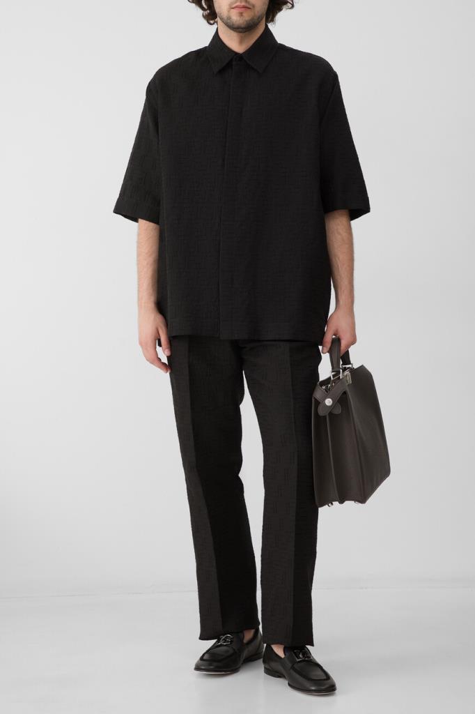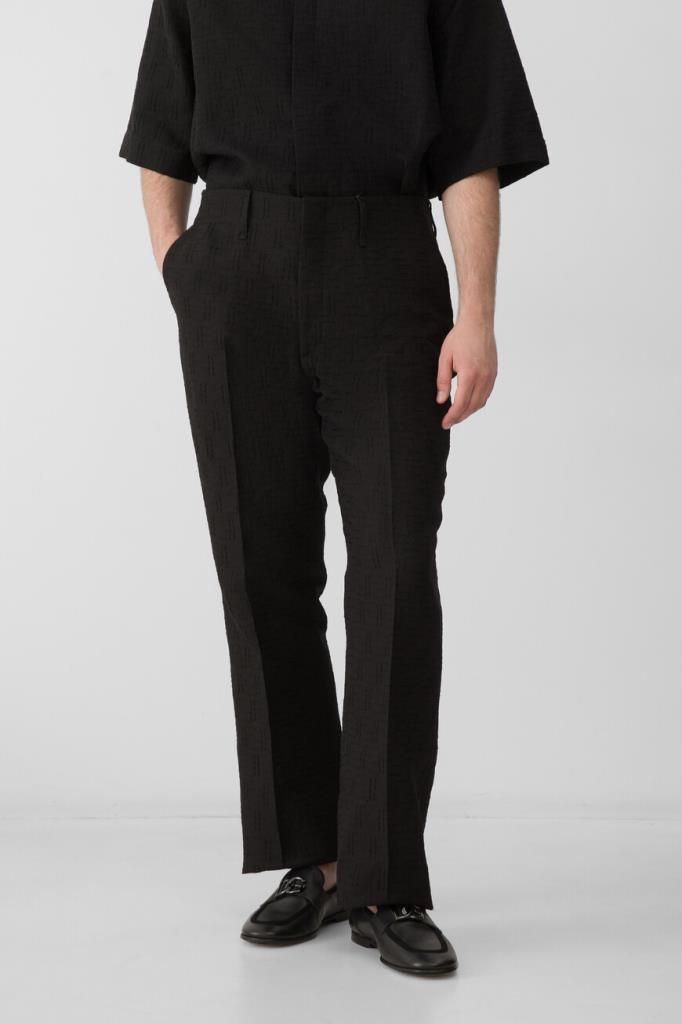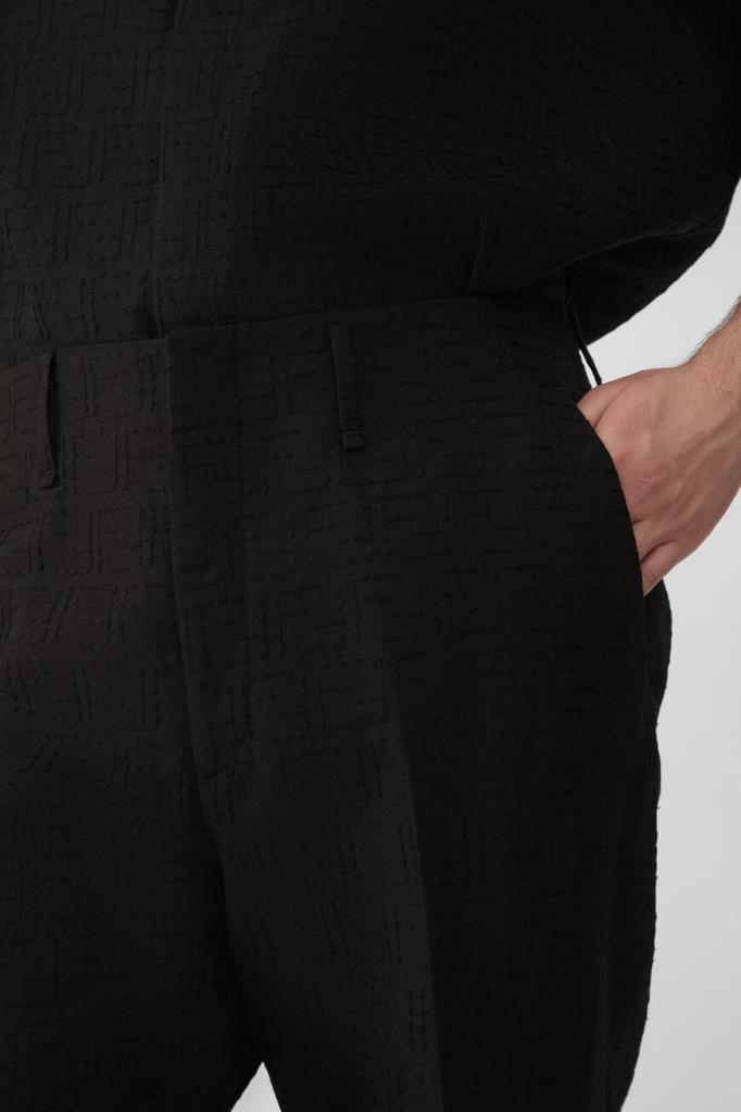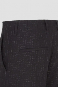 Дизайнерские брюки Fendi с классическими заутюженными складками. Для изготовления прямой модели выбран плотный жаккард на основе хлопка и льна чёрного цвета с культовой тональной вышивкой в виде логотипа «FF». Изделие застёгивается на потайную молнию и крючок с планкой и с лёгкостью сочетается с другими предметами гардероба в стиле smart casual.
