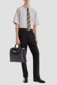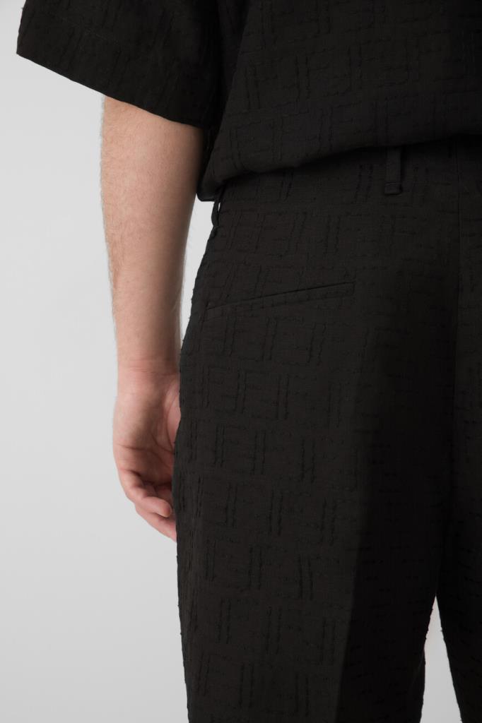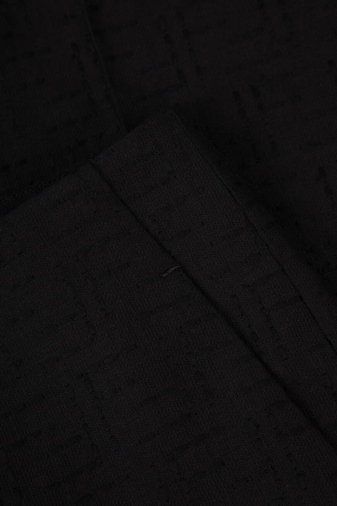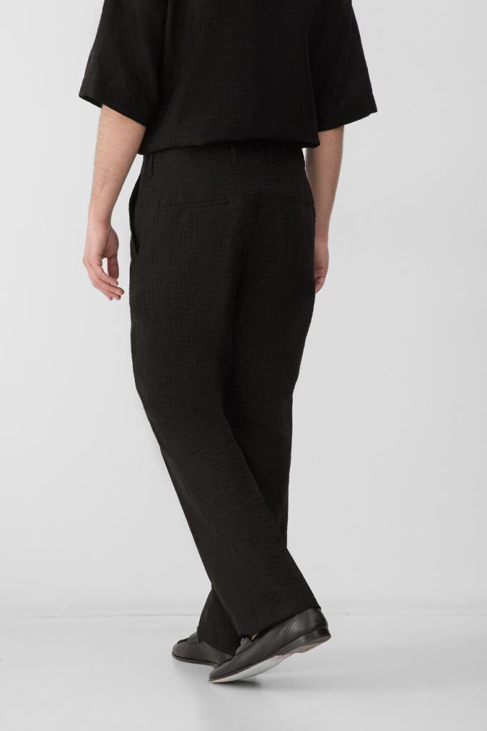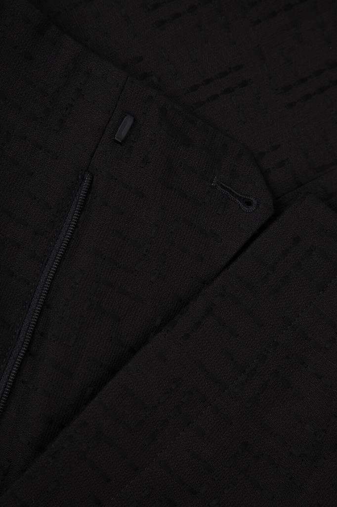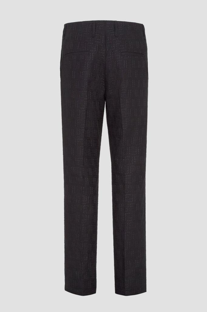 Дизайнерские брюки Fendi с классическими заутюженными складками. Для изготовления прямой модели выбран плотный жаккард на основе хлопка и льна чёрного цвета с культовой тональной вышивкой в виде логотипа «FF». Изделие застёгивается на потайную молнию и крючок с планкой и с лёгкостью сочетается с другими предметами гардероба в стиле smart casual.