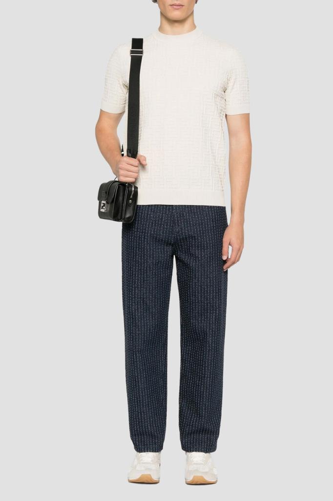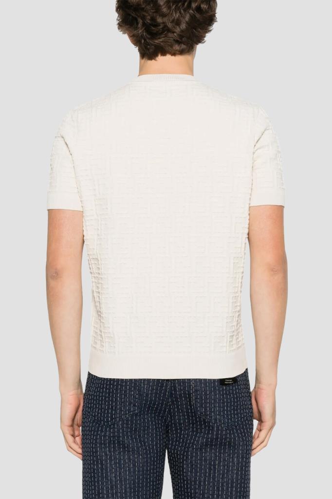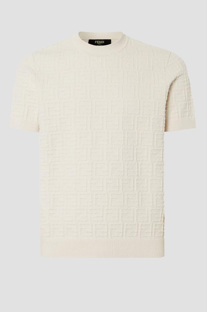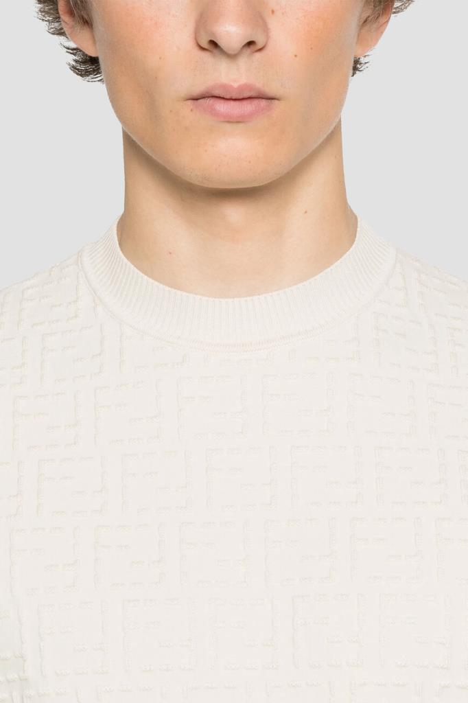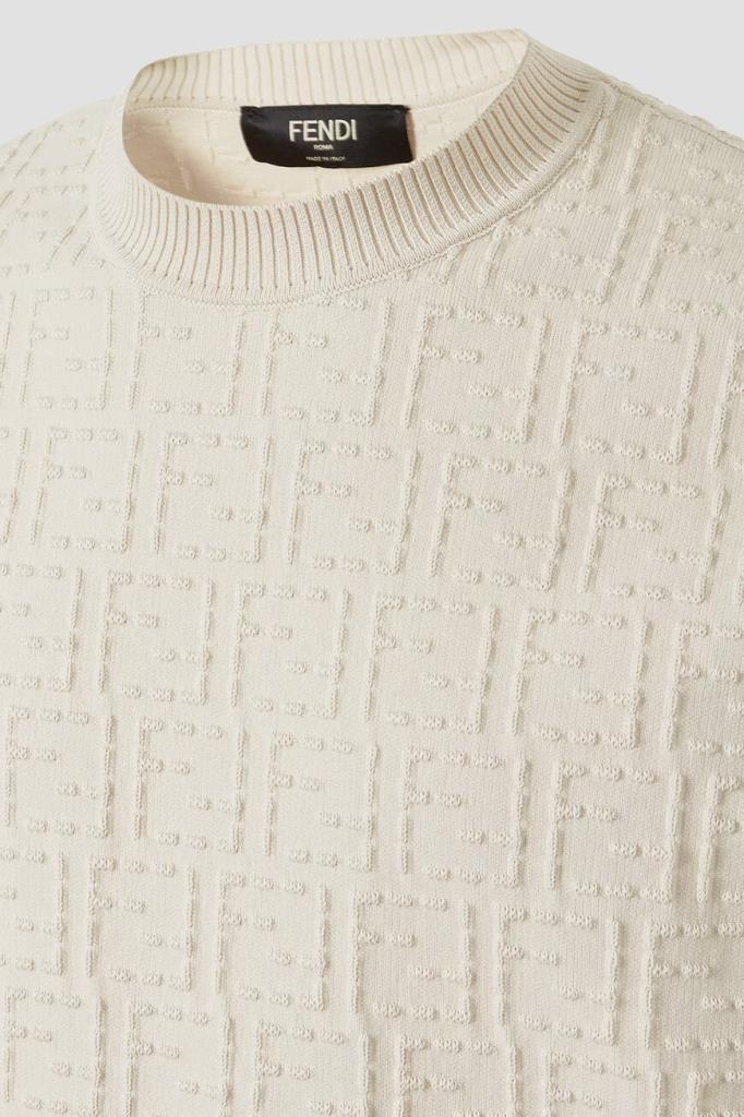 Светло-бежевый пуловер с культовой тональной символикой бренда Fendi. Модель изготовлена из мягкого трикотажа на основе хлопка и прочного нейлона. Поверхность изделия украшена рельефным геометрическим мотивом «FF» в крупном начертании, выполненном в виде легендарных стежков Selleria.