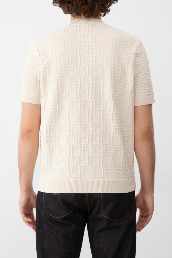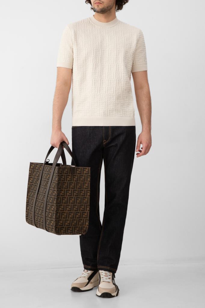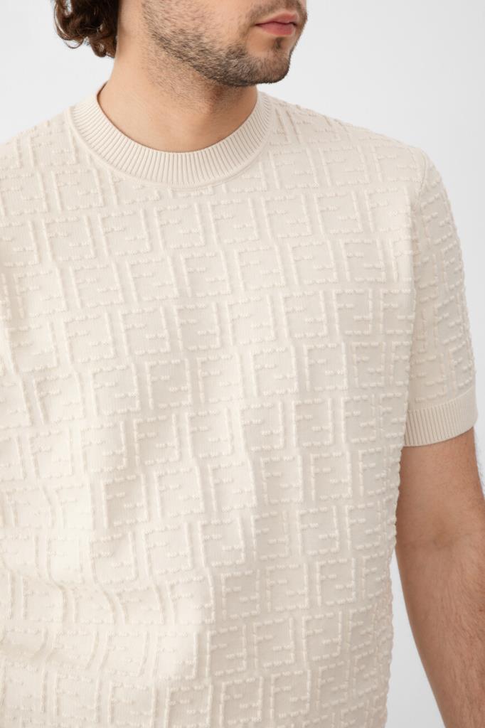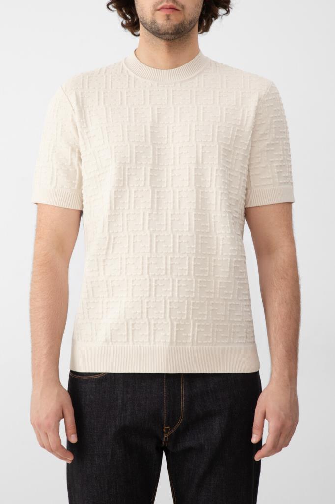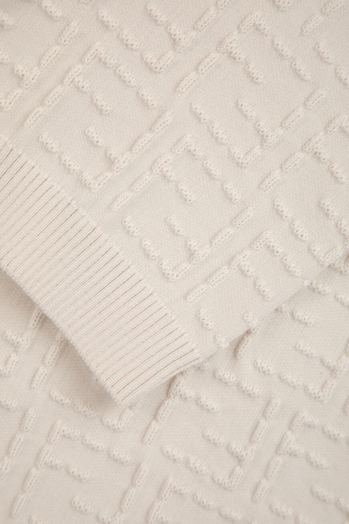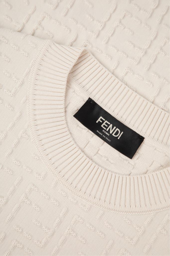 Светло-бежевый пуловер с культовой тональной символикой бренда Fendi. Модель изготовлена из мягкого трикотажа на основе хлопка и прочного нейлона. Поверхность изделия украшена рельефным геометрическим мотивом «FF» в крупном начертании, выполненном в виде легендарных стежков Selleria.