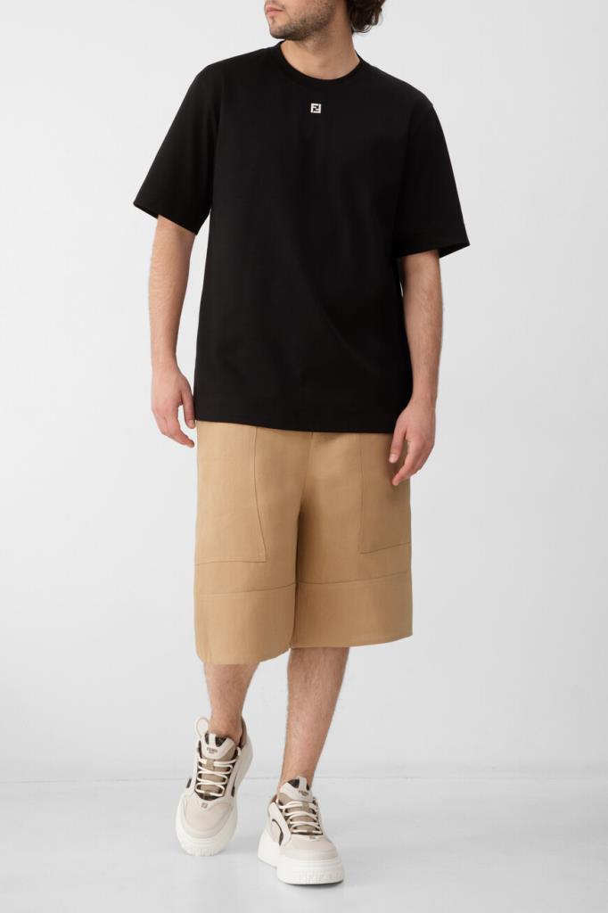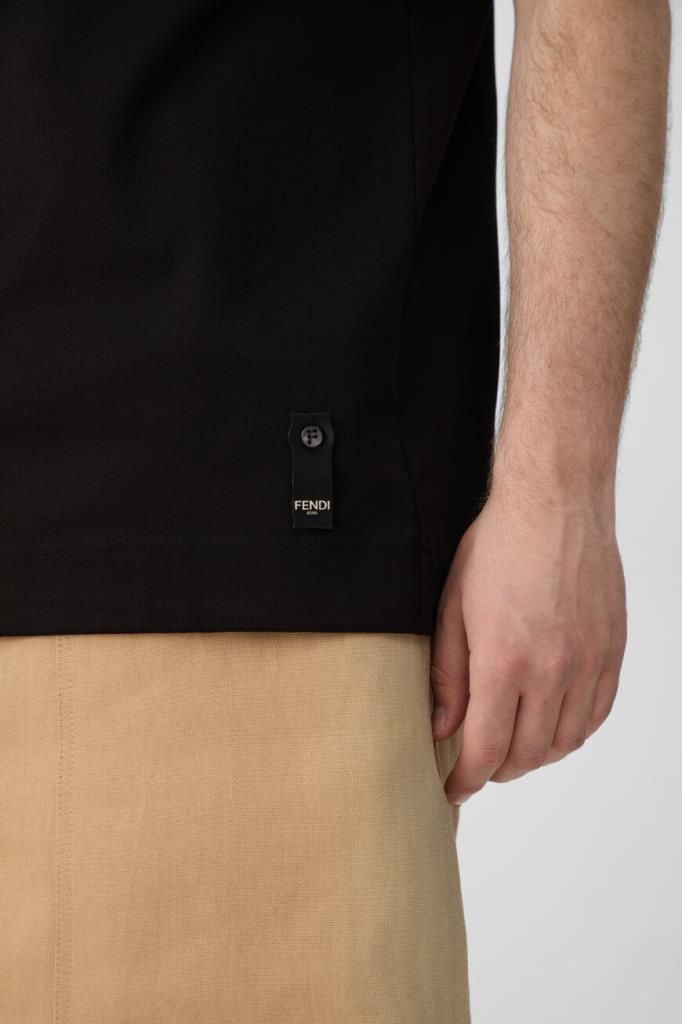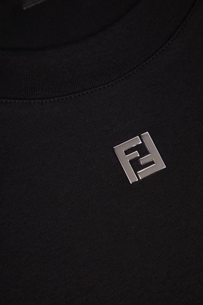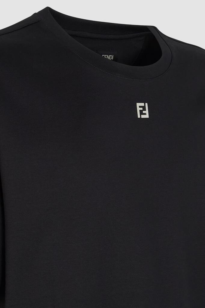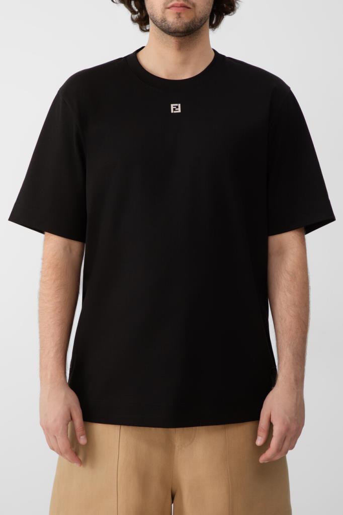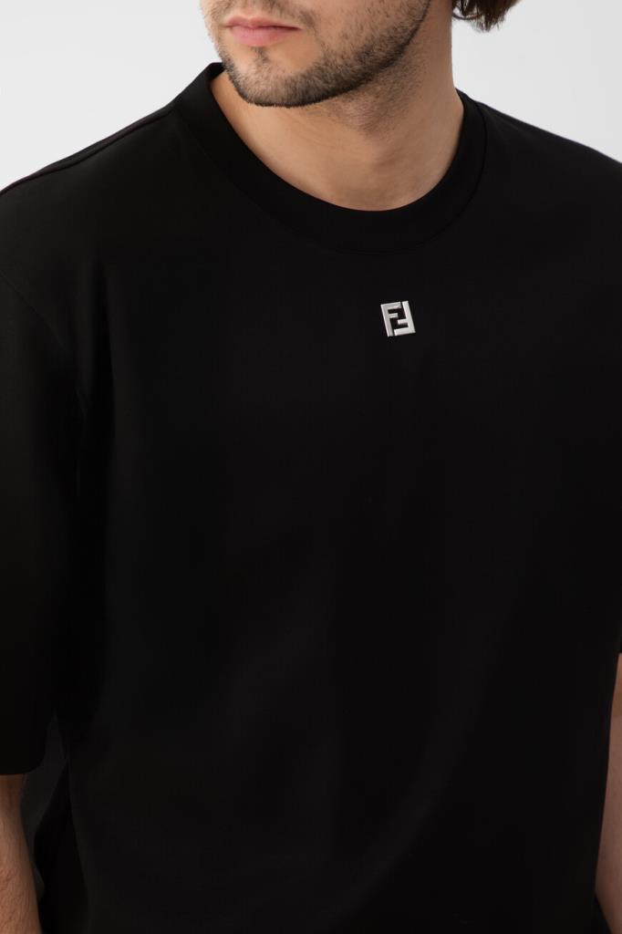 Хлопковая футболка Fendi силуэта oversize. Изделие выполнено из джерси чёрного базового цвета средней плотности и украшено неброской аббревиатурой «FF» с палладиевой отделкой. Конструкция повседневной модели характеризуется наличием круглого выреза горловины, оформленного резинкой.