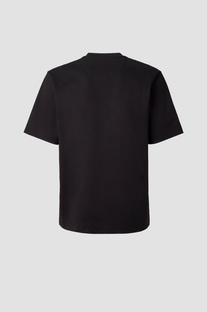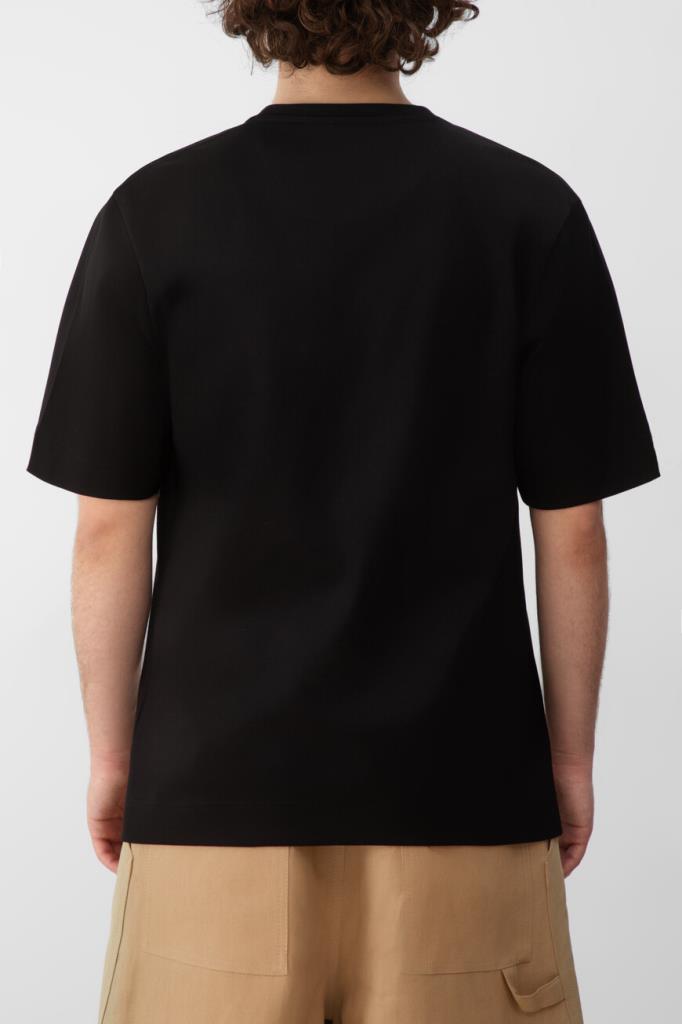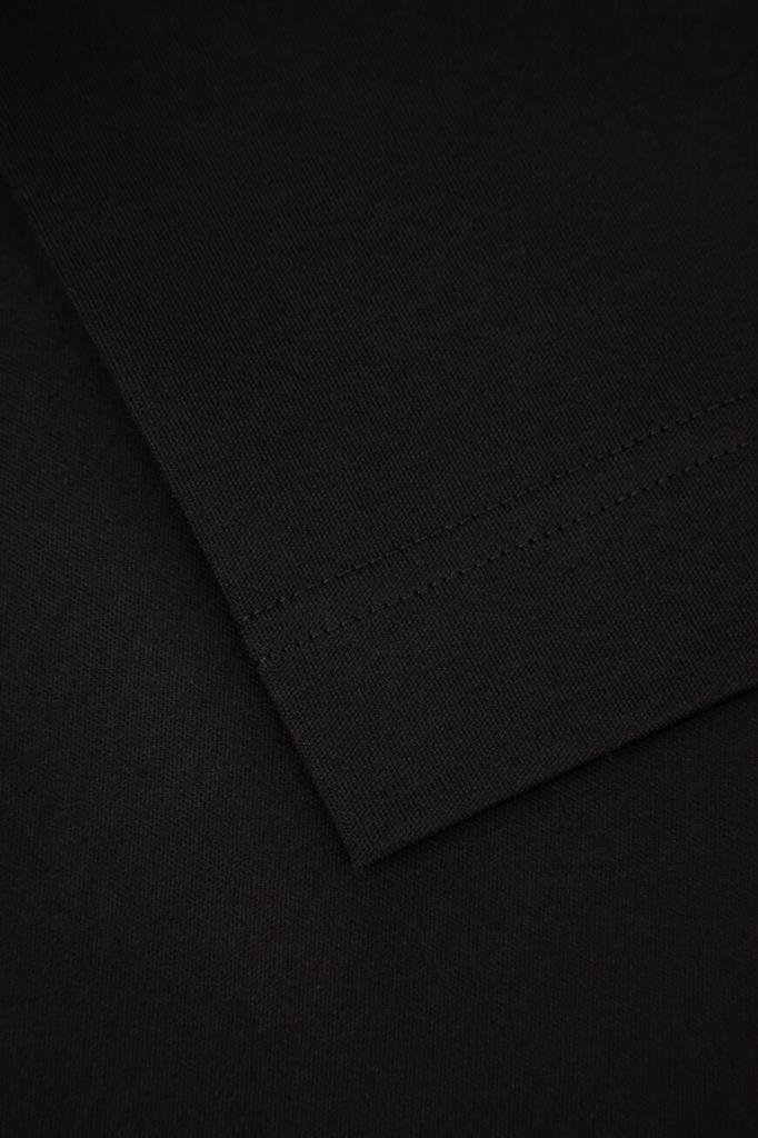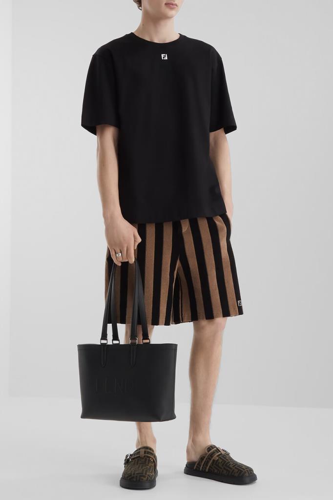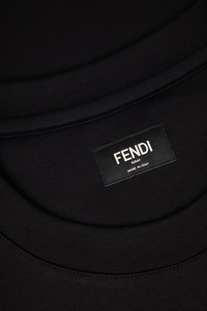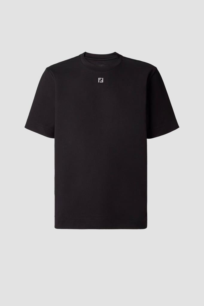 Хлопковая футболка Fendi силуэта oversize. Изделие выполнено из джерси чёрного базового цвета средней плотности и украшено неброской аббревиатурой «FF» с палладиевой отделкой. Конструкция повседневной модели характеризуется наличием круглого выреза горловины, оформленного резинкой.