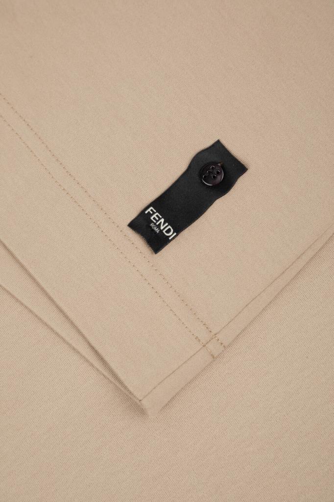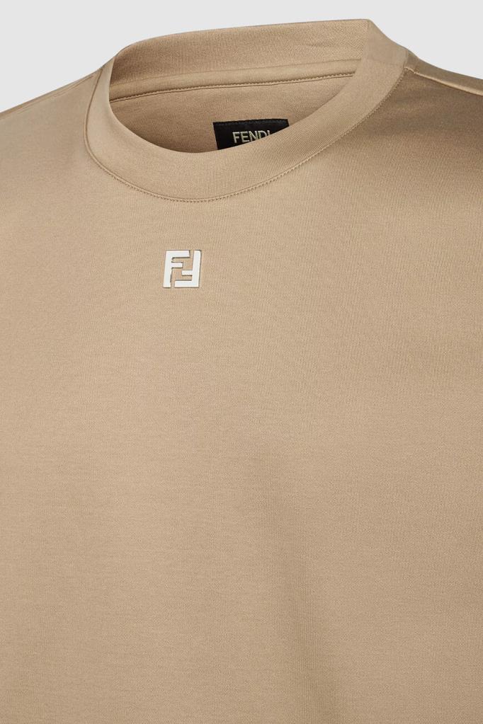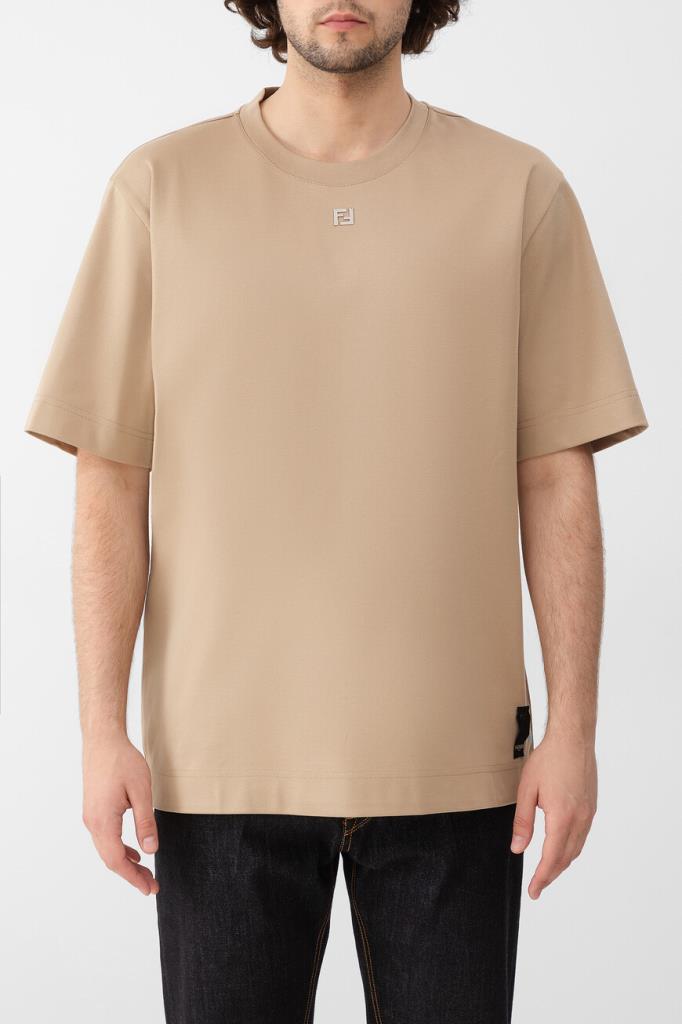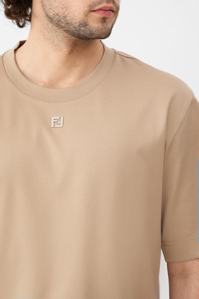 Футболка бежевого оттенка от бренда Fendi. Для производства изделия силуэта оверсайз выбрано хлопковое джерси средней плотности. Роль знакового декора передана неброской аббревиатуре «FF» с палладиевой отделкой, размещённой спереди. Модель с круглым вырезом горловины на резинке станет основой Ваших повседневных и спортивных комплектов.