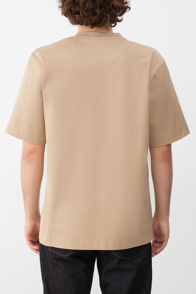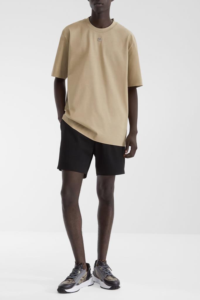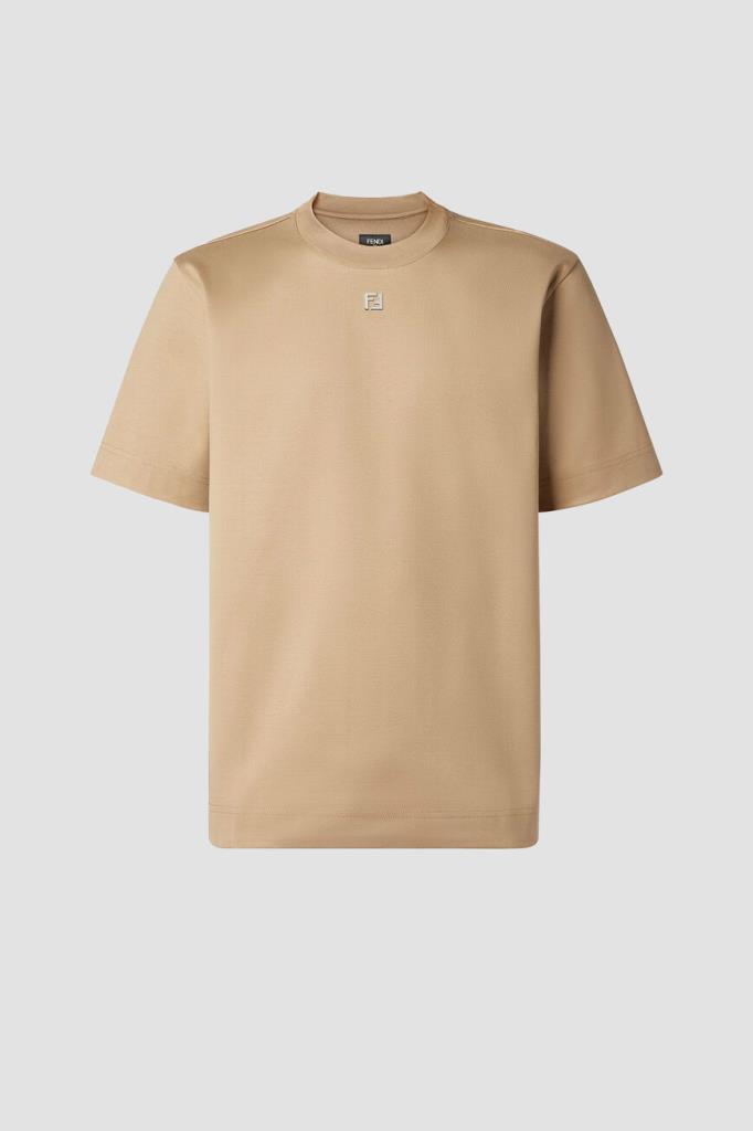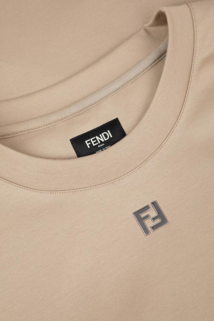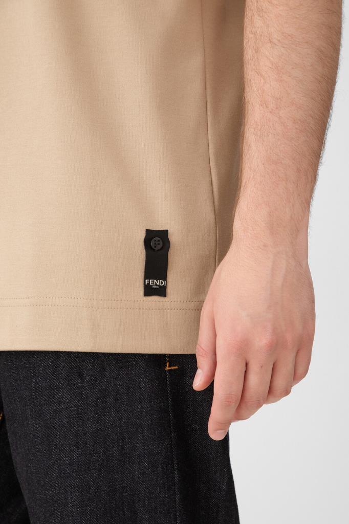 Футболка бежевого оттенка от бренда Fendi. Для производства изделия силуэта оверсайз выбрано хлопковое джерси средней плотности. Роль знакового декора передана неброской аббревиатуре «FF» с палладиевой отделкой, размещённой спереди. Модель с круглым вырезом горловины на резинке станет основой Ваших повседневных и спортивных комплектов.