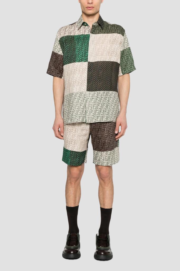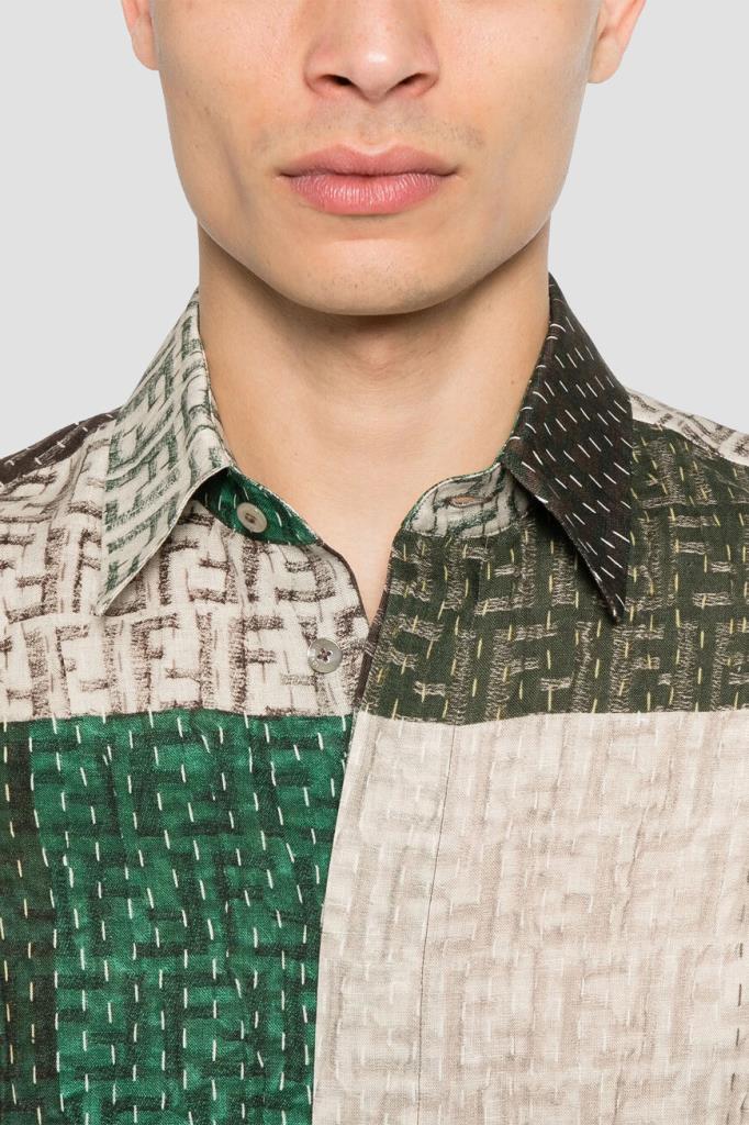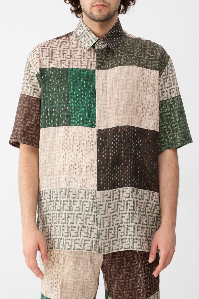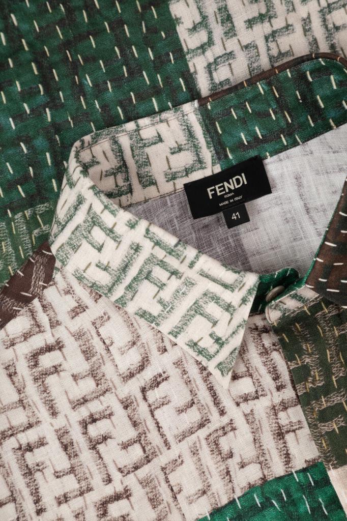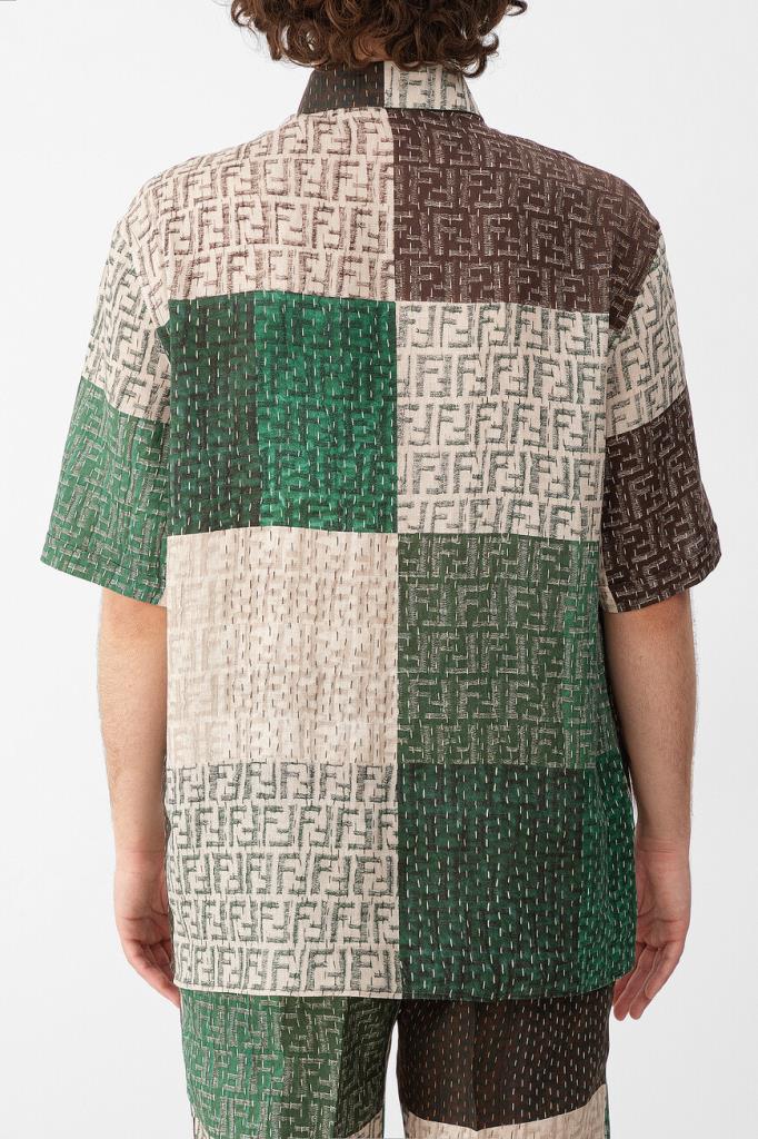 Льняная рубашка Fendi с геометрическим мотивом в виде логотипа «FF». Изделие из лёгкой неэластичной ткани выполнено в технике пэчворк в светло-бежевом, тёмно-коричневом и зелёных тонах. Модель отличается наличием коротких рукавов с подворотами и застёжкой на брендированные перламутровые пуговицы, покрытые планкой, спереди.