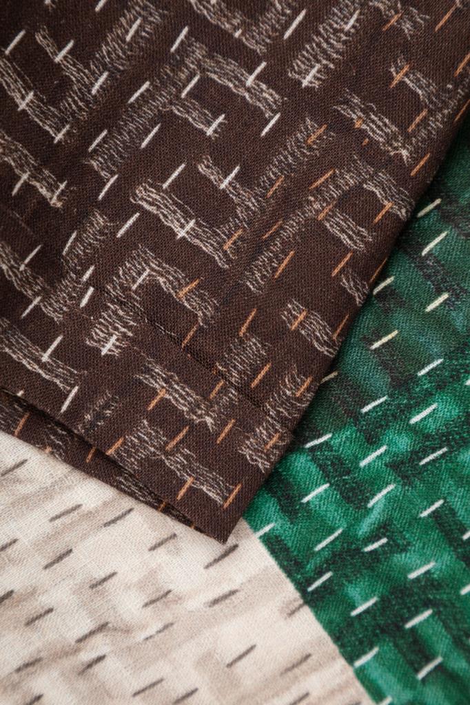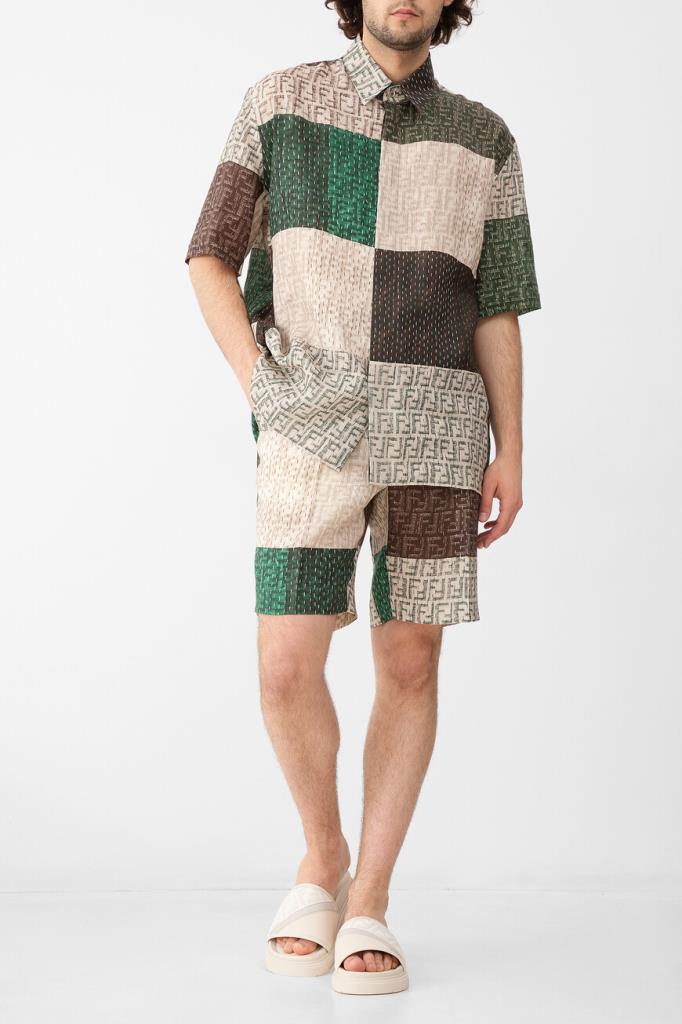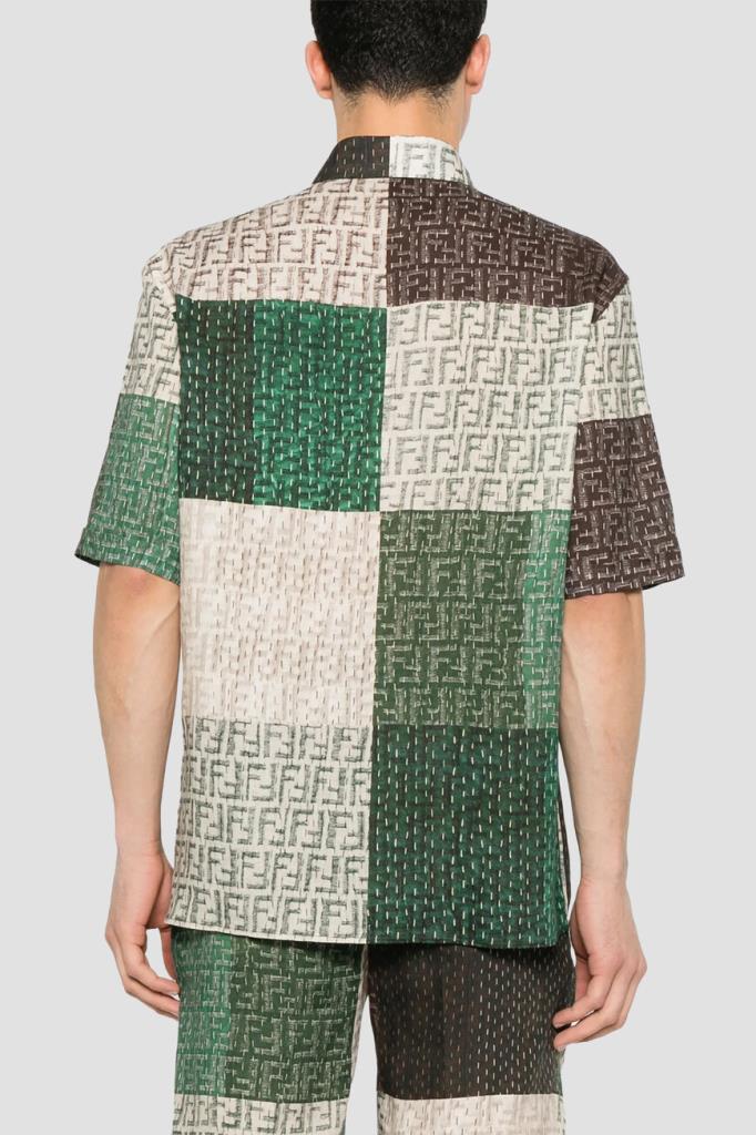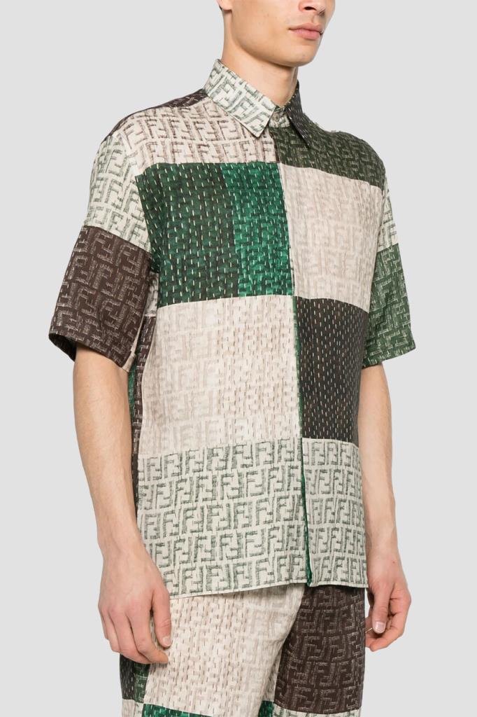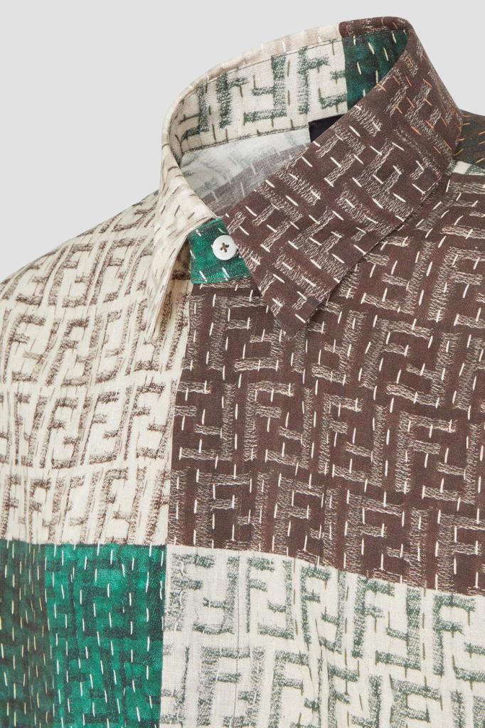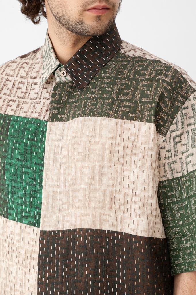 Льняная рубашка Fendi с геометрическим мотивом в виде логотипа «FF». Изделие из лёгкой неэластичной ткани выполнено в технике пэчворк в светло-бежевом, тёмно-коричневом и зелёных тонах. Модель отличается наличием коротких рукавов с подворотами и застёжкой на брендированные перламутровые пуговицы, покрытые планкой, спереди.