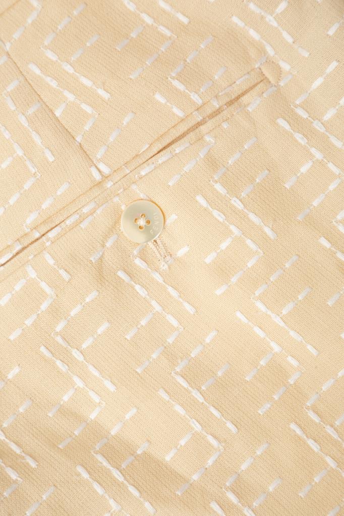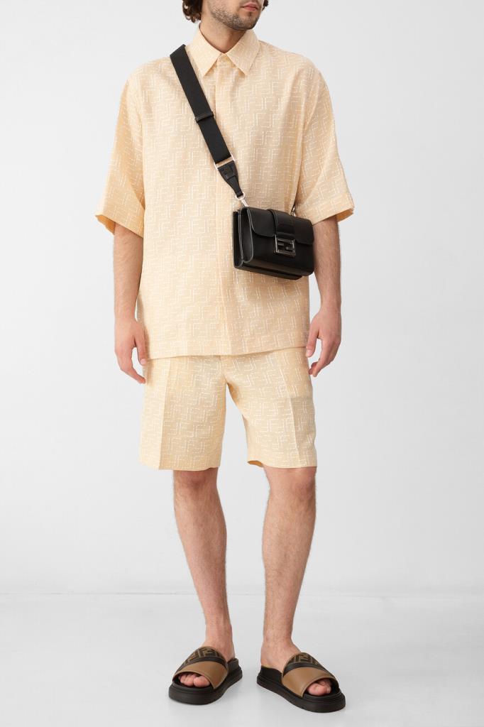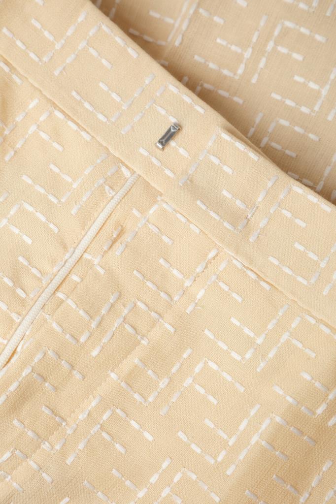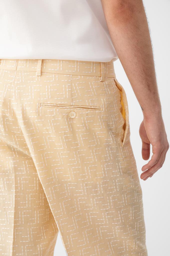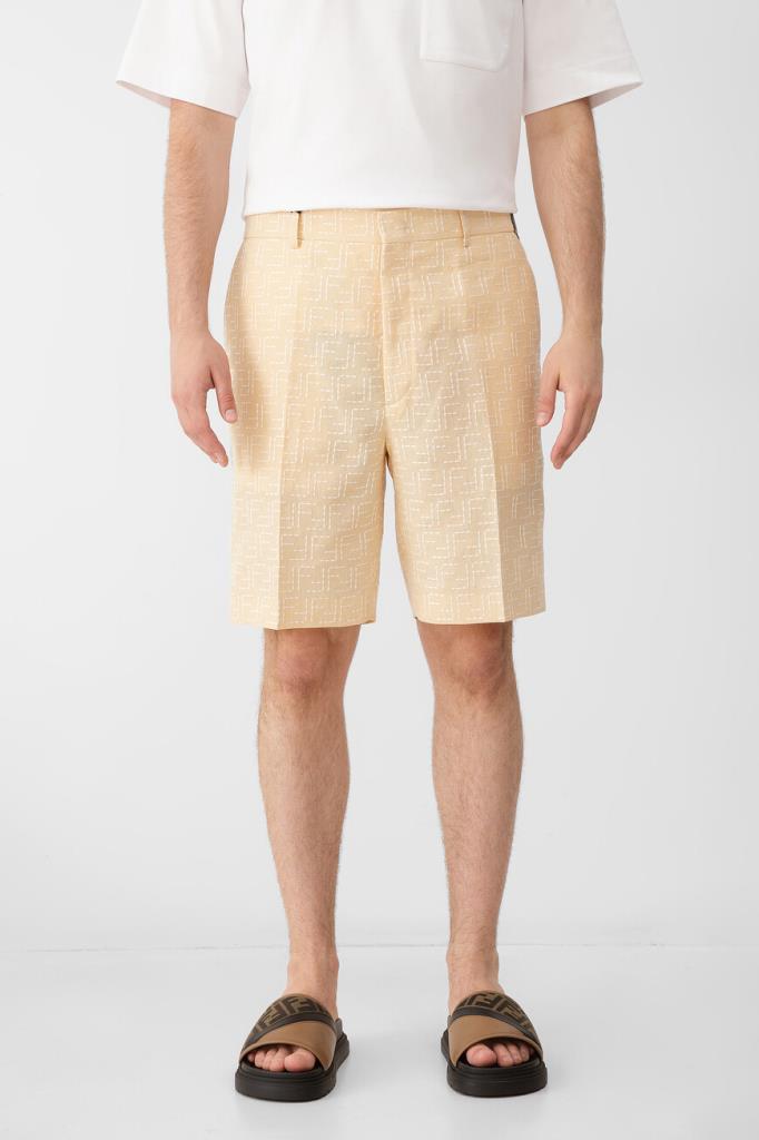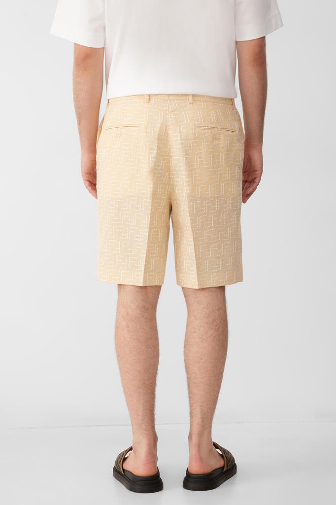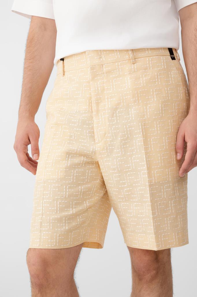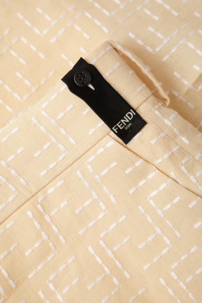 Прямые бермуды Fendi сливочного оттенка. Конструкция повседневной модели, выполненной из мягкого неэластичного жаккарда на основе хлопка и льна средней плотности, предполагает наличие плотного пояса со шлевками под ремень, классических стрелок и четырёх прорезных карманов. Особенностями изделия стали белый геометрический узор «FF» и наличие чёрной брендированной вставки-петли на роговой пуговице слева.
